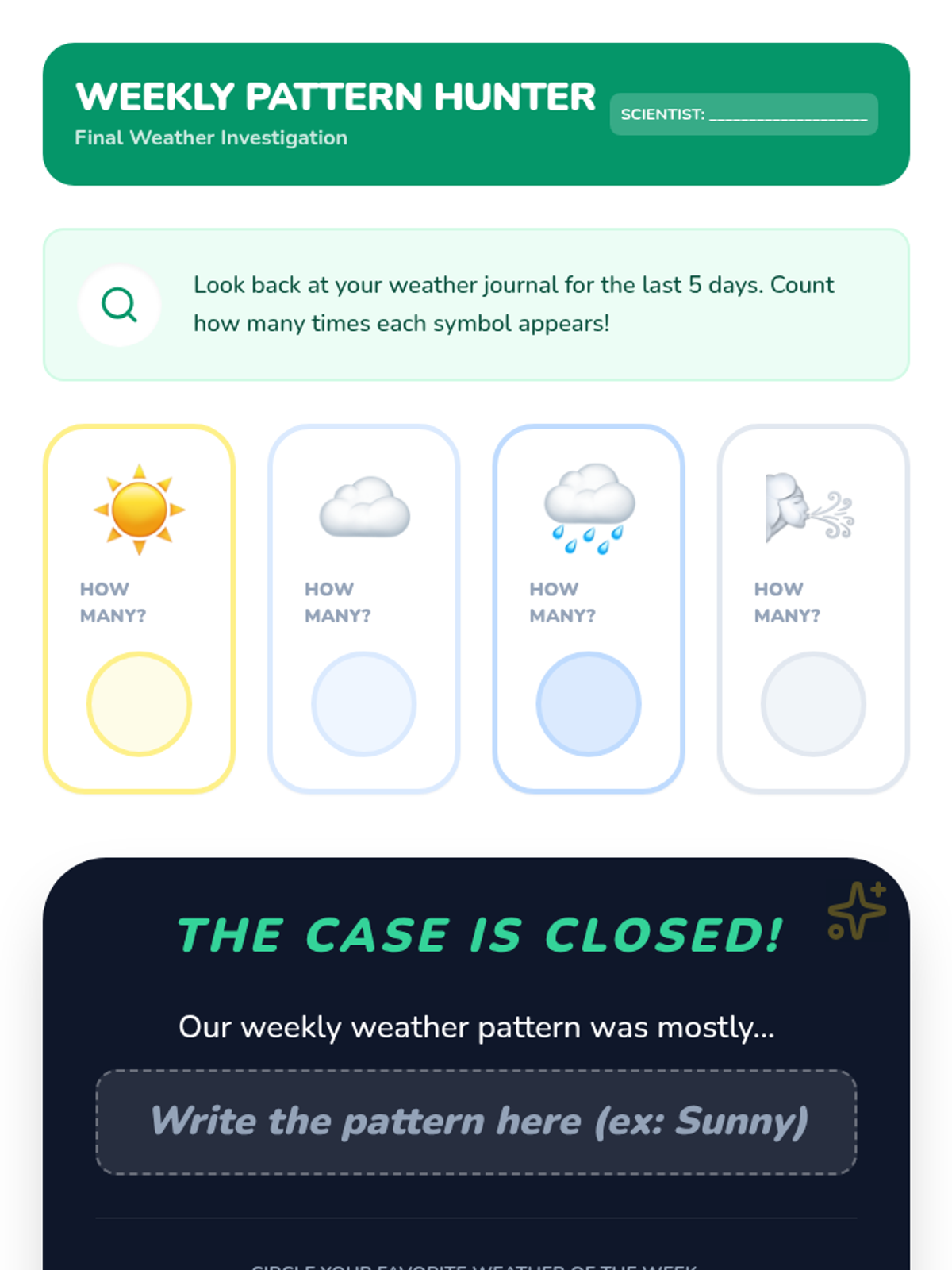 Students analyze a week's worth of collected data to identify patterns and determine the most common weather types.