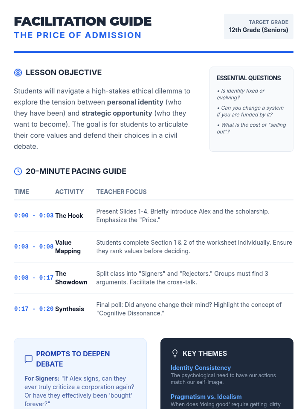 A high-stakes ethical dilemma for 12th graders exploring the intersection of personal identity, core values, and professional ambition. Students will debate the choice between a prestigious opportunity and their established public principles.