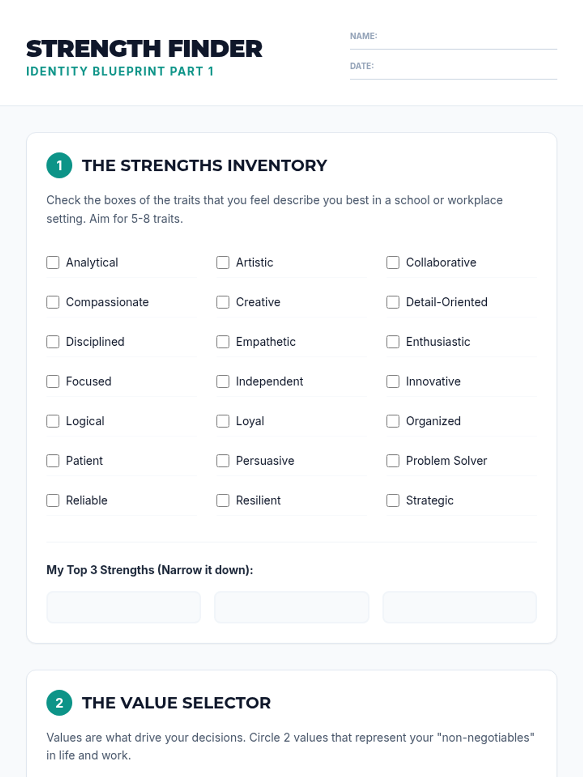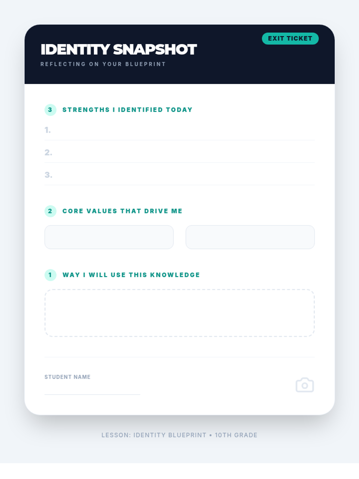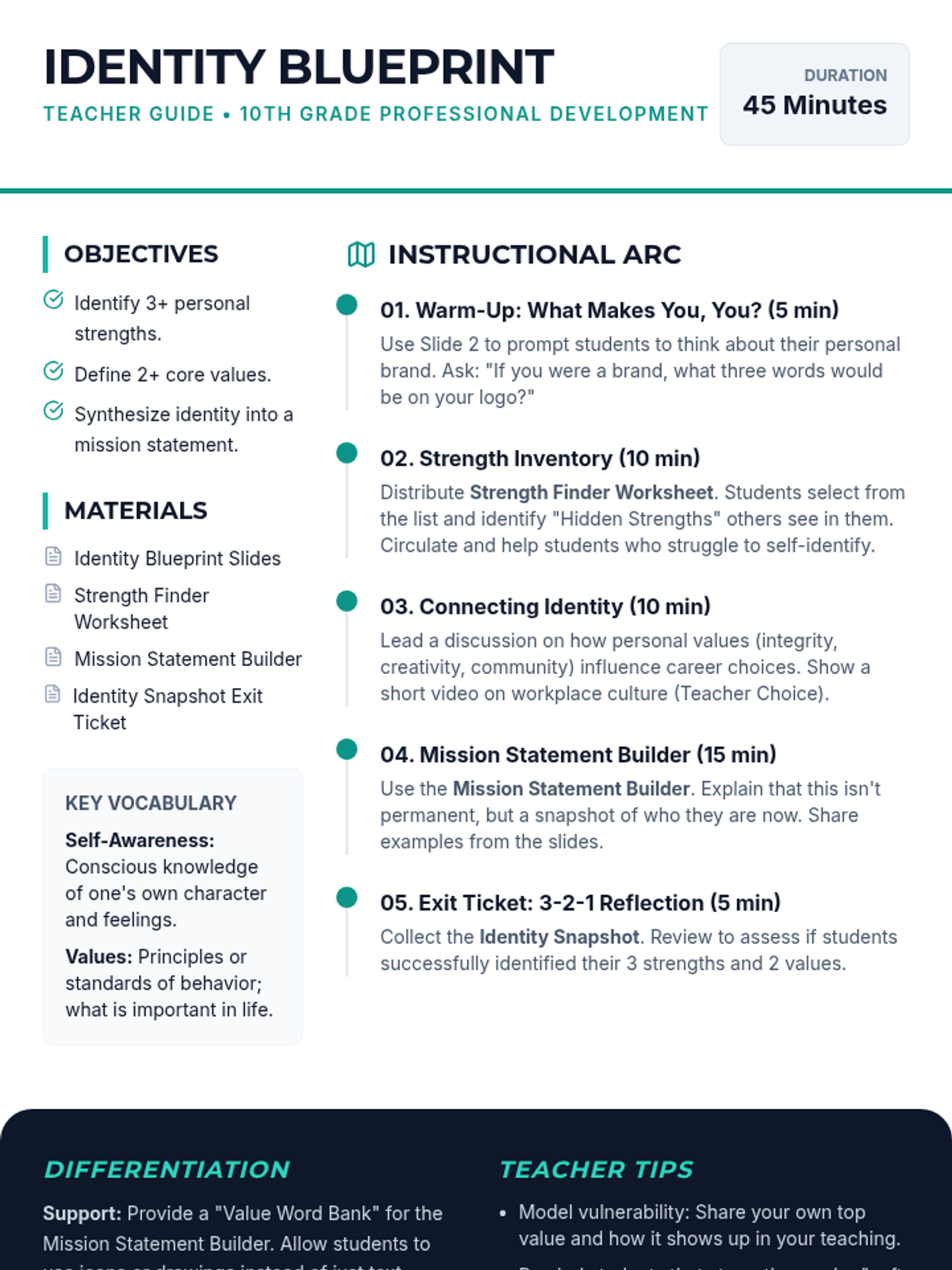 A lesson designed to help 10th-grade students explore their personal strengths and core values to build self-awareness for future professional paths. Students will identify key traits, participate in identity discussions, and craft a personal mission statement.