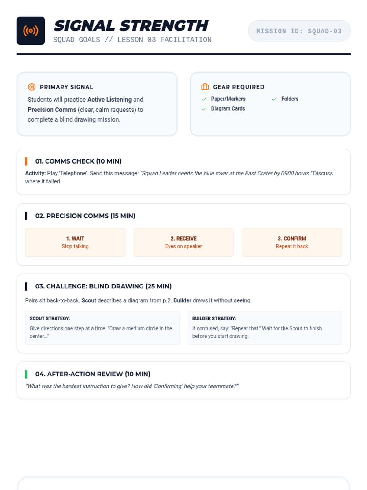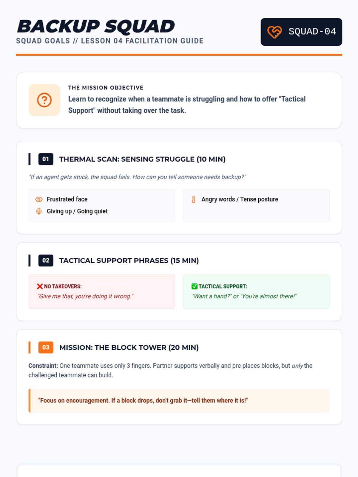 Teaches students how to encourage teammates and offer help when someone is struggling.