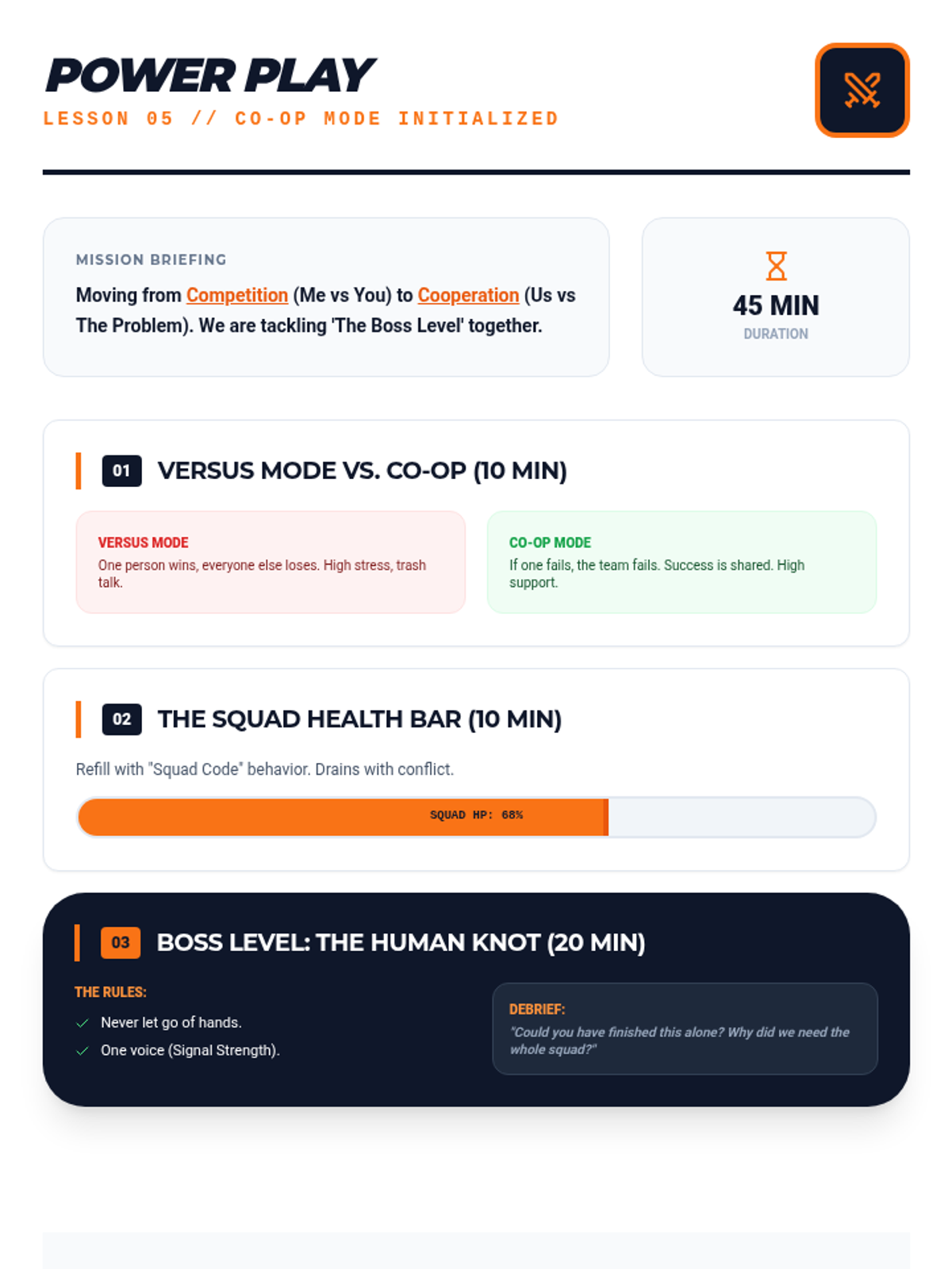 A final collaborative challenge where students apply all learned skills to earn their 'Master Teammate' status.