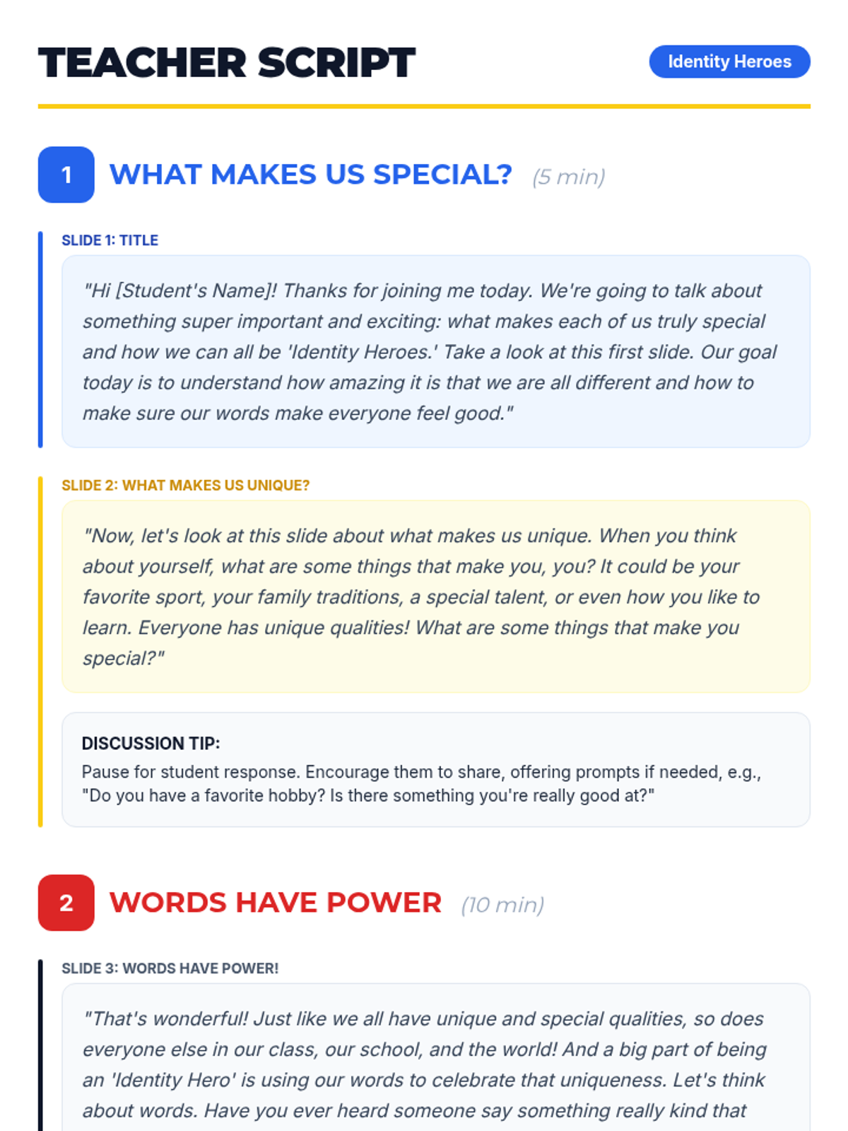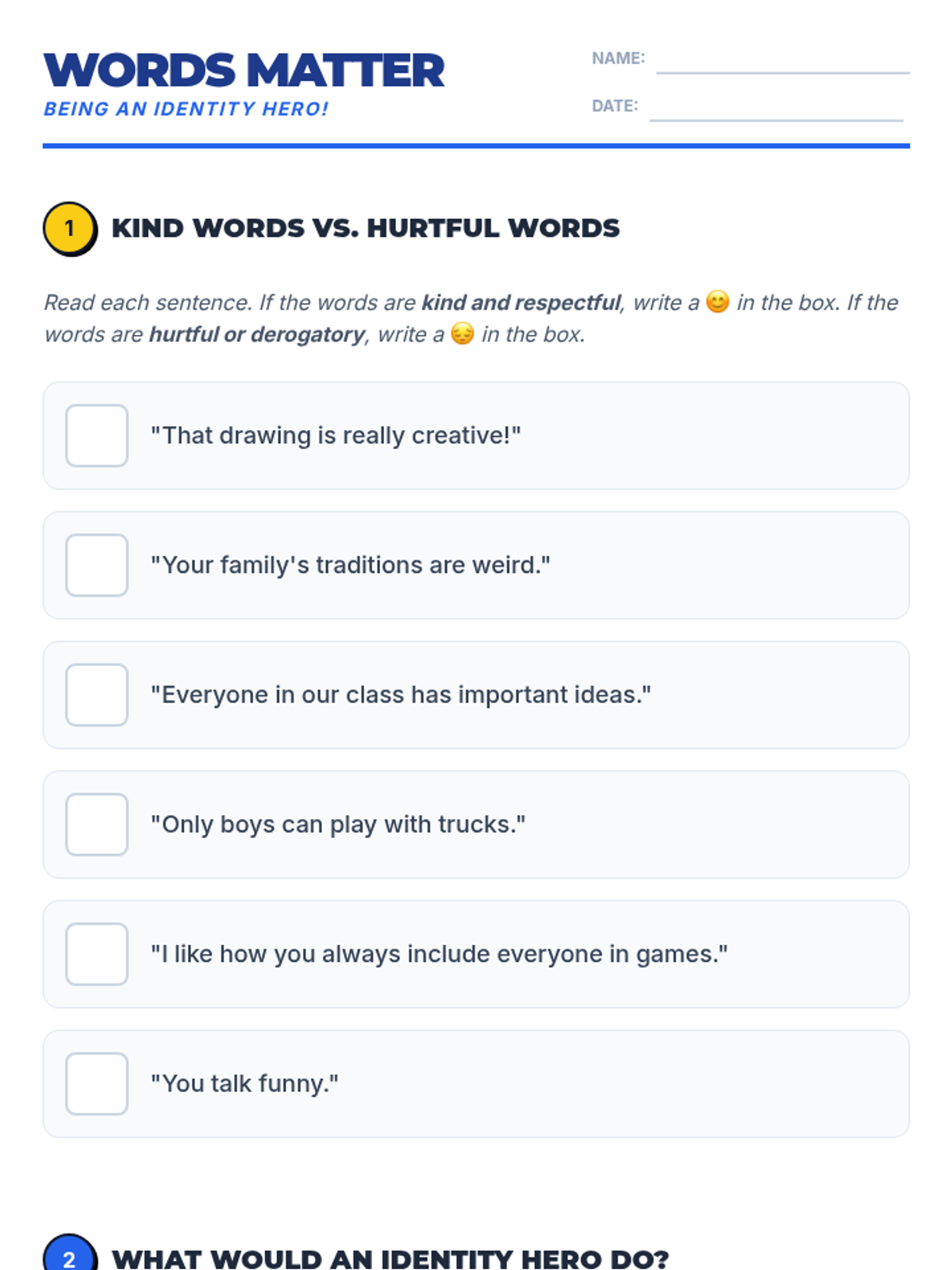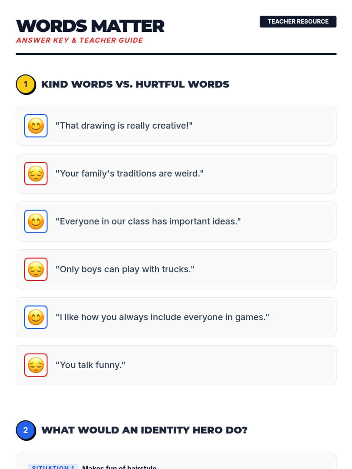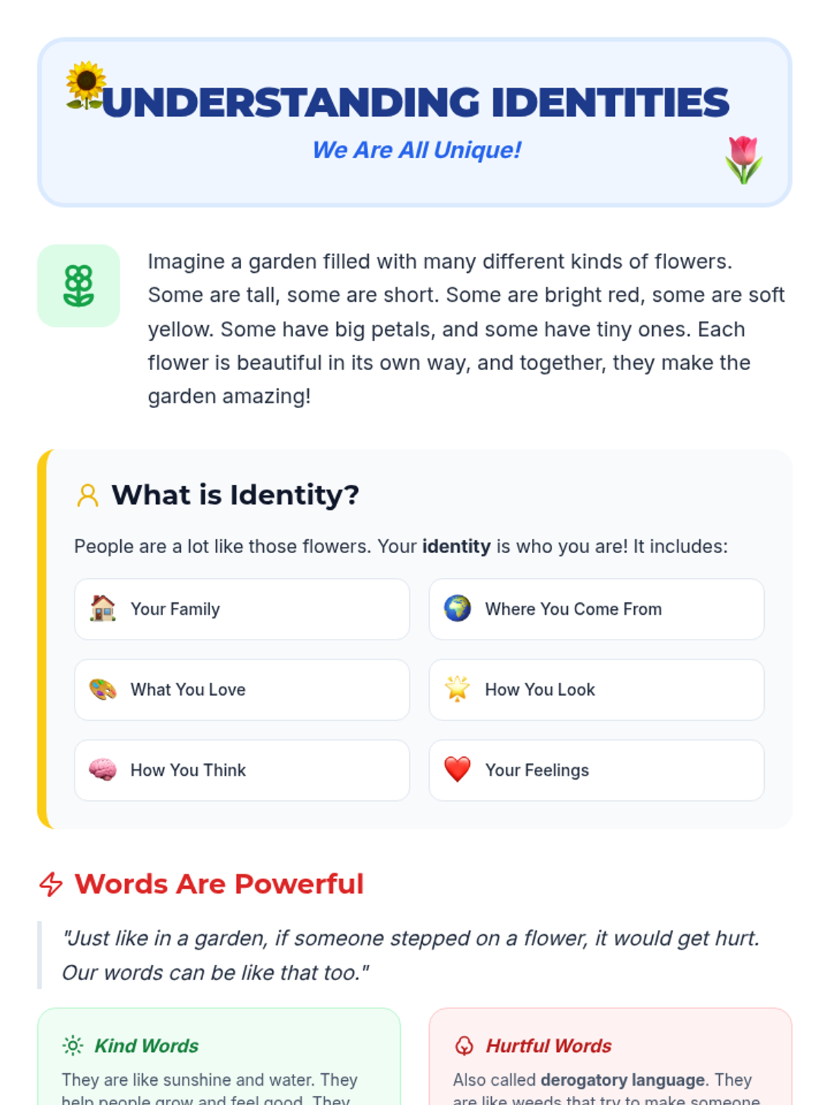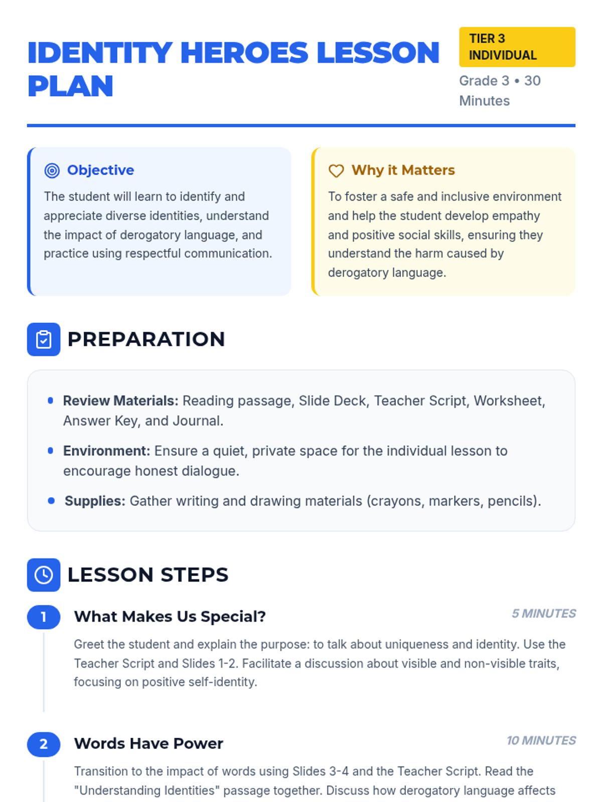 This lesson helps a 3rd-grade student understand and respect diverse identities, focusing on how derogatory language impacts others. It equips the student with strategies to communicate respectfully and celebrate uniqueness through direct instruction, guided discussion, and reflective practice.