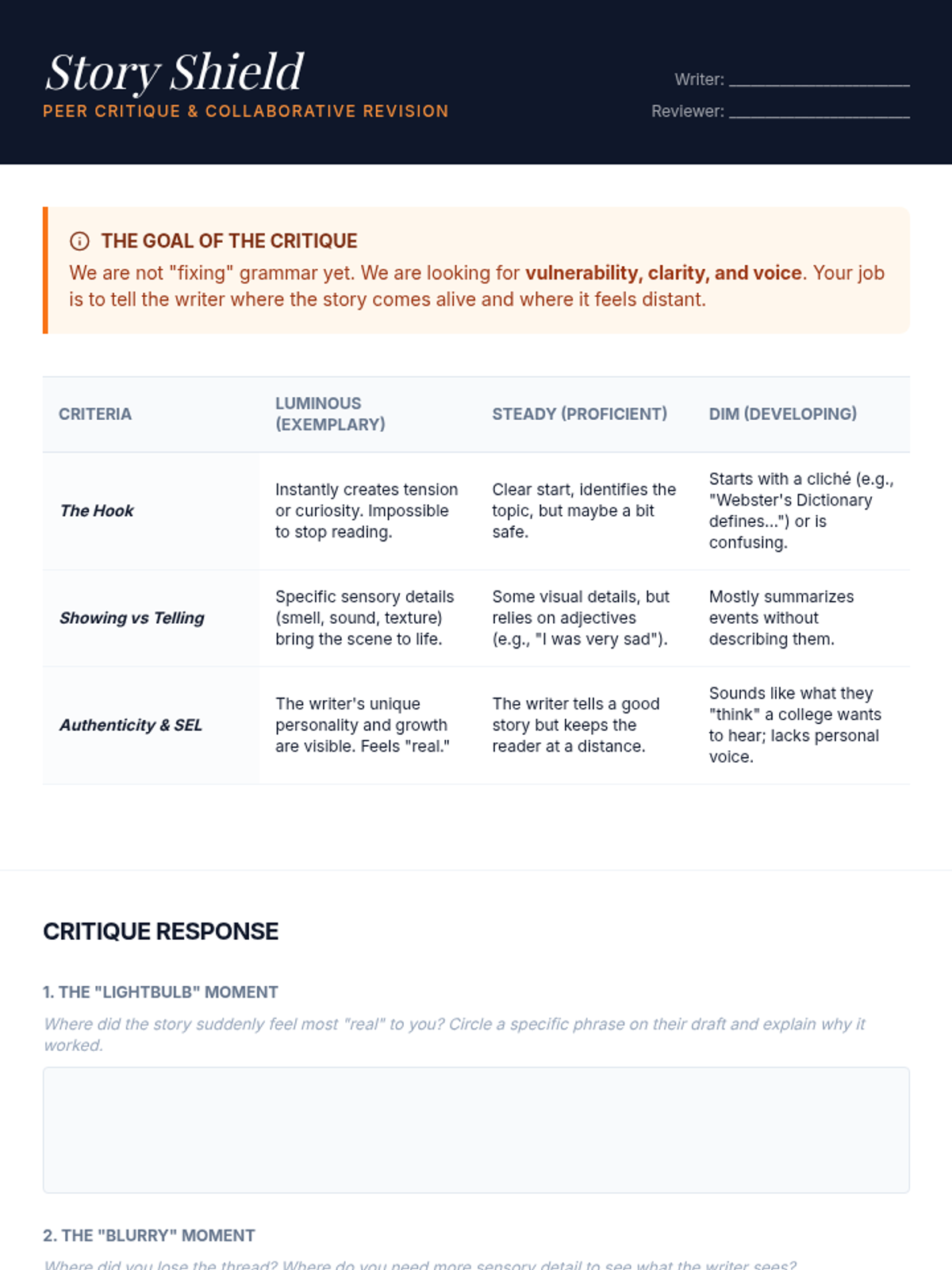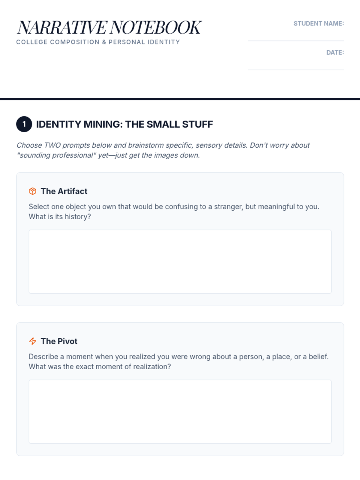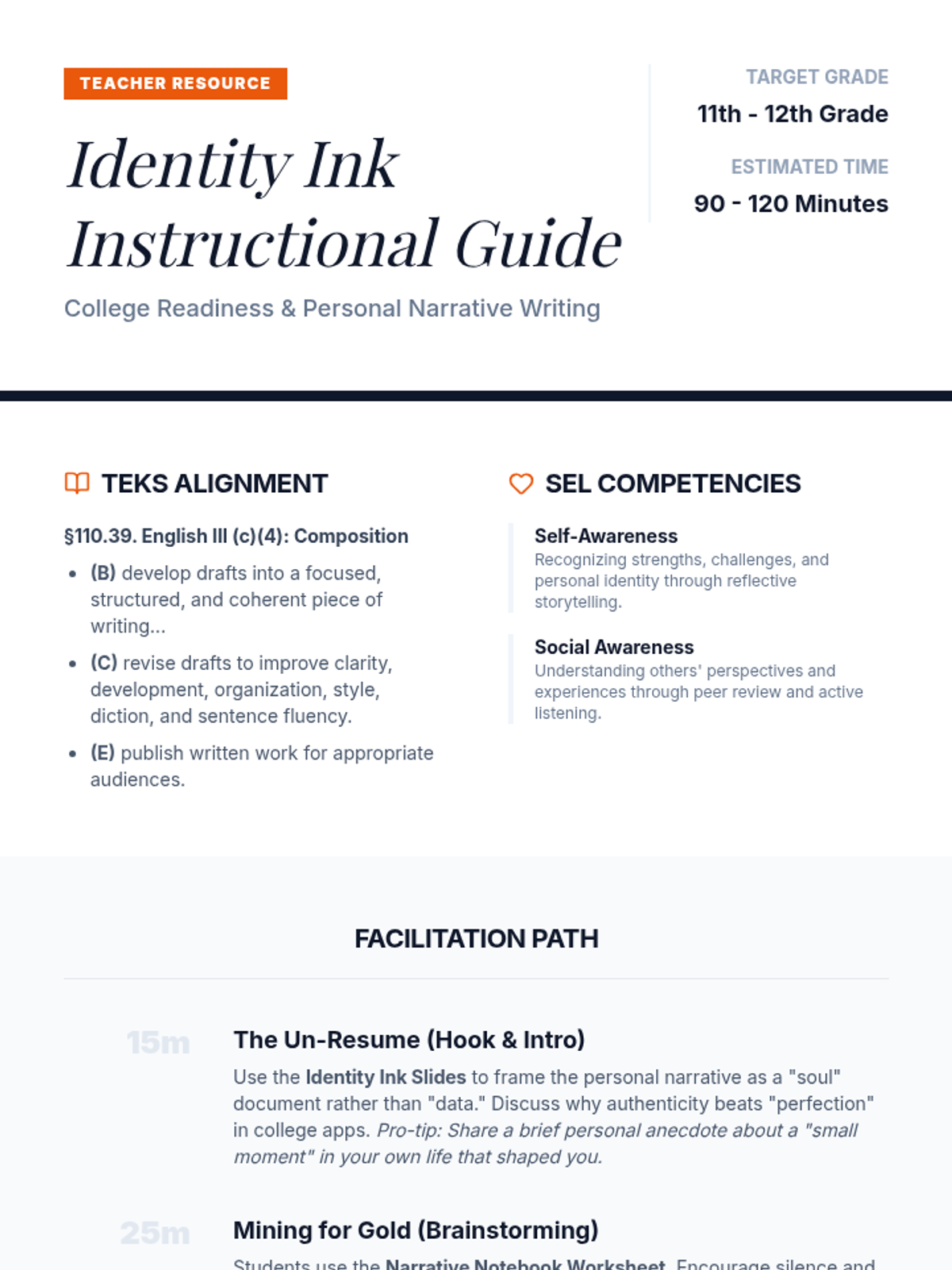 A comprehensive lesson for high schoolers to master the college personal narrative by blending self-awareness with advanced composition skills, aligned with TEKS 110.39 standards.