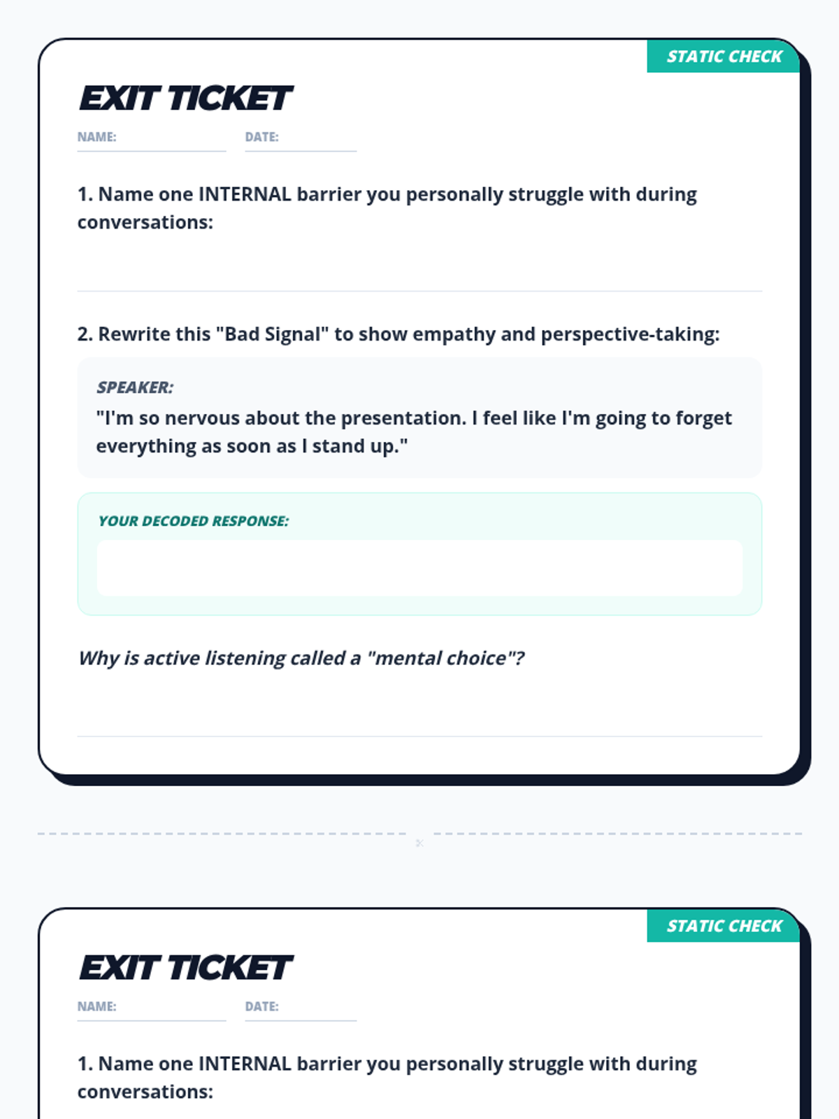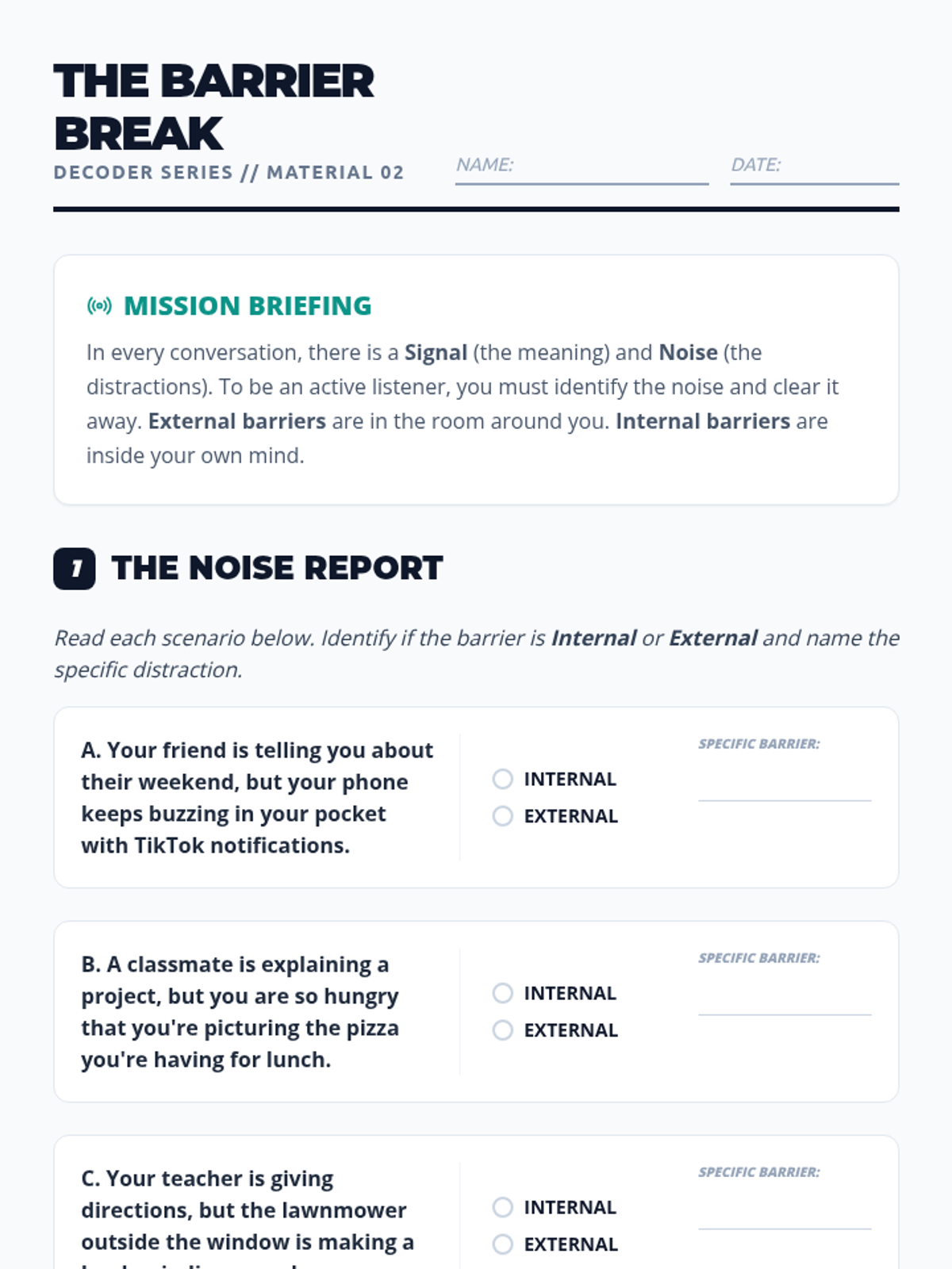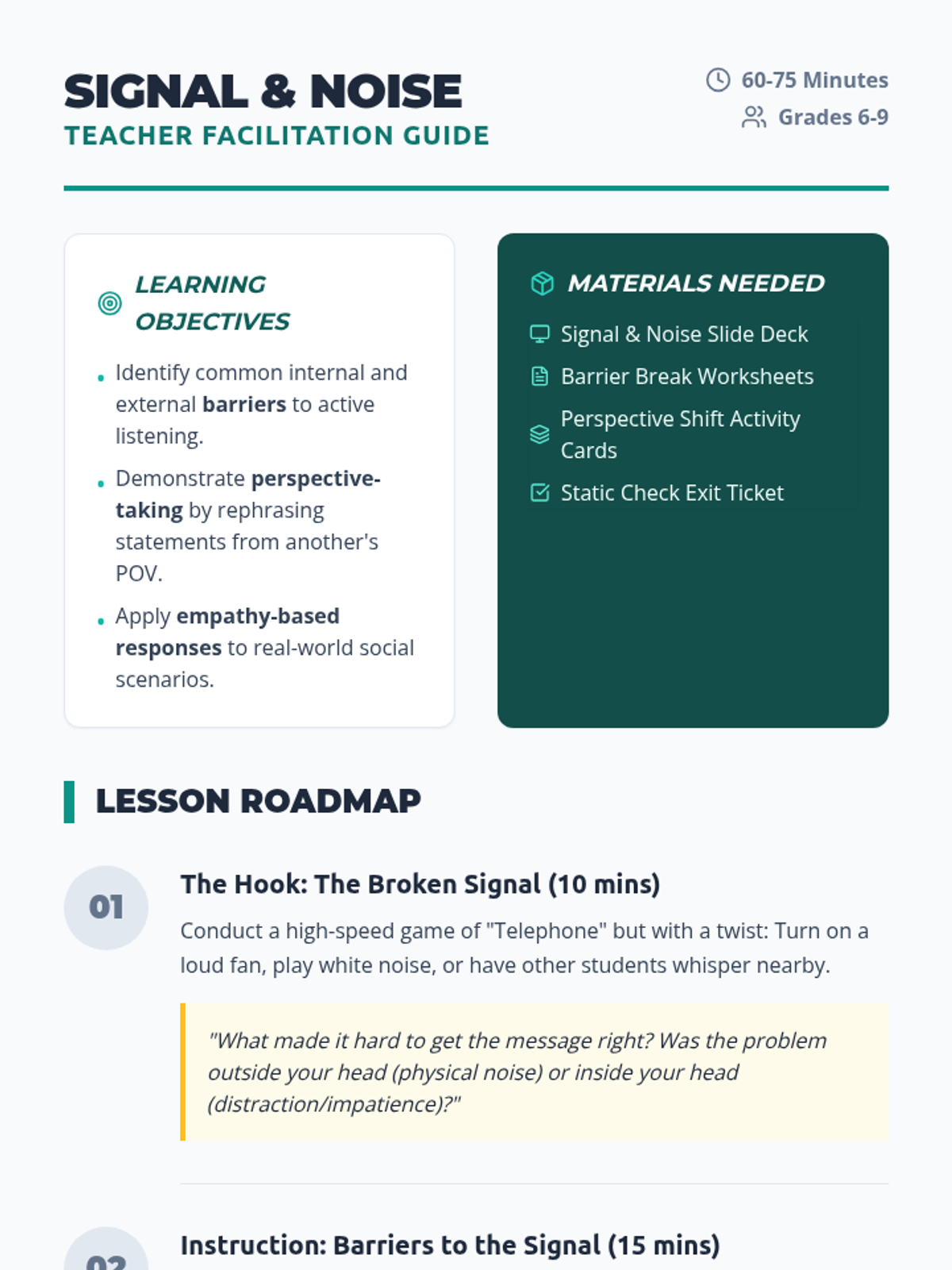 A comprehensive lesson on active listening that teaches students to identify communication barriers and practice empathy through perspective-taking. Students learn to distinguish between the 'signal' (meaning) and 'noise' (distractions) in conversations.