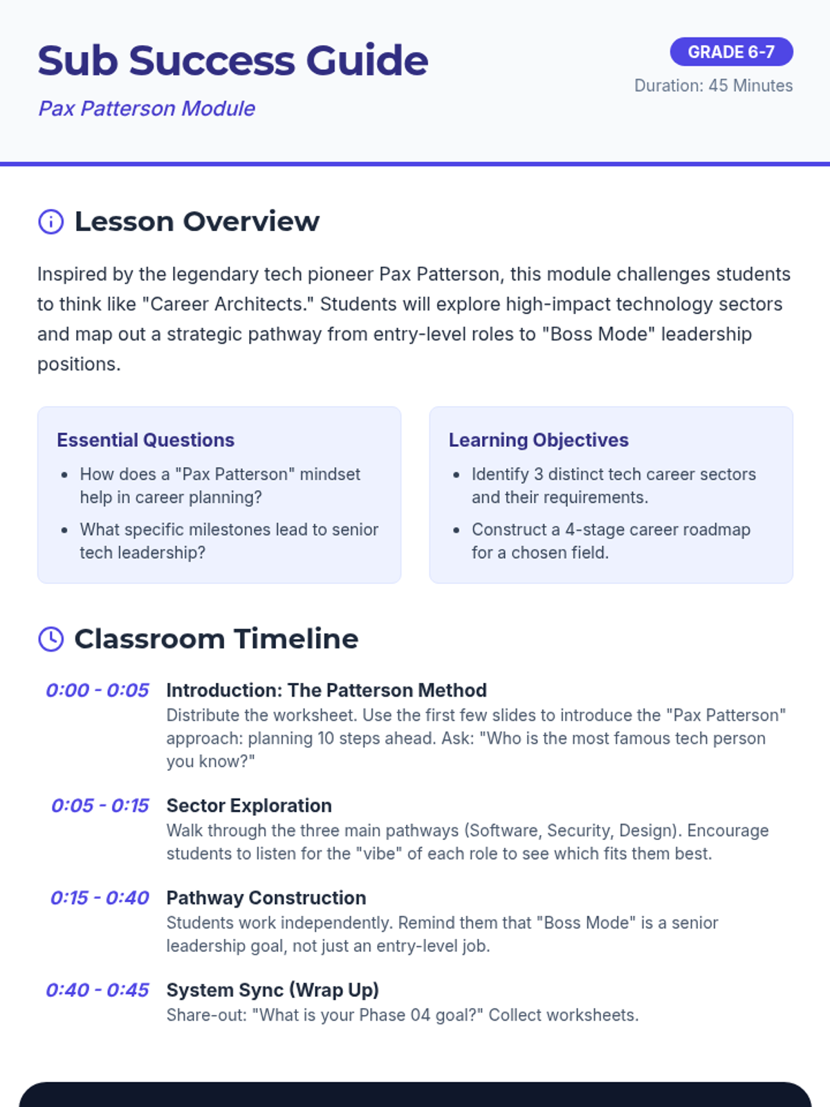 A 45-minute career exploration module inspired by the fictional tech pioneer Pax Patterson, where students research and map out tech career pathways.