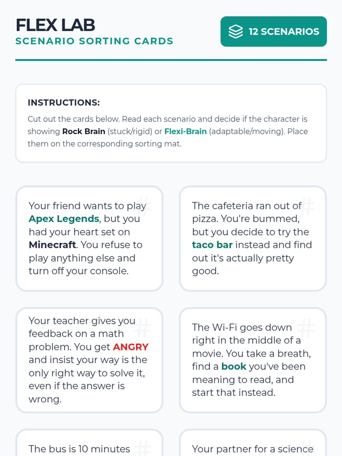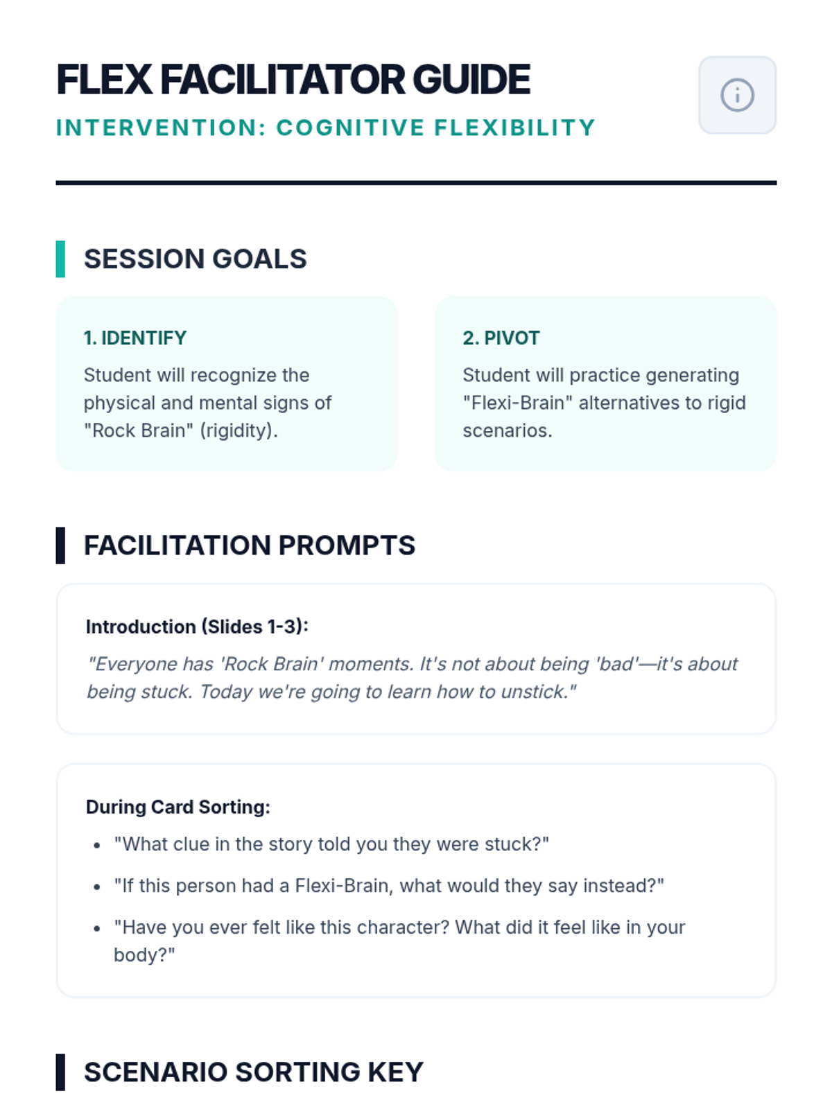 This lesson introduces the 'Rock Brain' vs. 'Flexible Brain' concept, providing the student with tools to recognize mental rigidity and practice shifting to adaptable thinking through interactive scenario sorting.