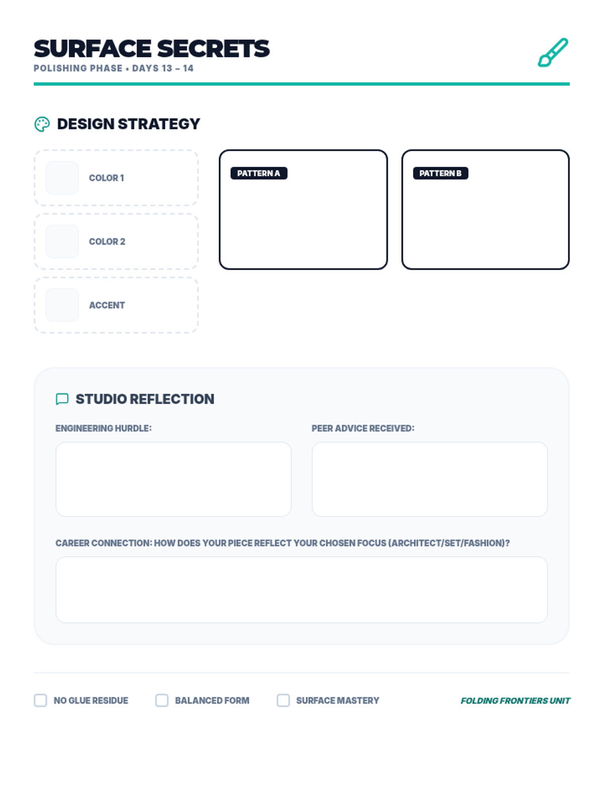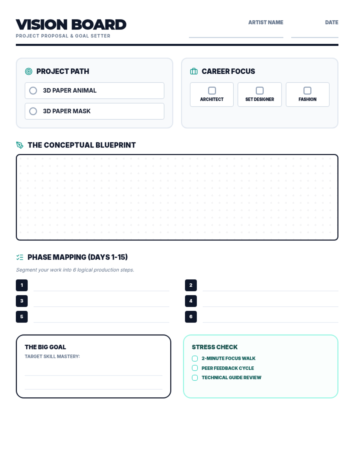Focuses on initial conceptualization, career exploration, and mastering paper folding techniques through prototyping and goal setting.