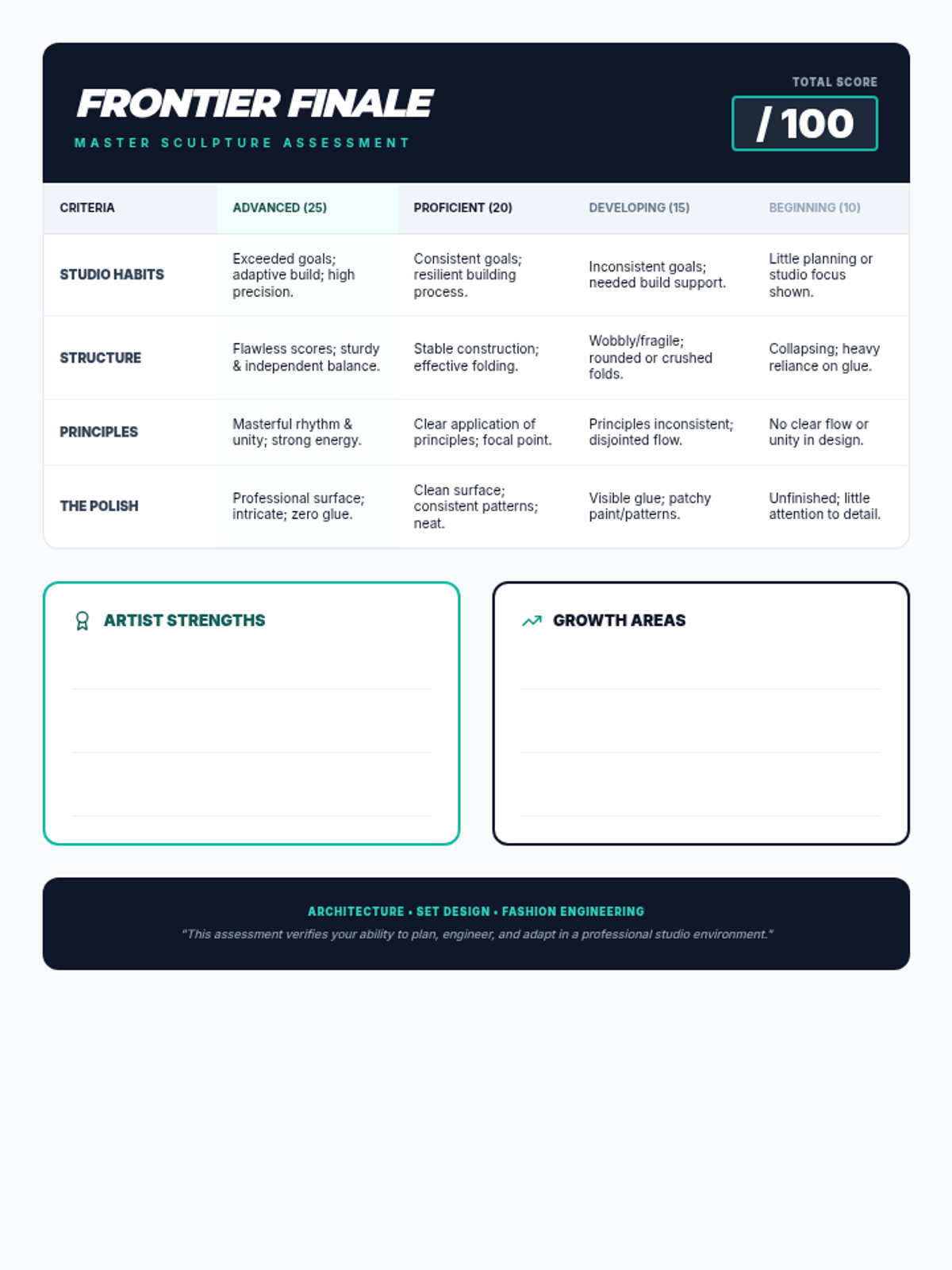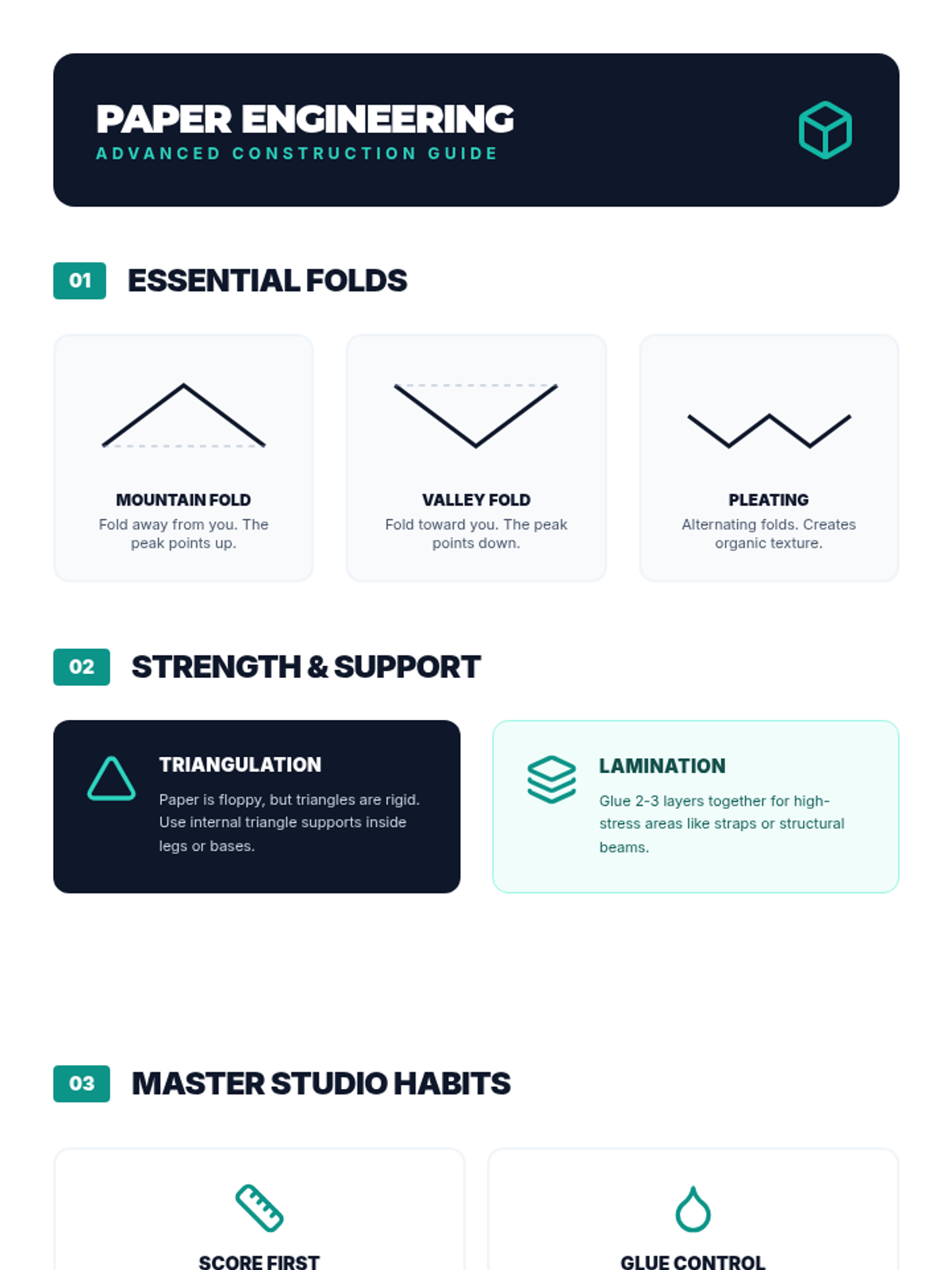 Building the 3D form using advanced folding, scoring, and attachment techniques while practicing studio habits and perseverance.