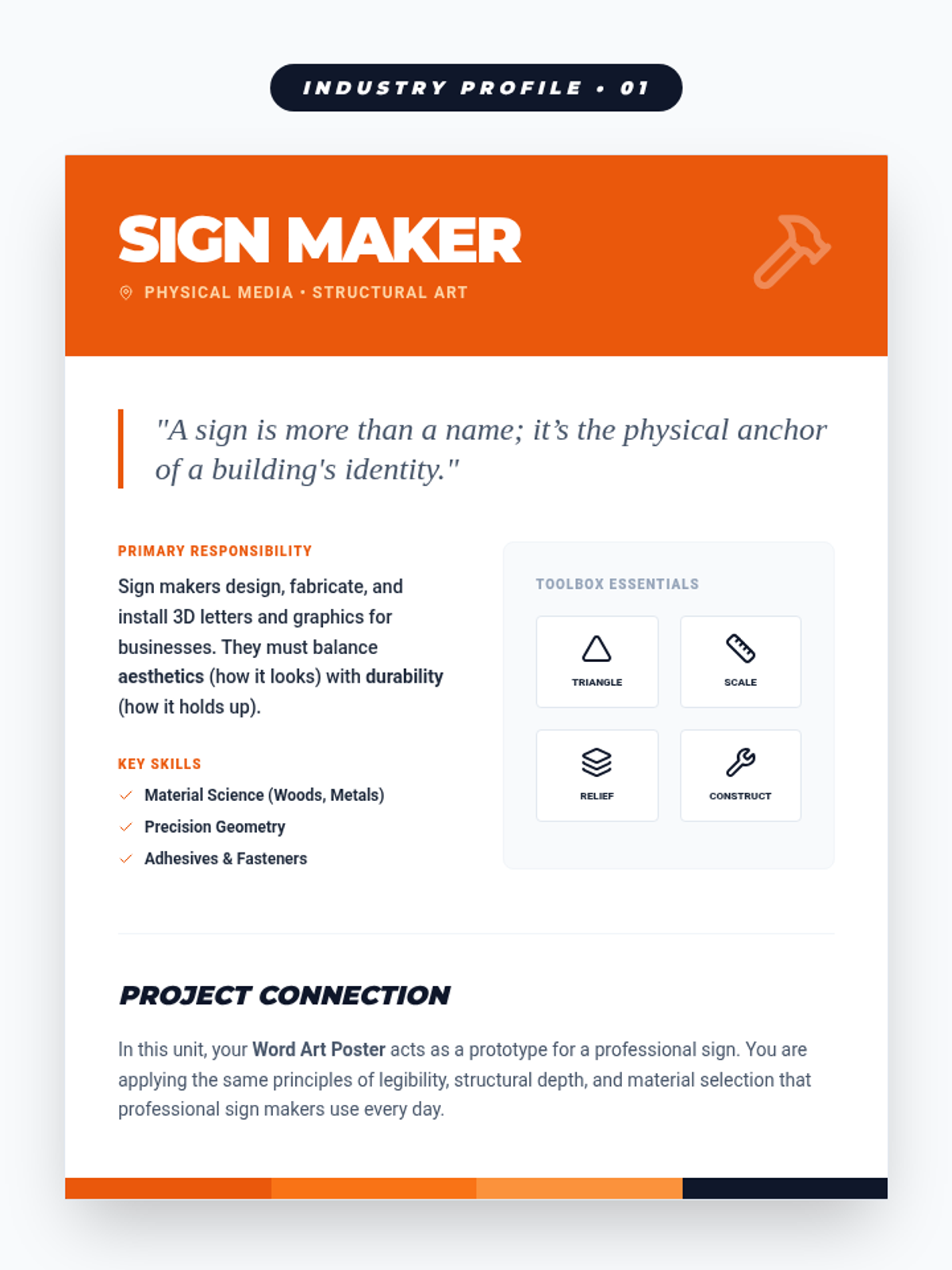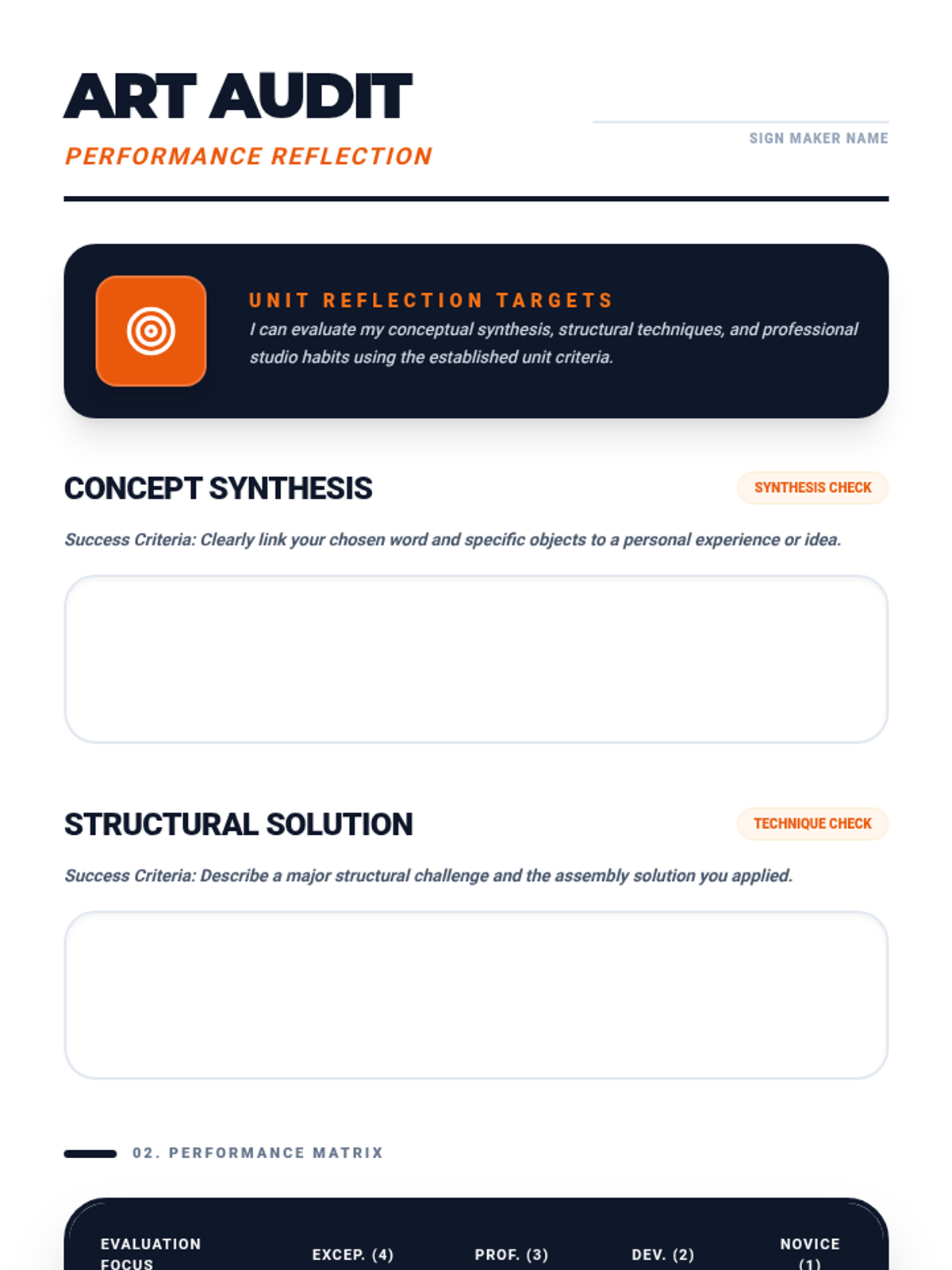 Final presentation and critique where students reflect on their work through the lens of a Sign Maker and self-assess their studio habits and technical growth.
