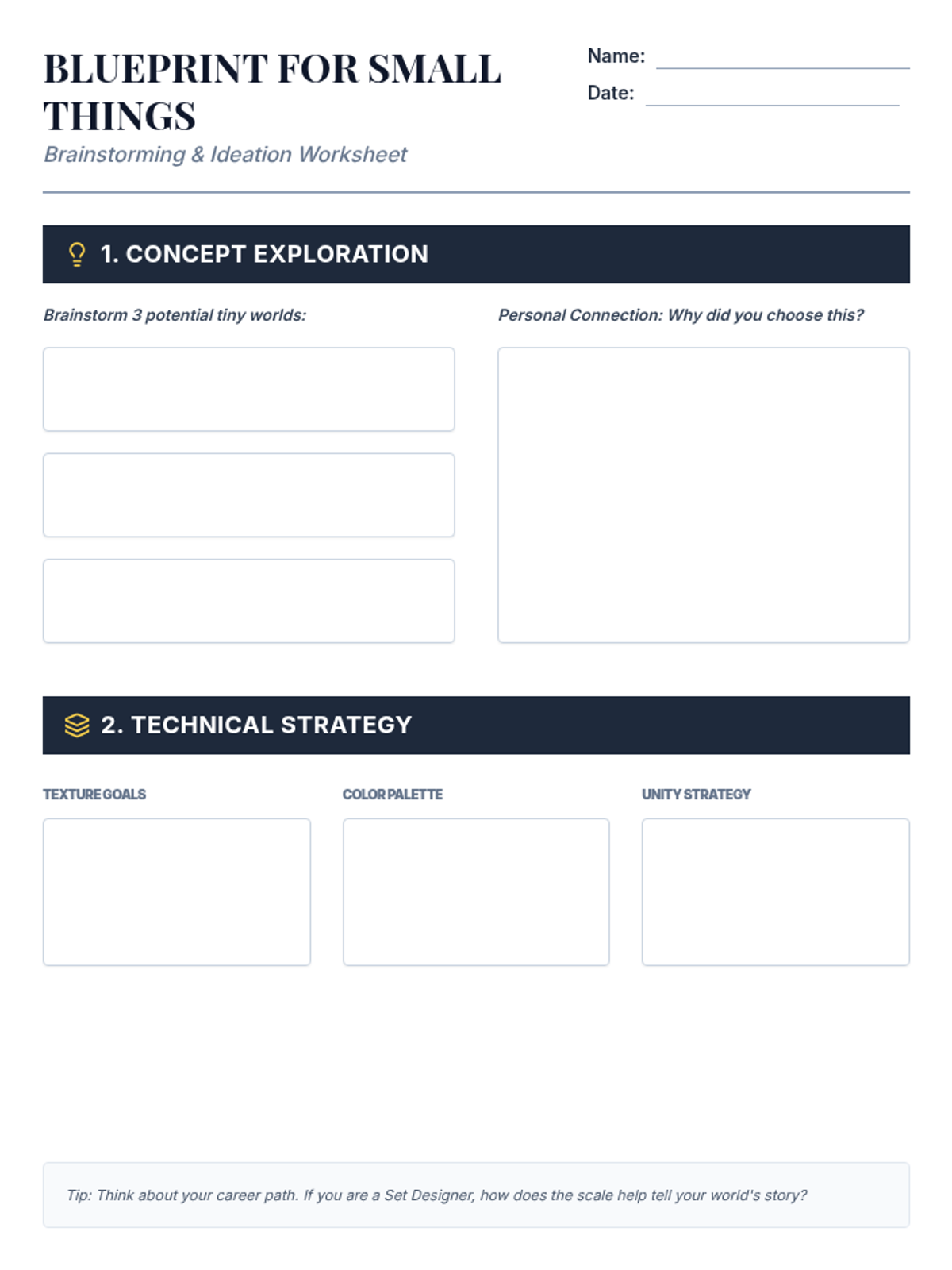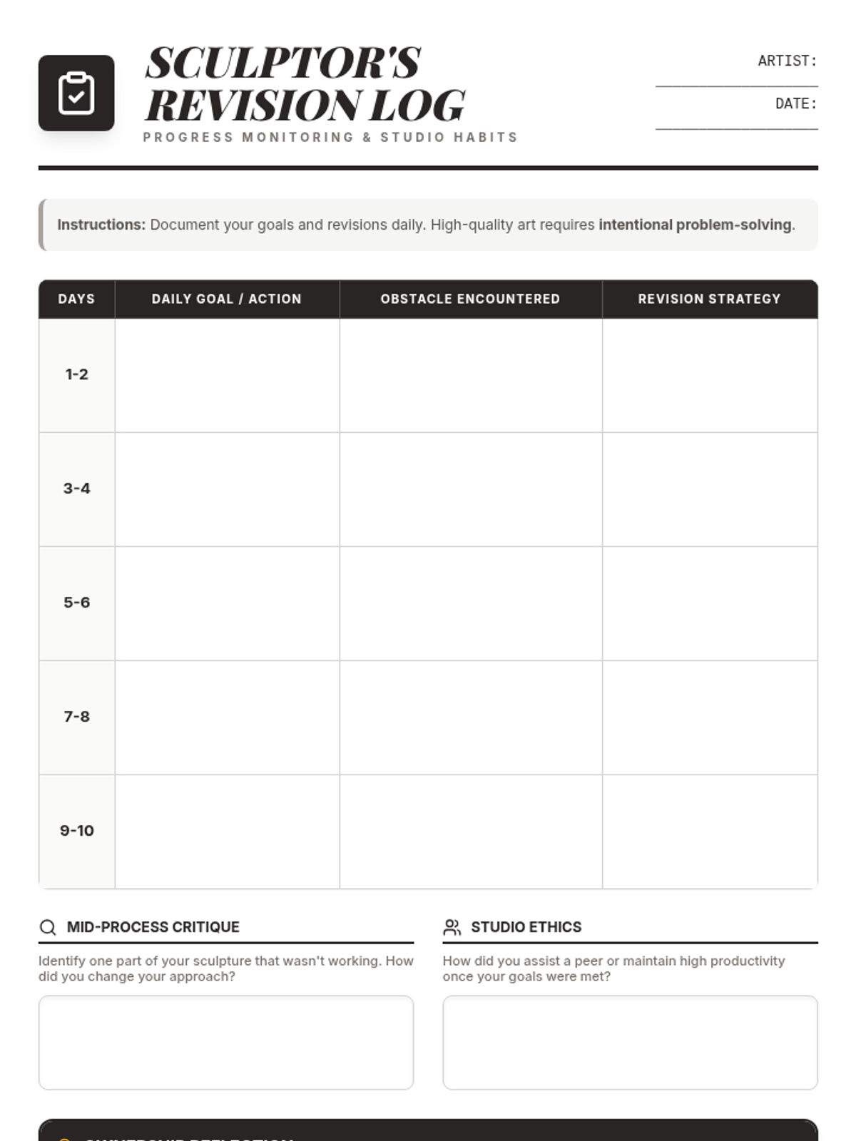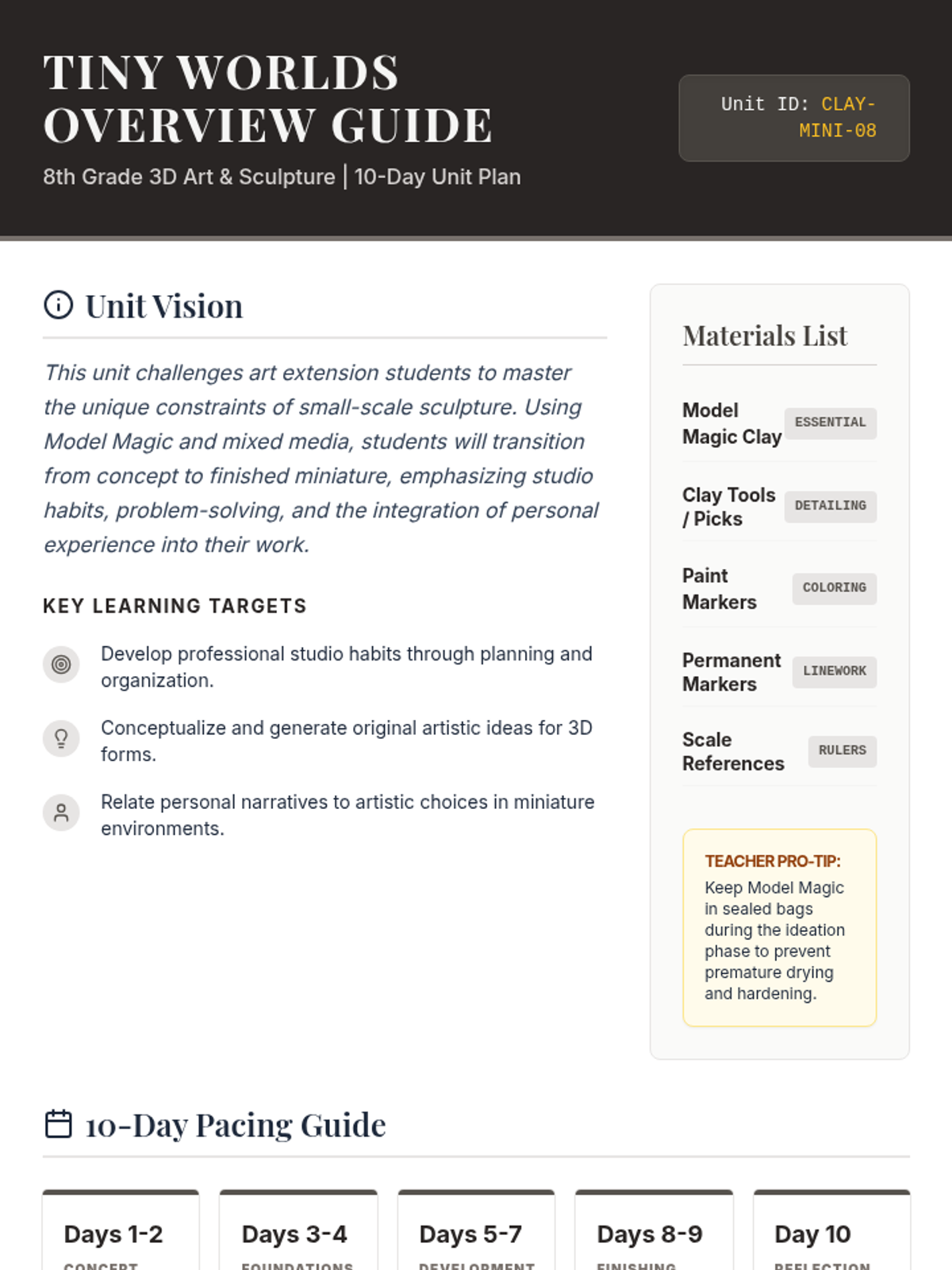 A comprehensive 10-day unit focused on conceptualizing and creating 3D clay miniatures using Model Magic. Students explore career paths like set design and pottery while developing studio habits and problem-solving skills through iterative sculpting and self-analysis.