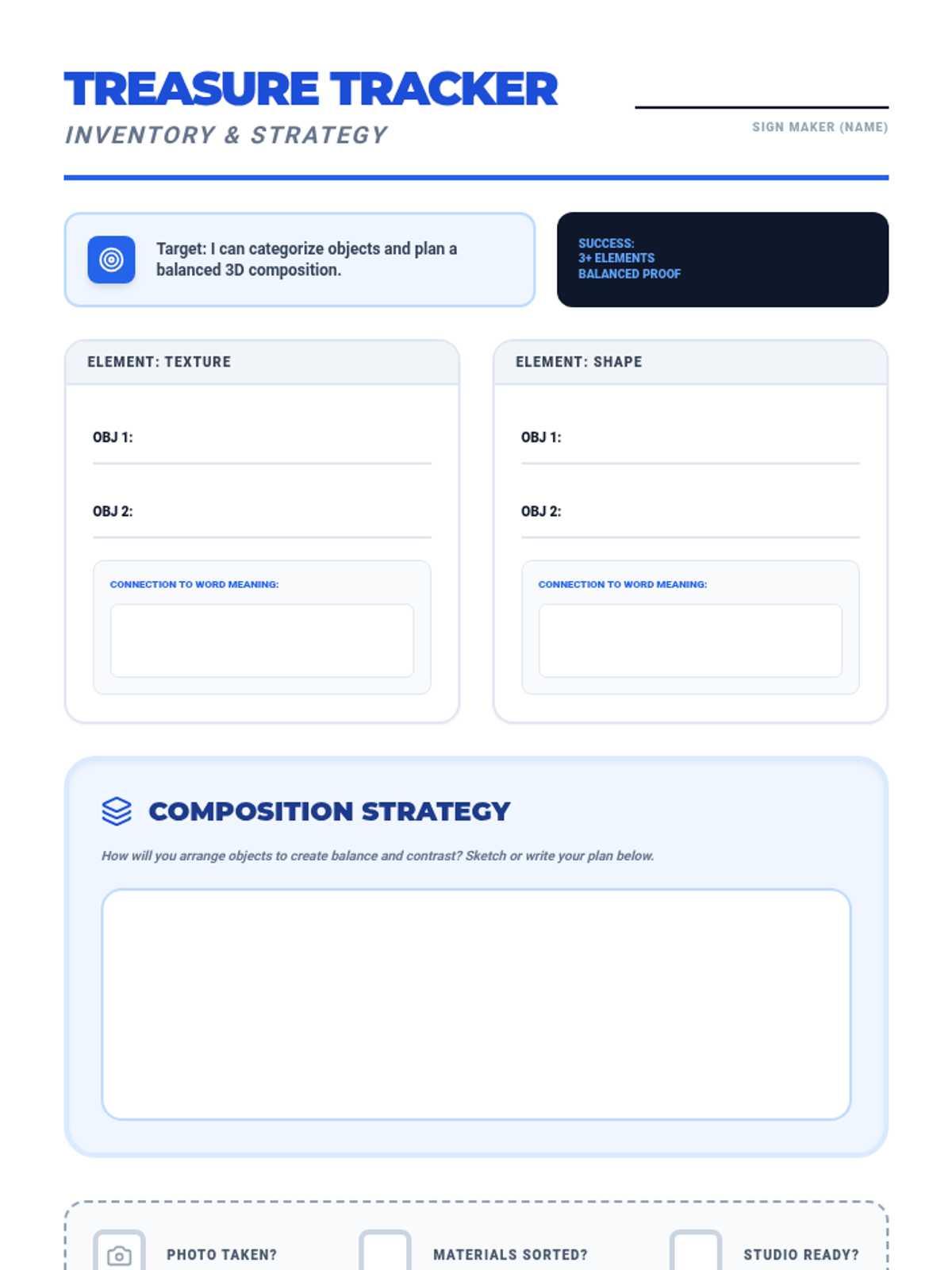 Students hunt for found objects and categorize them by art elements and design principles. They create a physical prototype of their word art, focusing on balance and contrast.