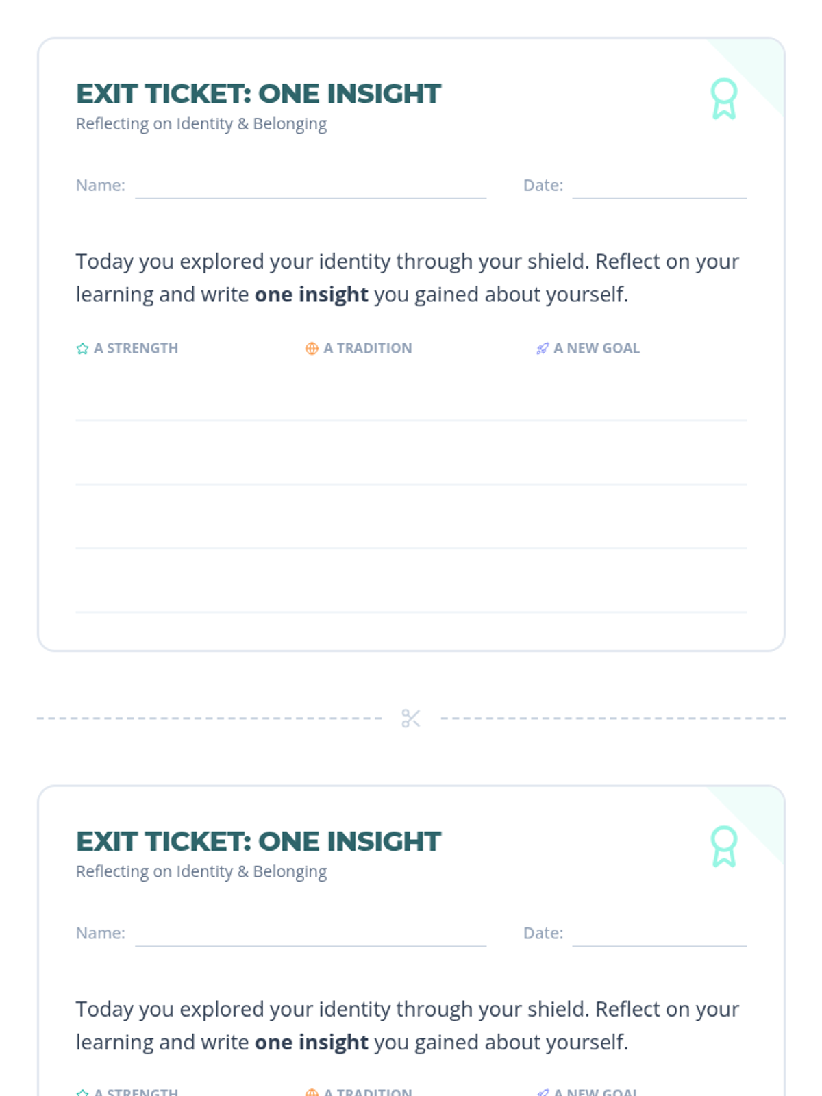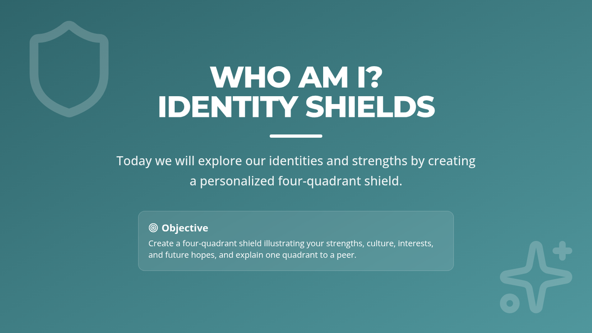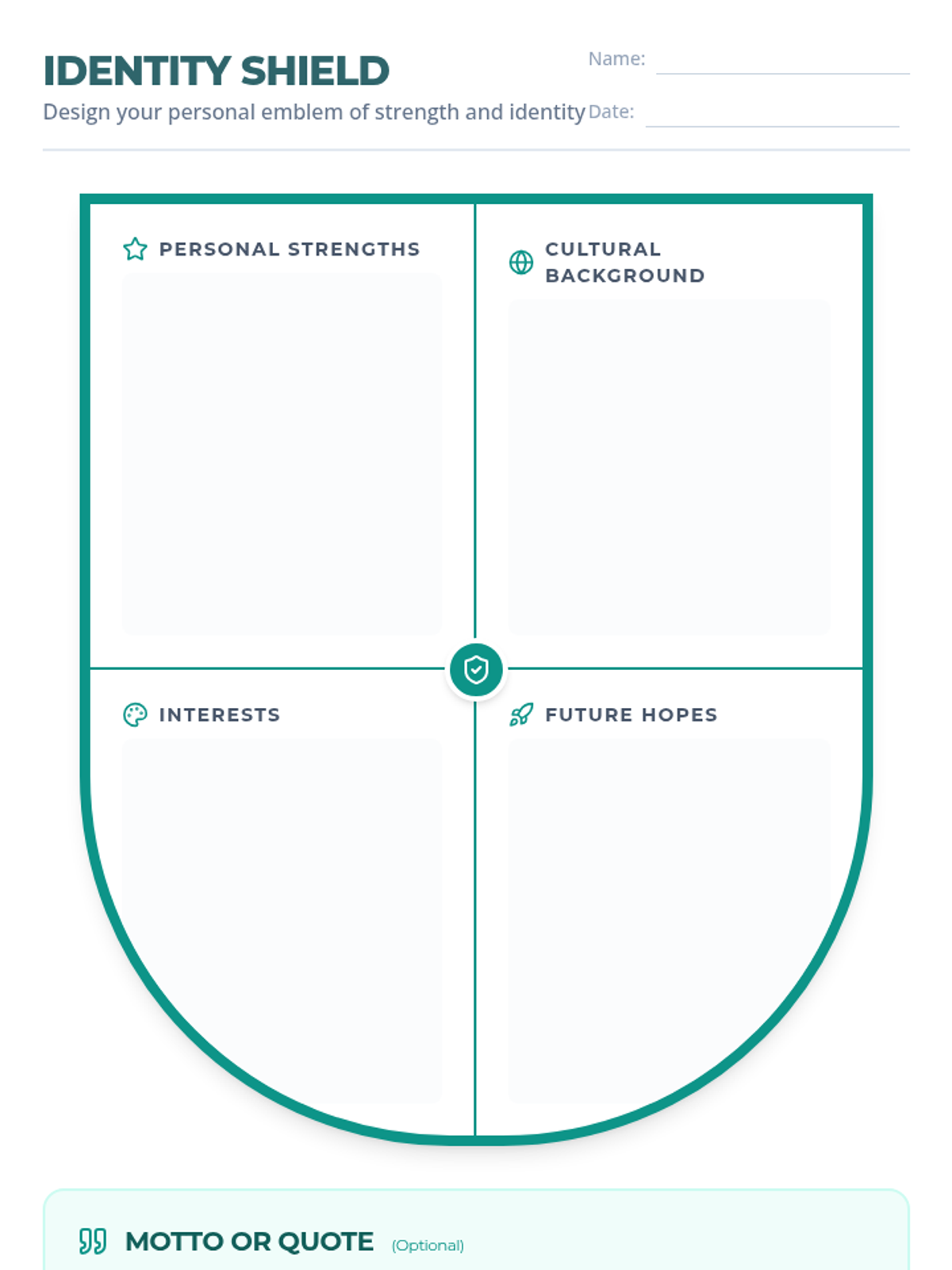A 30-minute 9th grade lesson where students explore their identity by creating a four-quadrant shield illustrating strengths, culture, interests, and future hopes to build self-awareness and belonging.