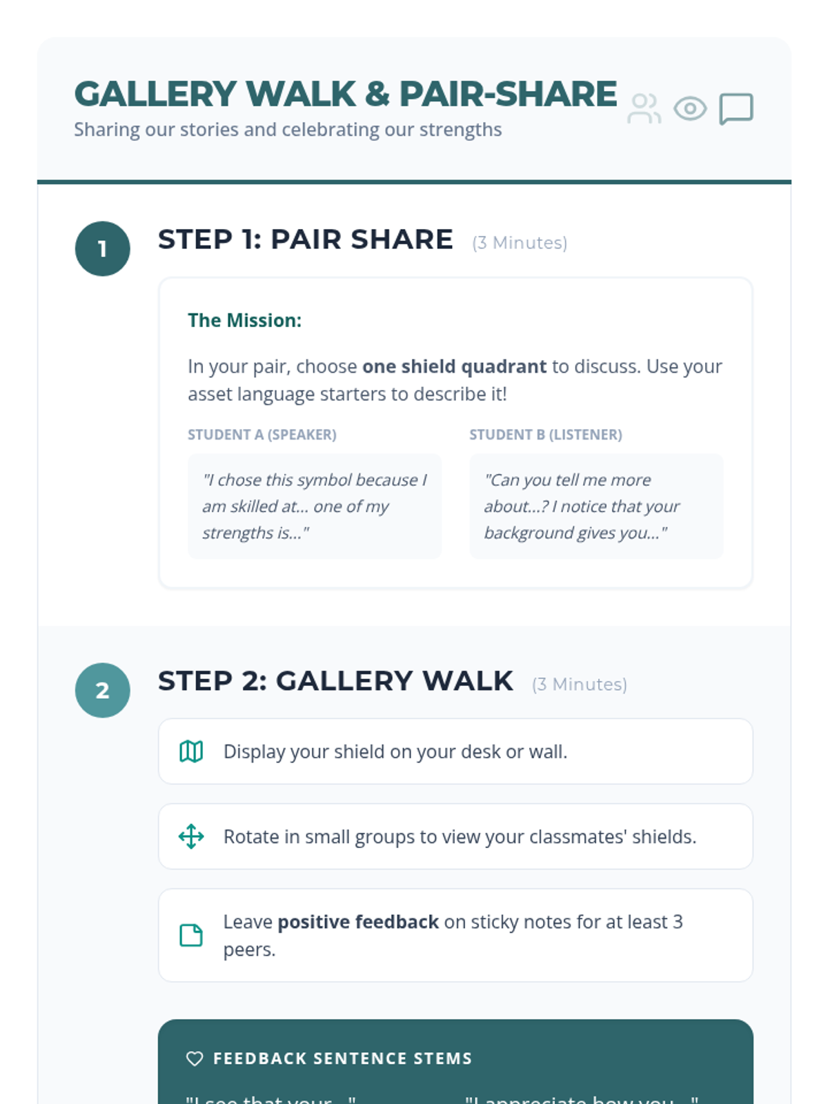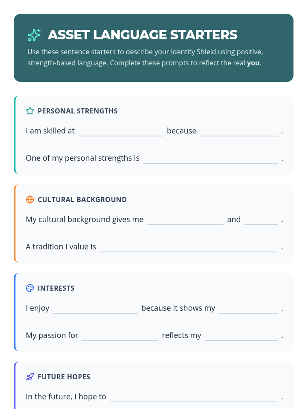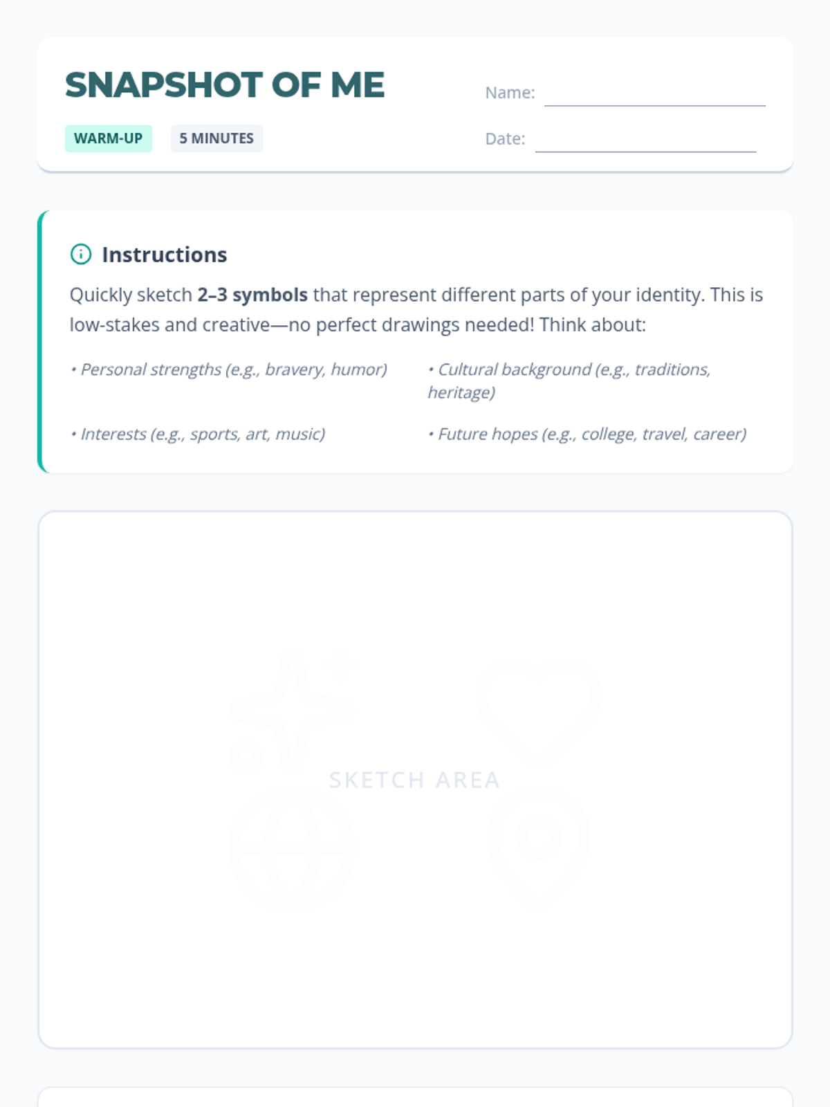 A 30-minute 9th grade lesson where students explore their identity by creating a four-quadrant shield illustrating strengths, culture, interests, and future hopes to build self-awareness and belonging.