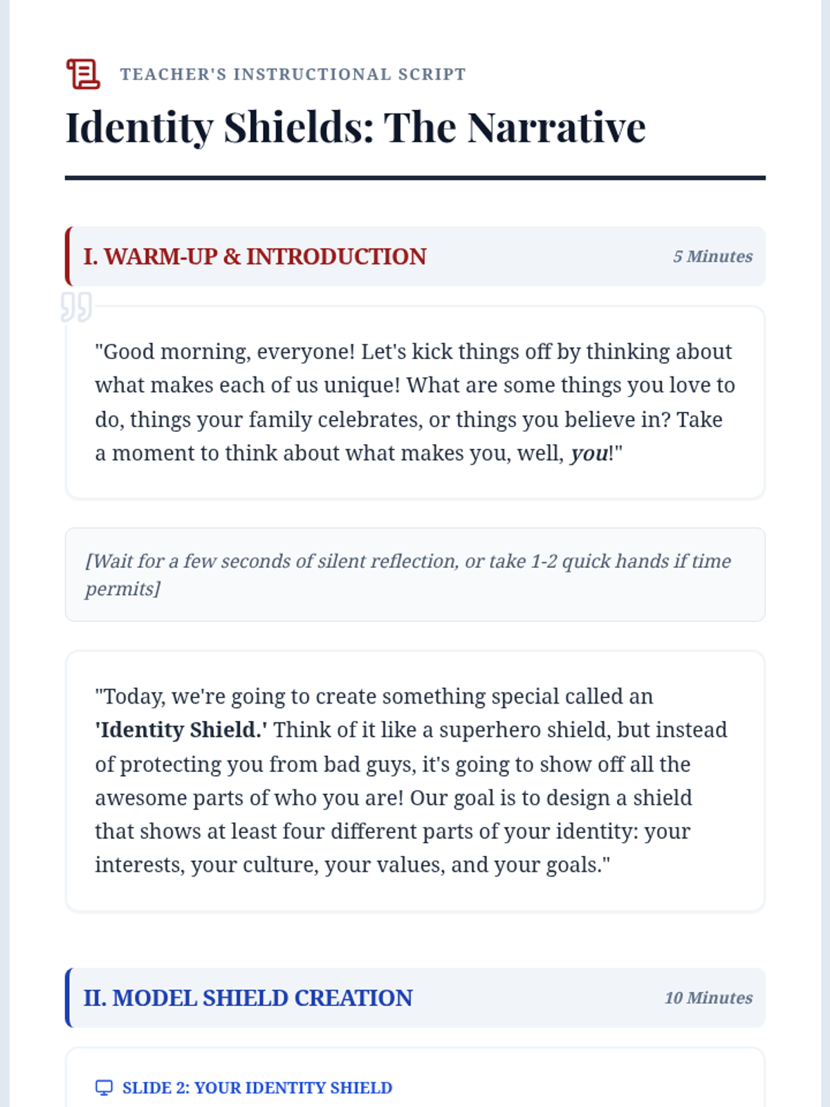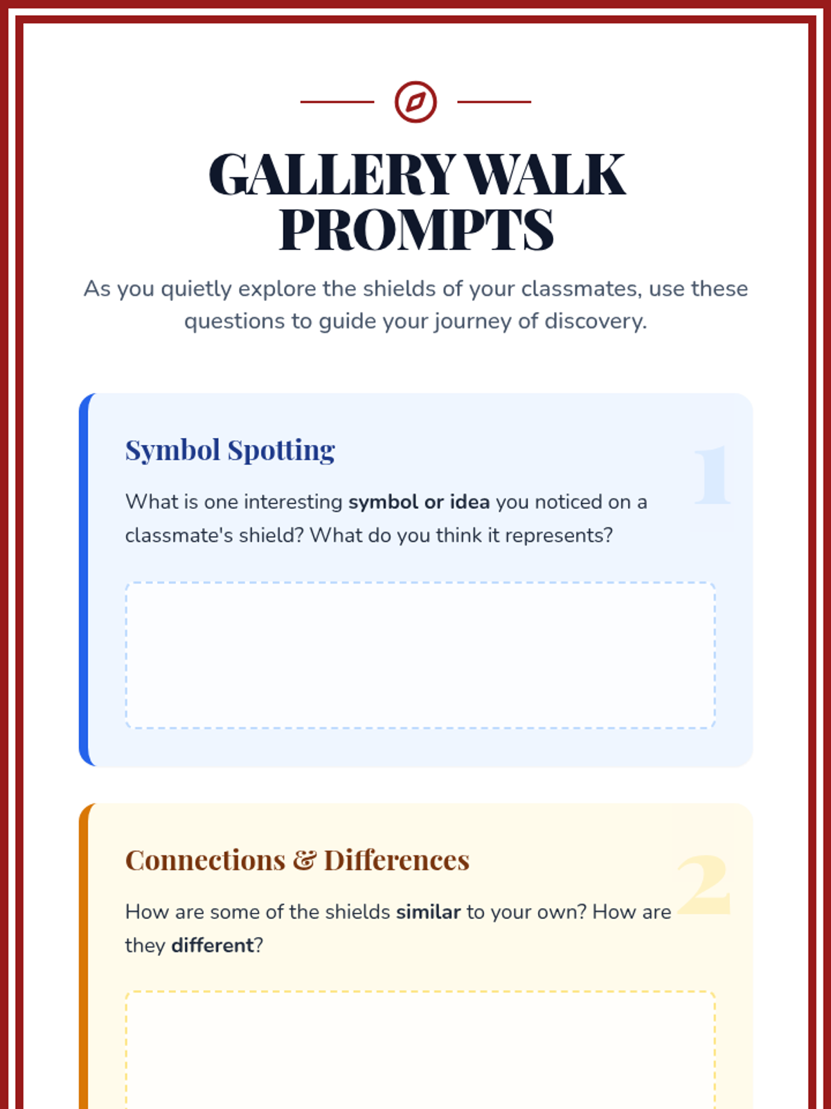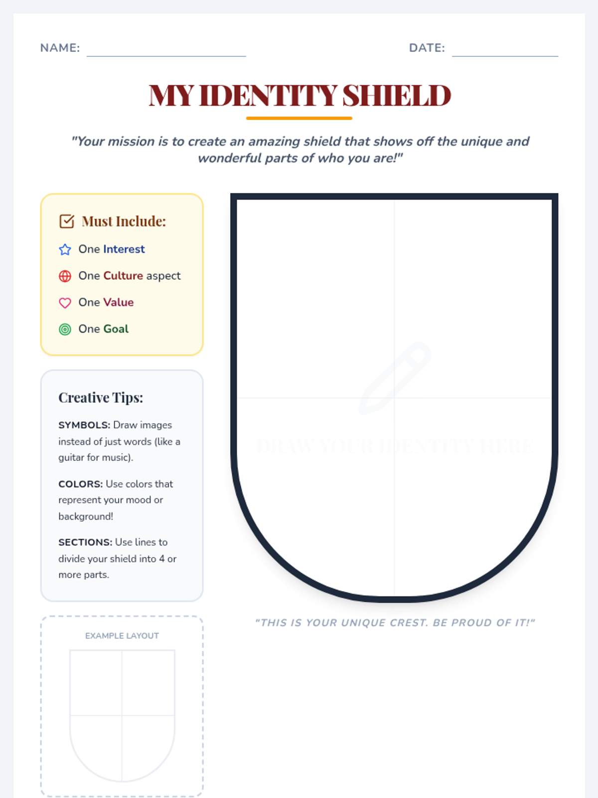 Students design identity shields to visually represent their interests, culture, values, and goals, fostering self-awareness and celebrating class diversity.