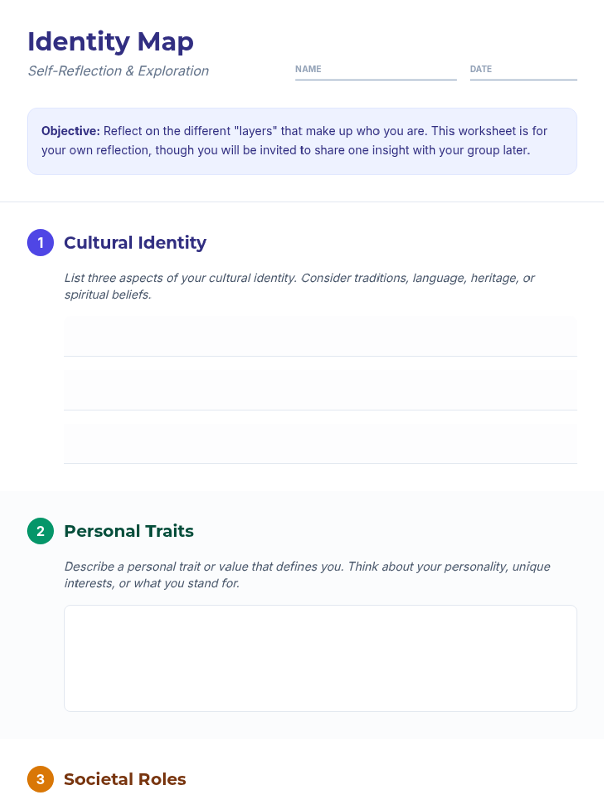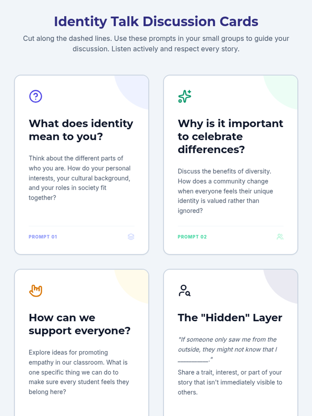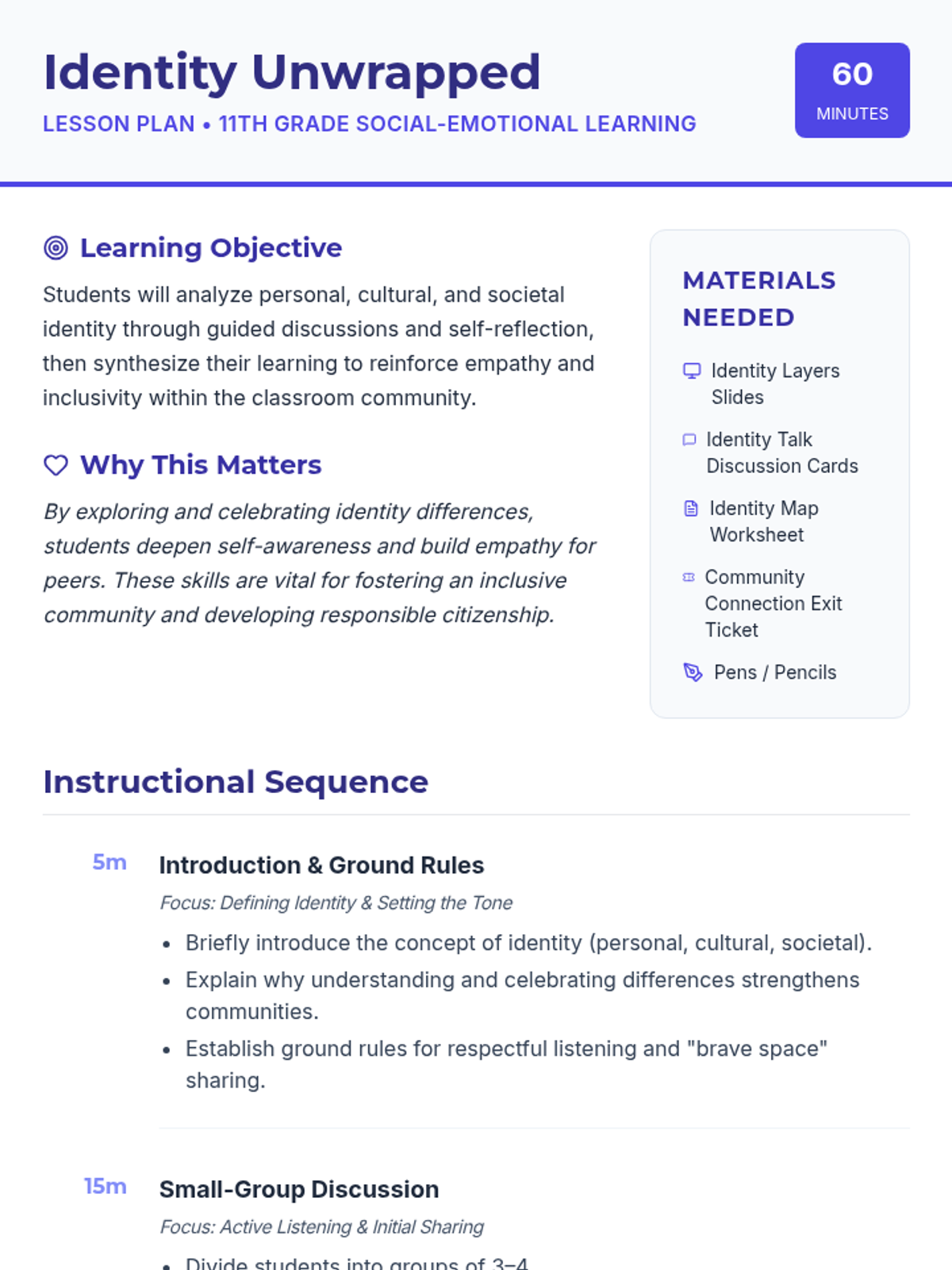 A 60-minute lesson for 11th graders to explore personal, cultural, and societal identity, fostering empathy and classroom community through reflection and discussion.