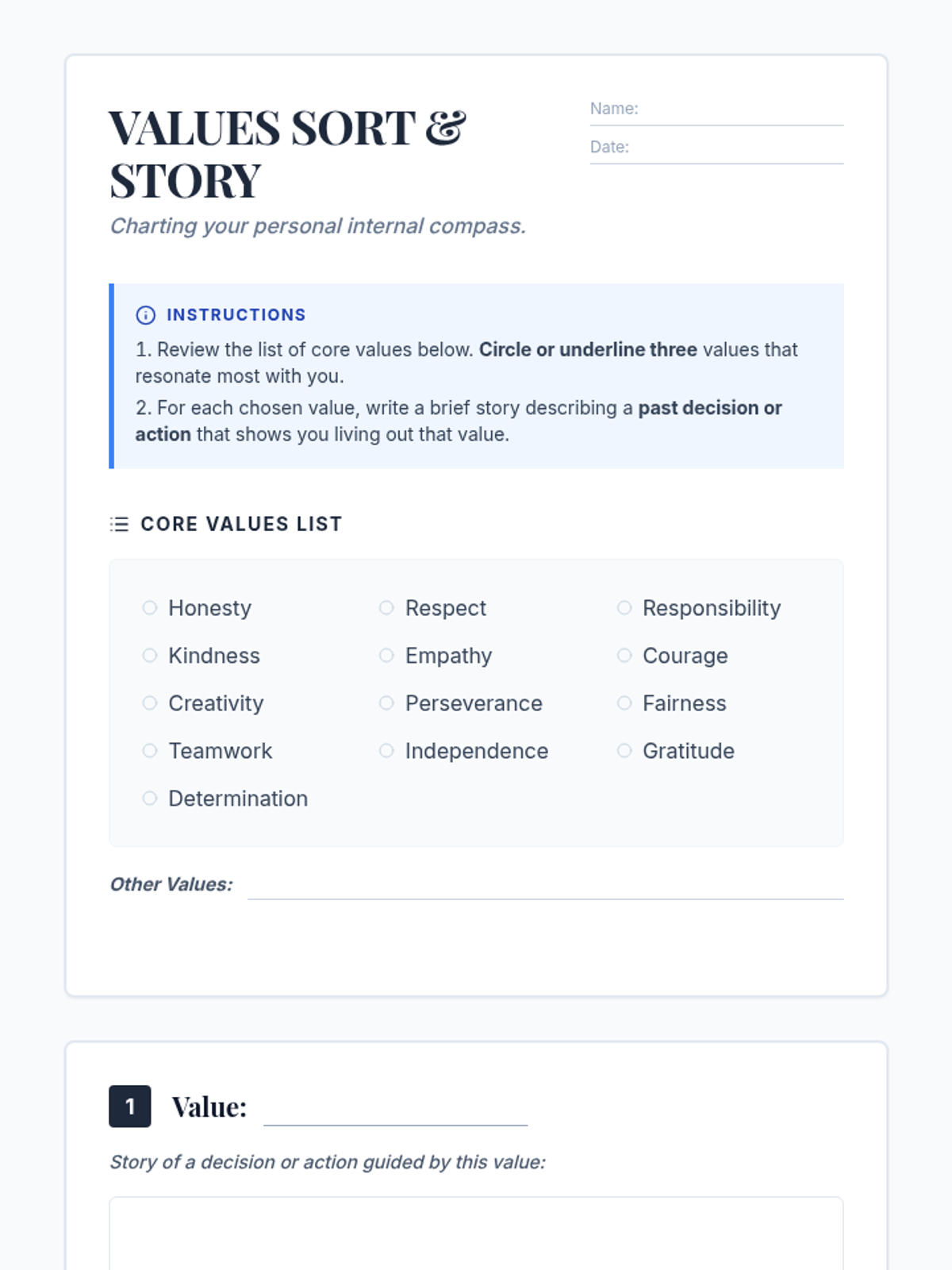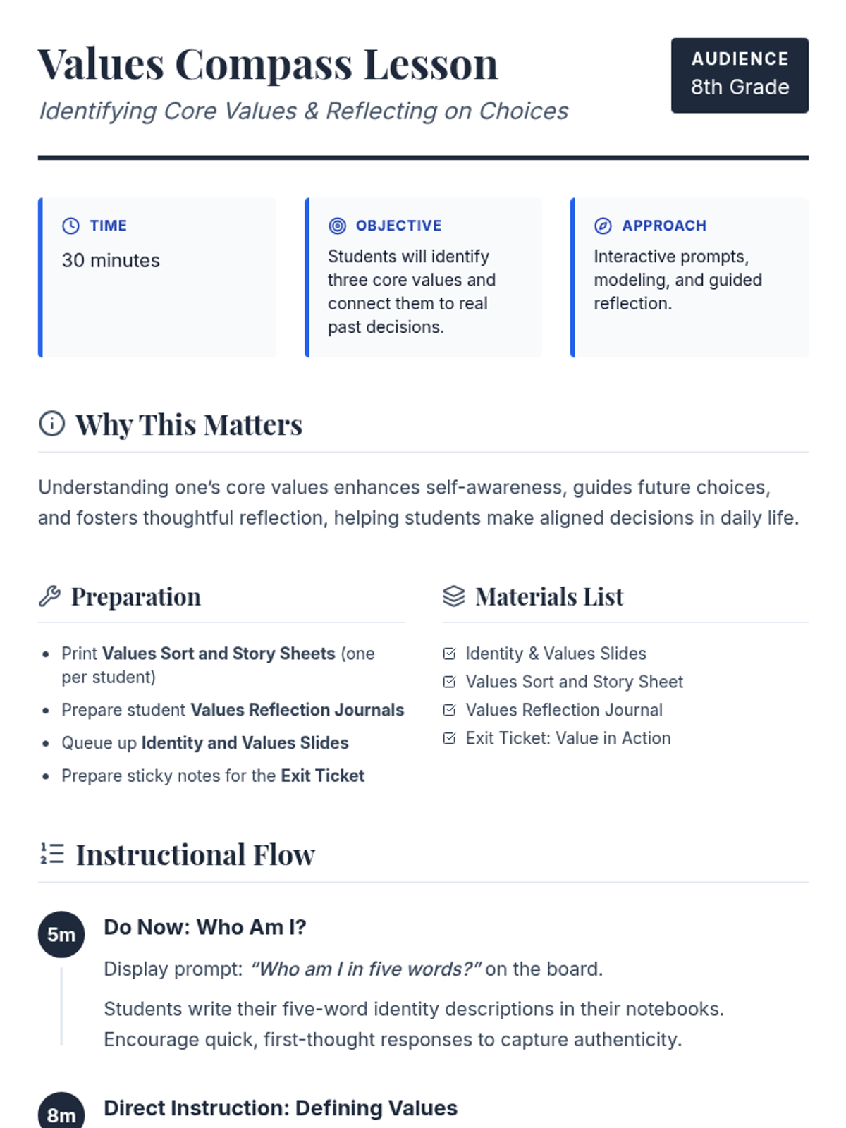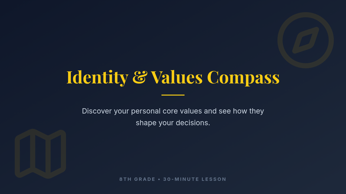 A 30-minute 8th-grade lesson exploring personal identity through core values and reflective storytelling to build self-awareness and decision-making skills.