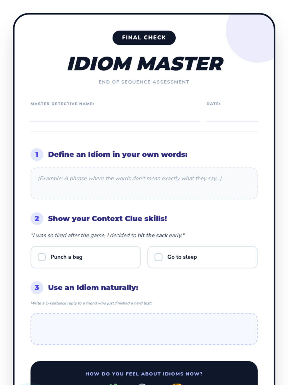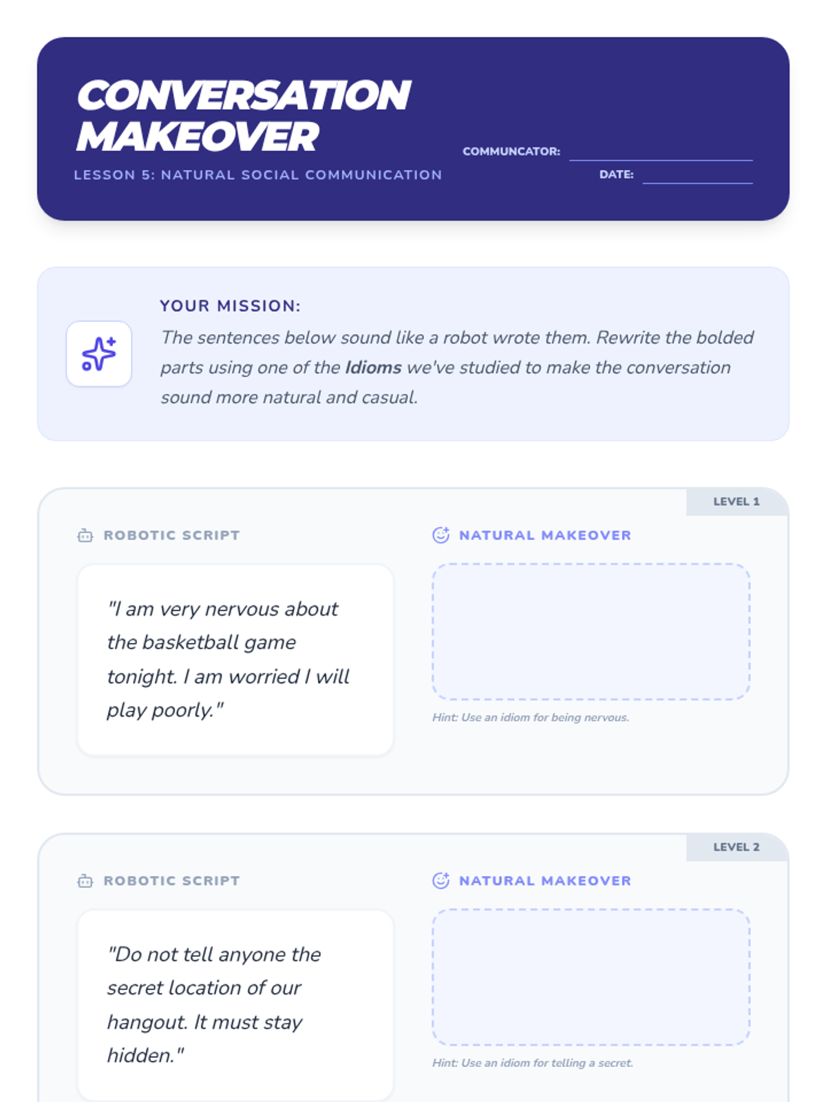 Students practice natural conversation by integrating idioms into robotic dialogues and peer-reviewing for appropriate usage.
