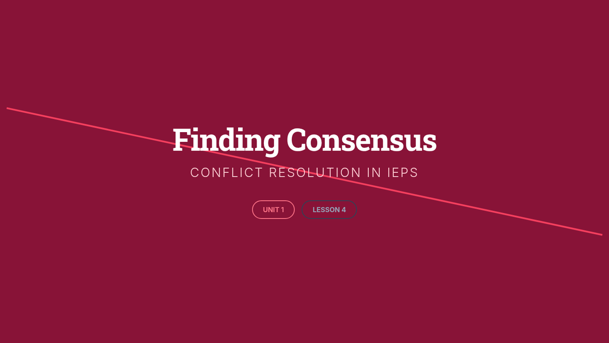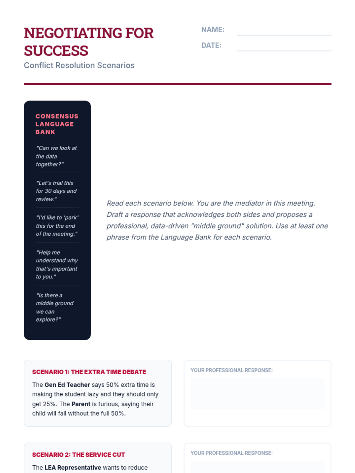 Students learn and practice strategies for managing disagreement among team members and consensus-building language for high-stakes educational decisions.