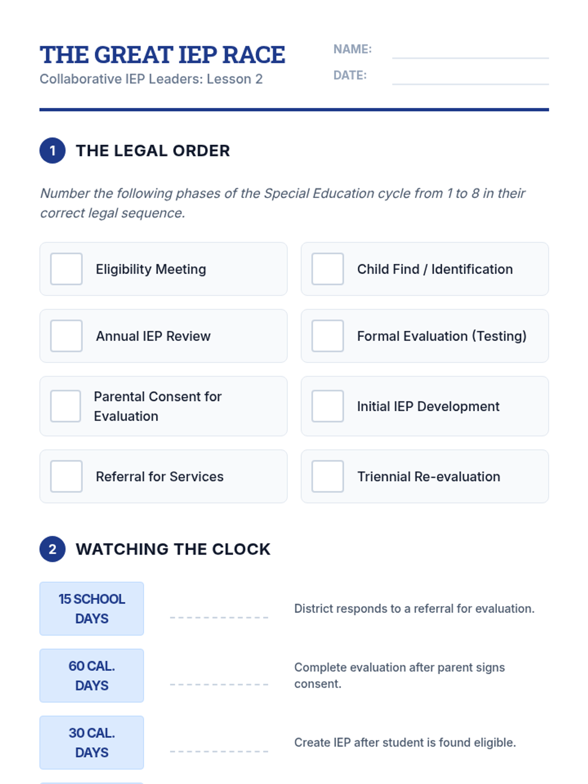 Students map the timeline of special education services from Child Find and Referral to Evaluation, Eligibility, and the Annual Review, understanding federal mandates.