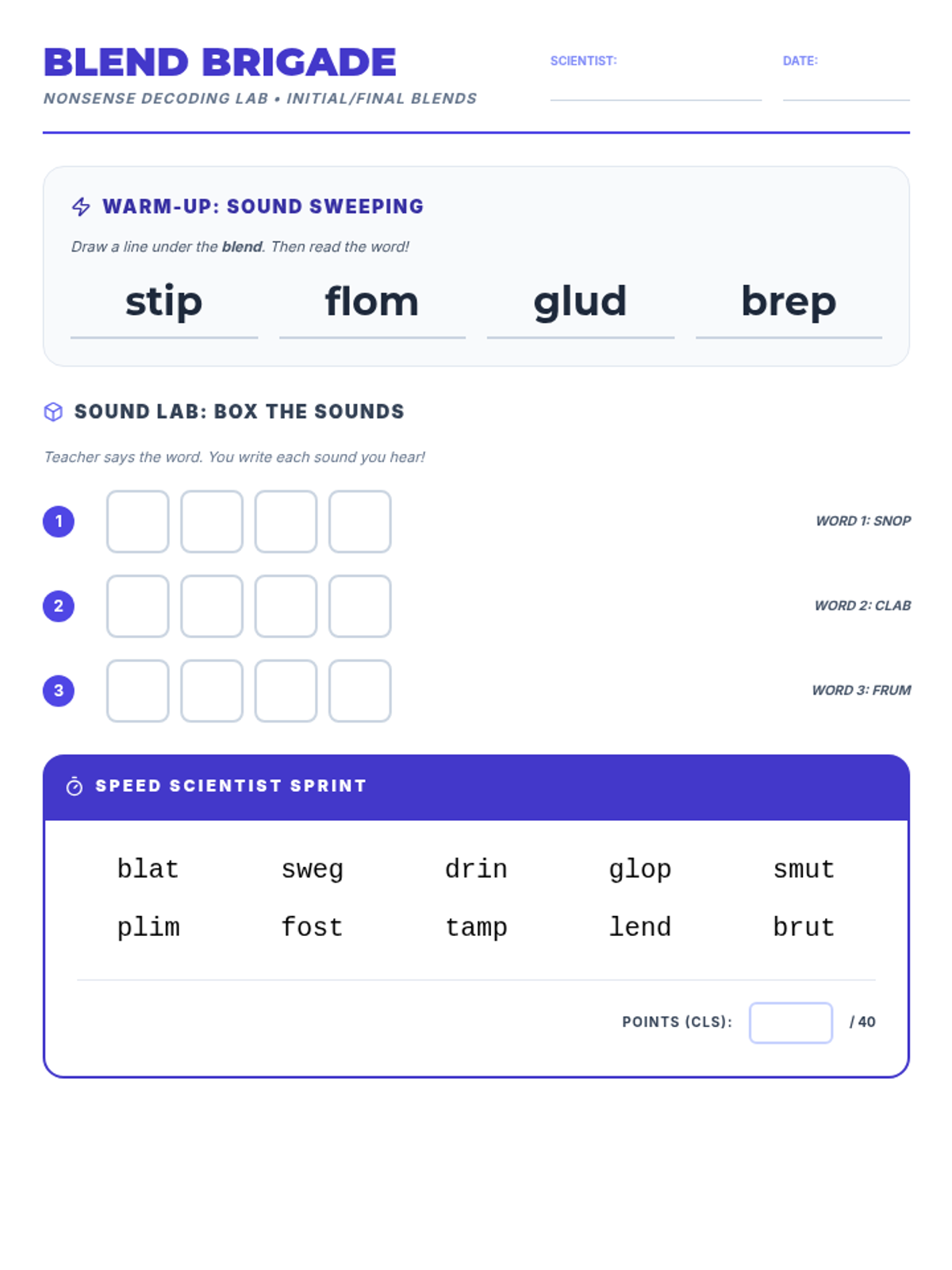 Expands decoding skills to nonsense words with initial and final blends, helping students master complex phonics structures.