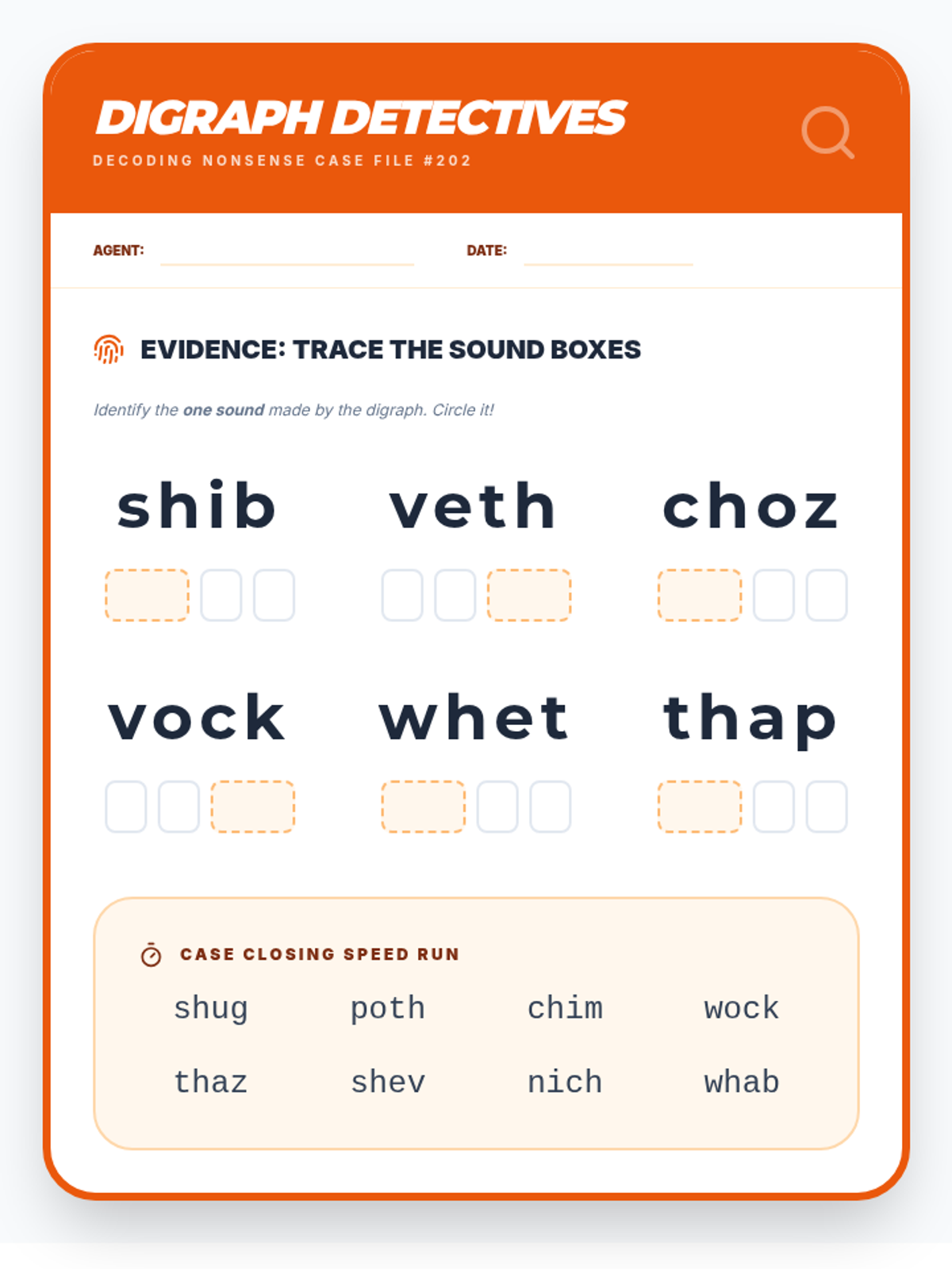Targets common digraphs (sh, ch, th, wh, ck) to ensure students recognize these as single sounds during NWF tasks.