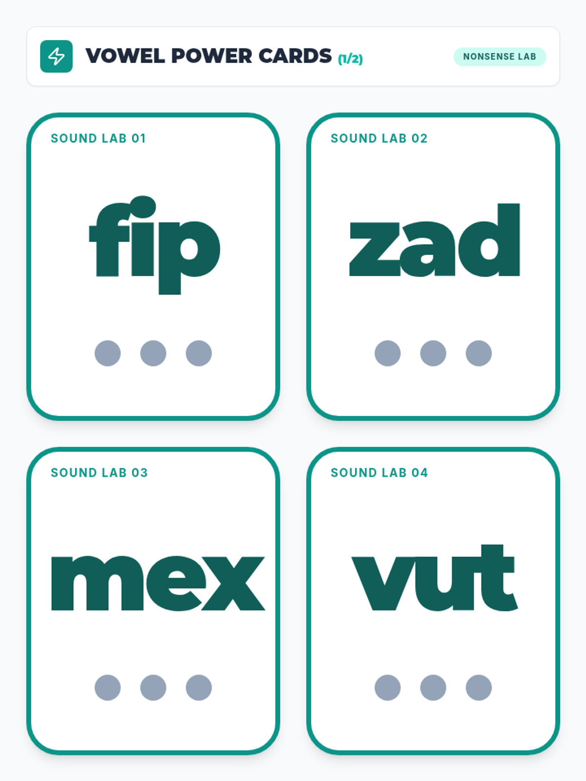 Focuses on decoding nonsense words with CVC (Consonant-Vowel-Consonant) patterns to strengthen short vowel recognition and blending.