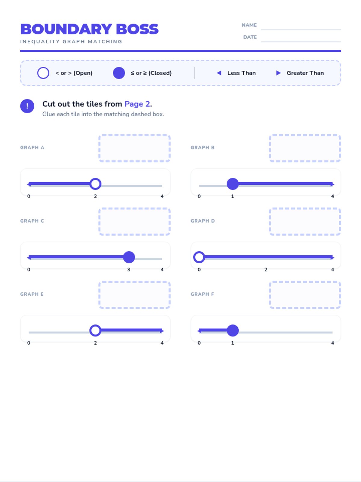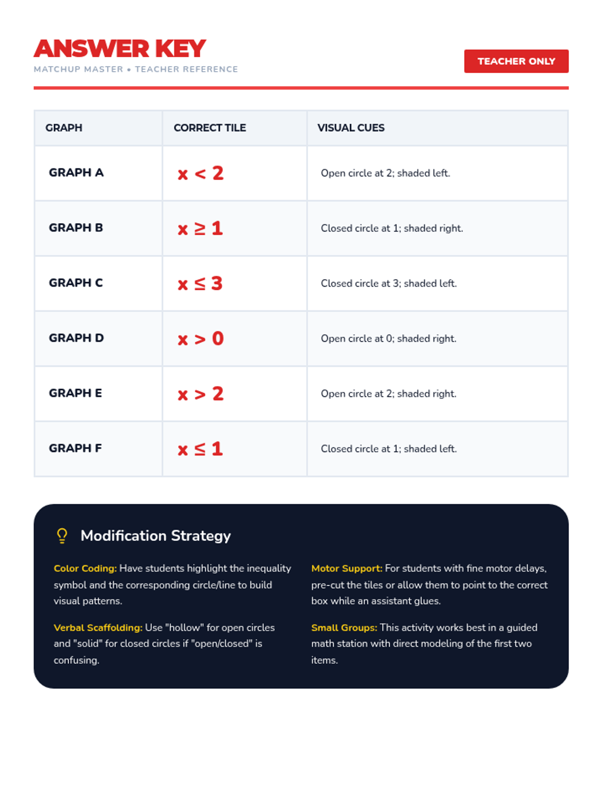 A modified lesson on graphing inequalities specifically designed for students with IEPs, focusing on symbol identification and visual matching. The lesson includes instructional slides, a hands-on cut-and-paste activity, and a teacher answer key.