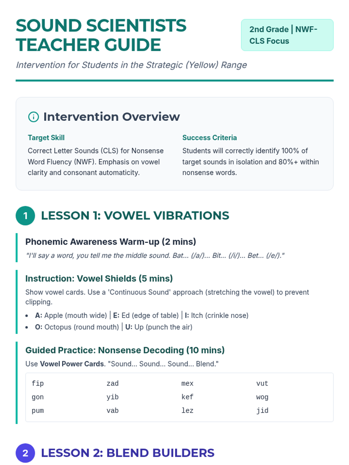Focuses on mastery and automaticity of short vowel sounds within CVC nonsense words to improve CLS scores.