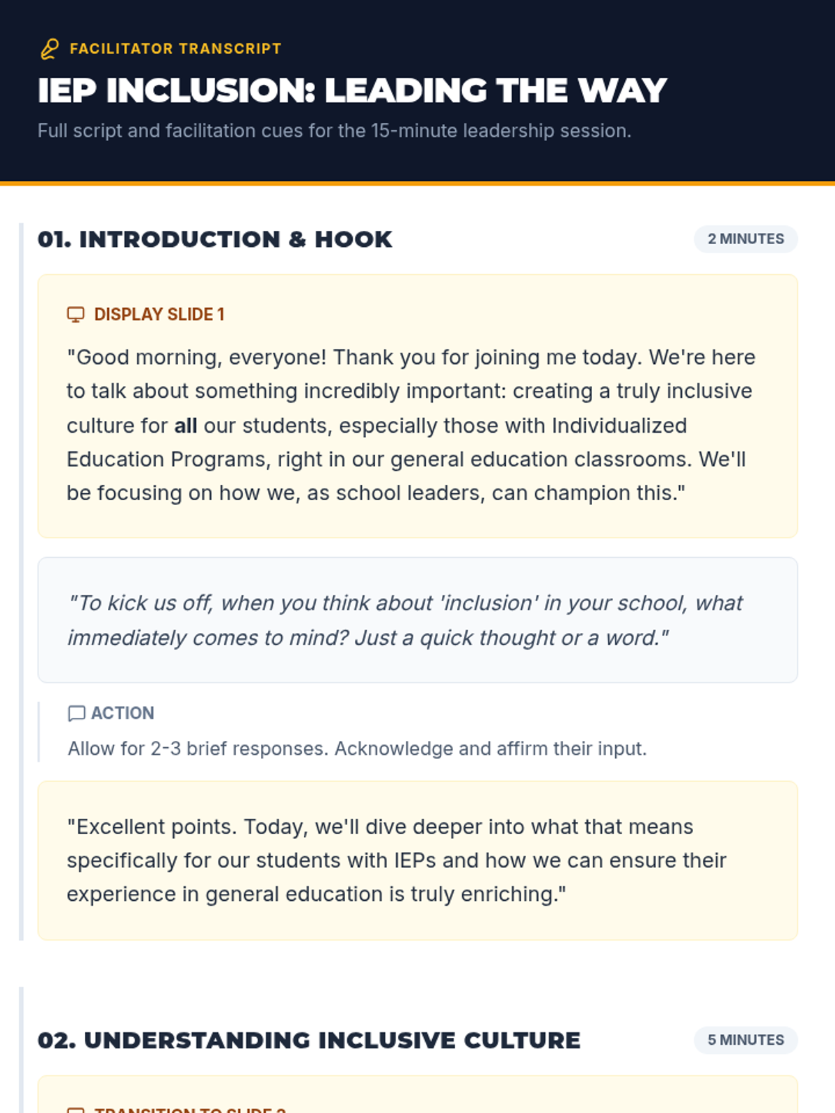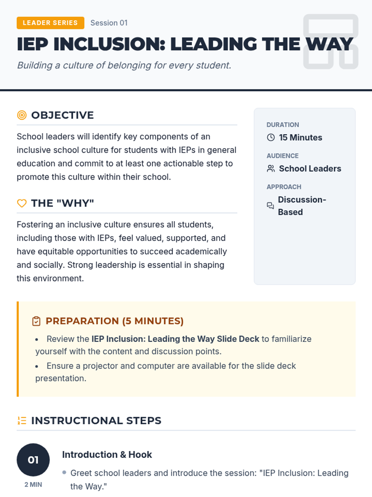 A 15-minute session for school leaders to explore strategies for cultivating an inclusive school culture for students with IEPs in general education settings.