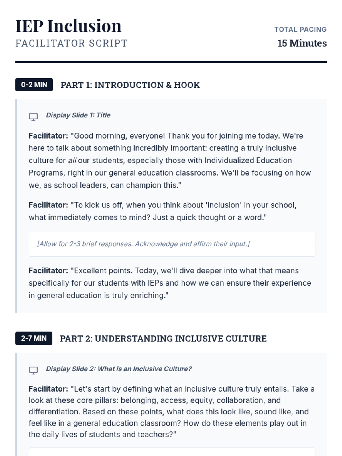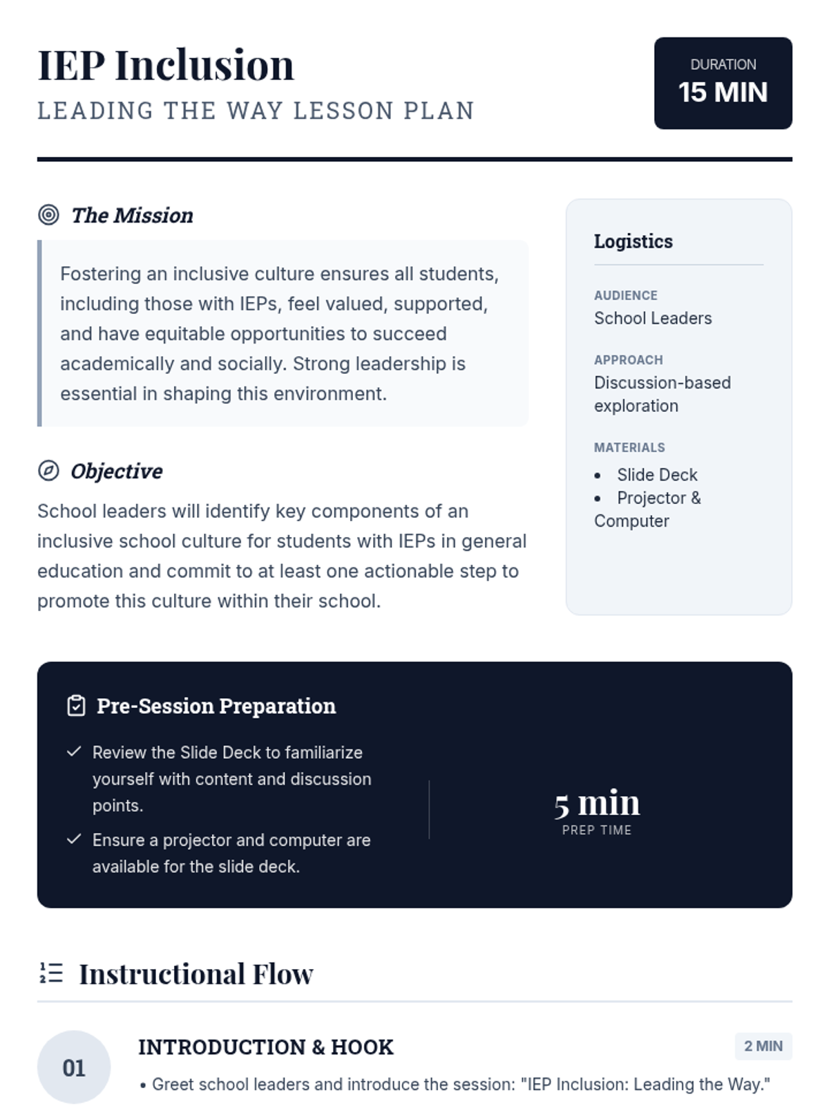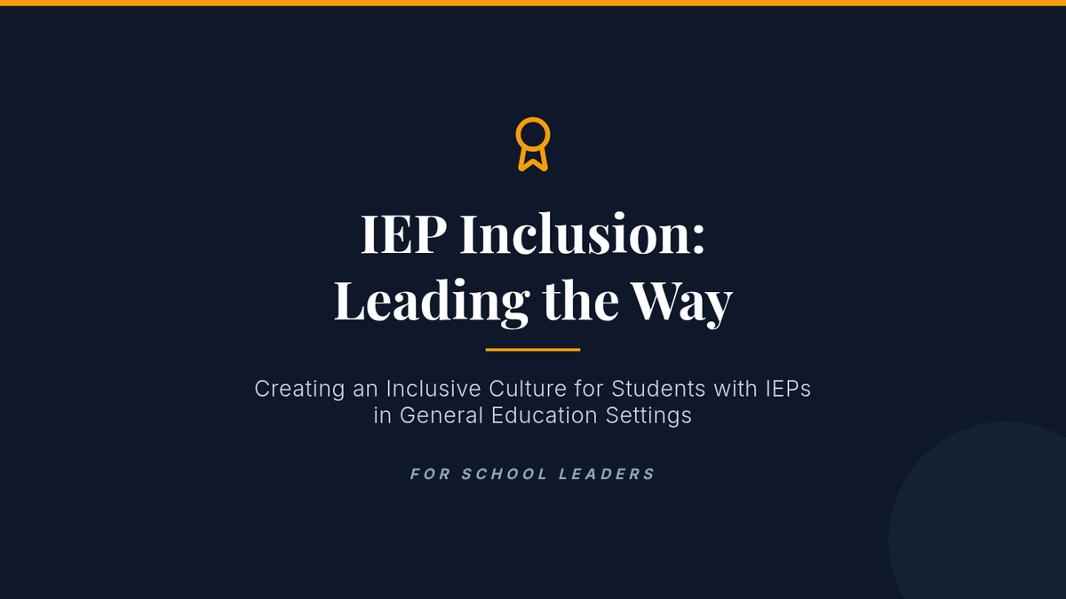 A 15-minute professional development session for school leaders focused on cultivating inclusive school cultures for students with IEPs in general education settings through visionary leadership and actionable support.
