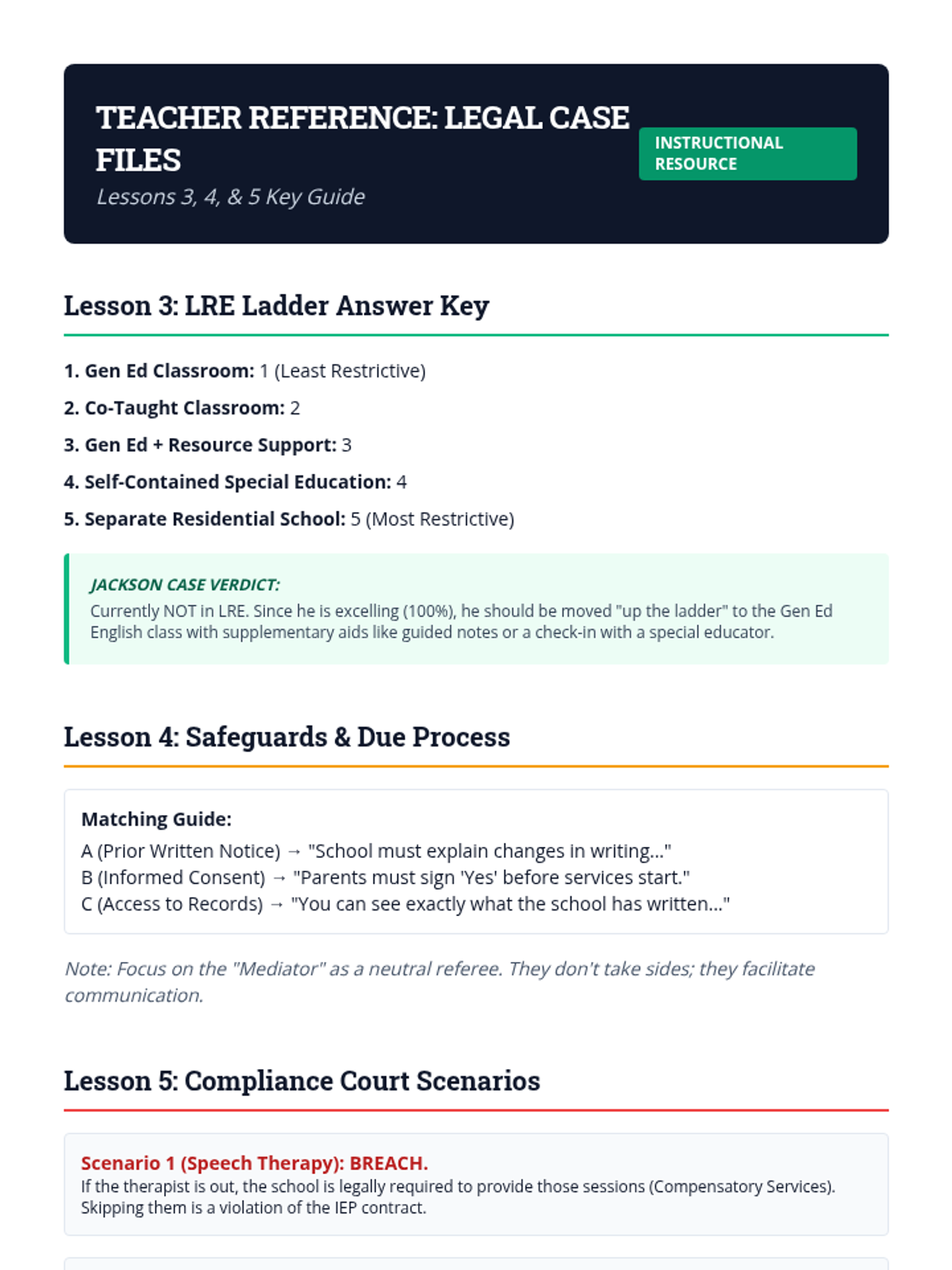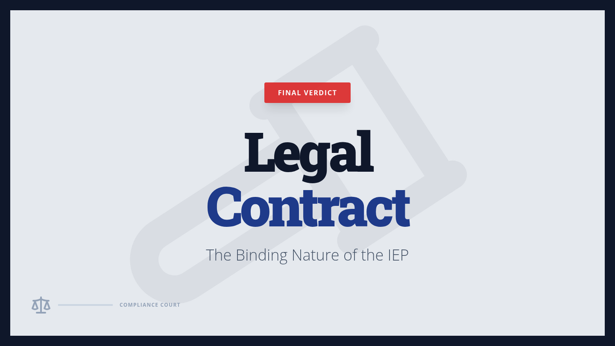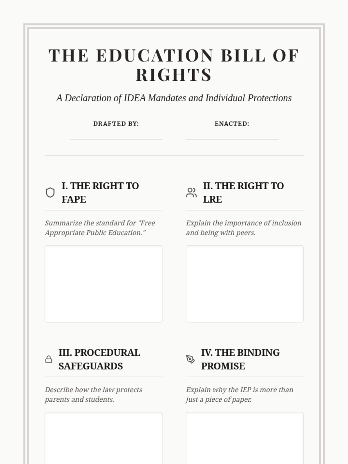 The sequence concludes by viewing the IEP as a binding legal contract. Students analyze compliance scenarios and create a personal 'Bill of Rights' to summarize their learning.