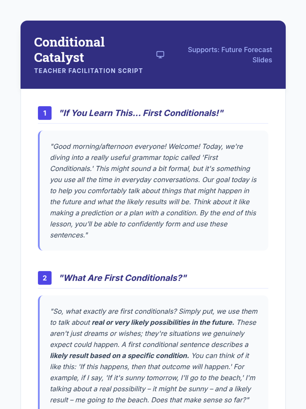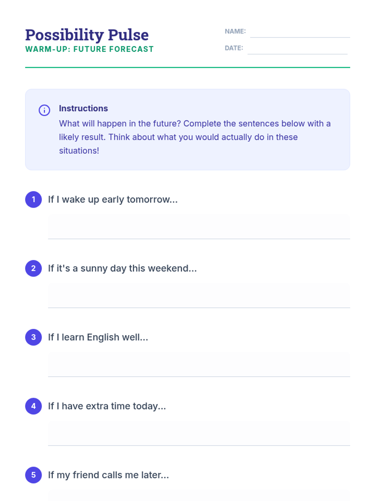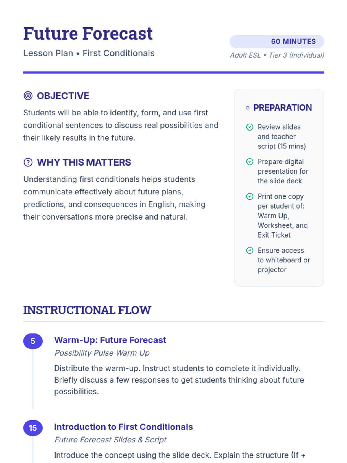 A comprehensive 60-minute Tier 3 lesson for adult ESL students on mastering first conditionals to discuss future possibilities and outcomes.