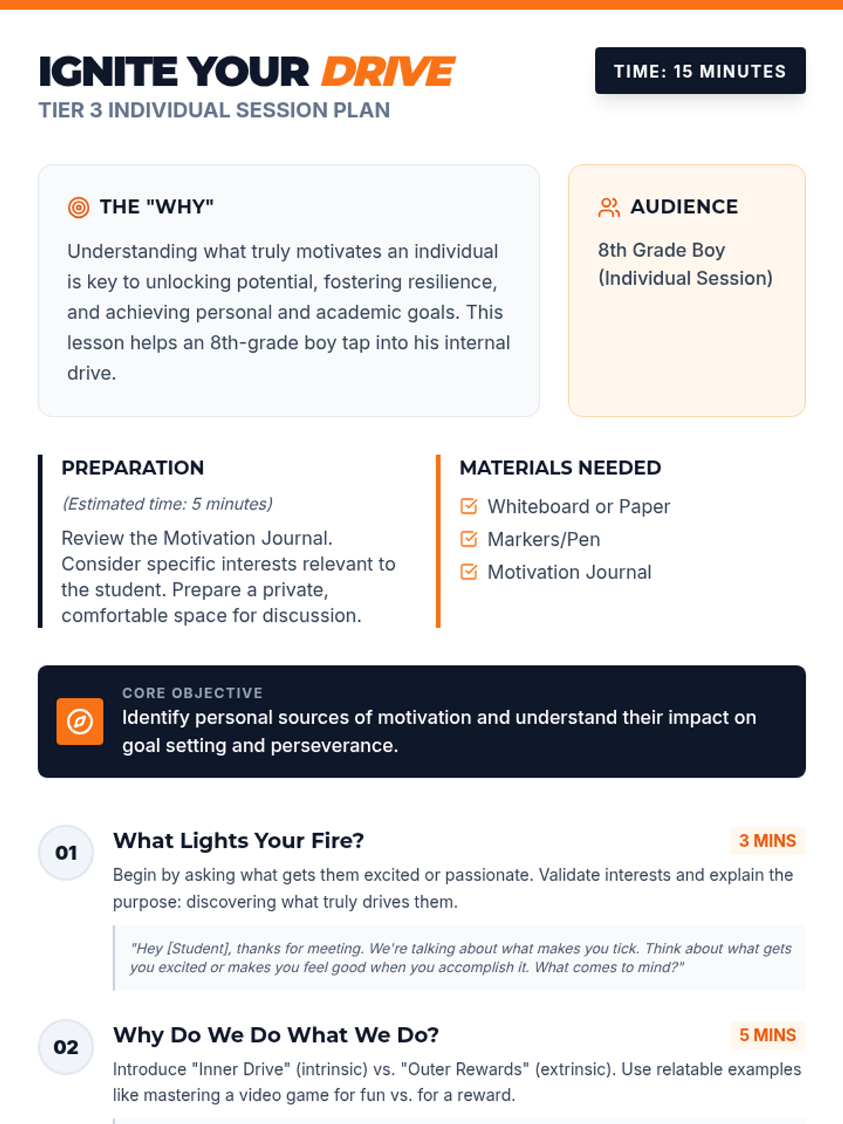 A 15-minute Tier 3 individual session designed for 8th-grade students to explore intrinsic motivation, understand personal 'why', and connect their internal drive to academic and personal goals.