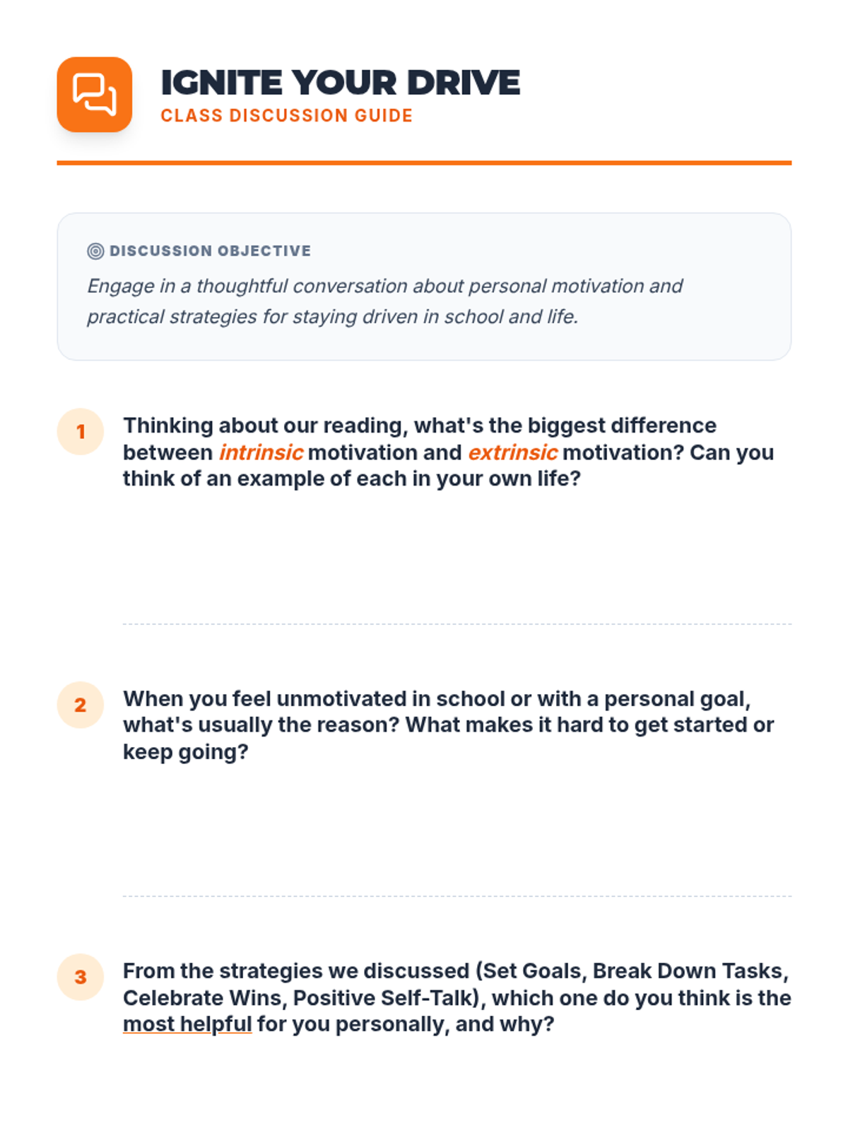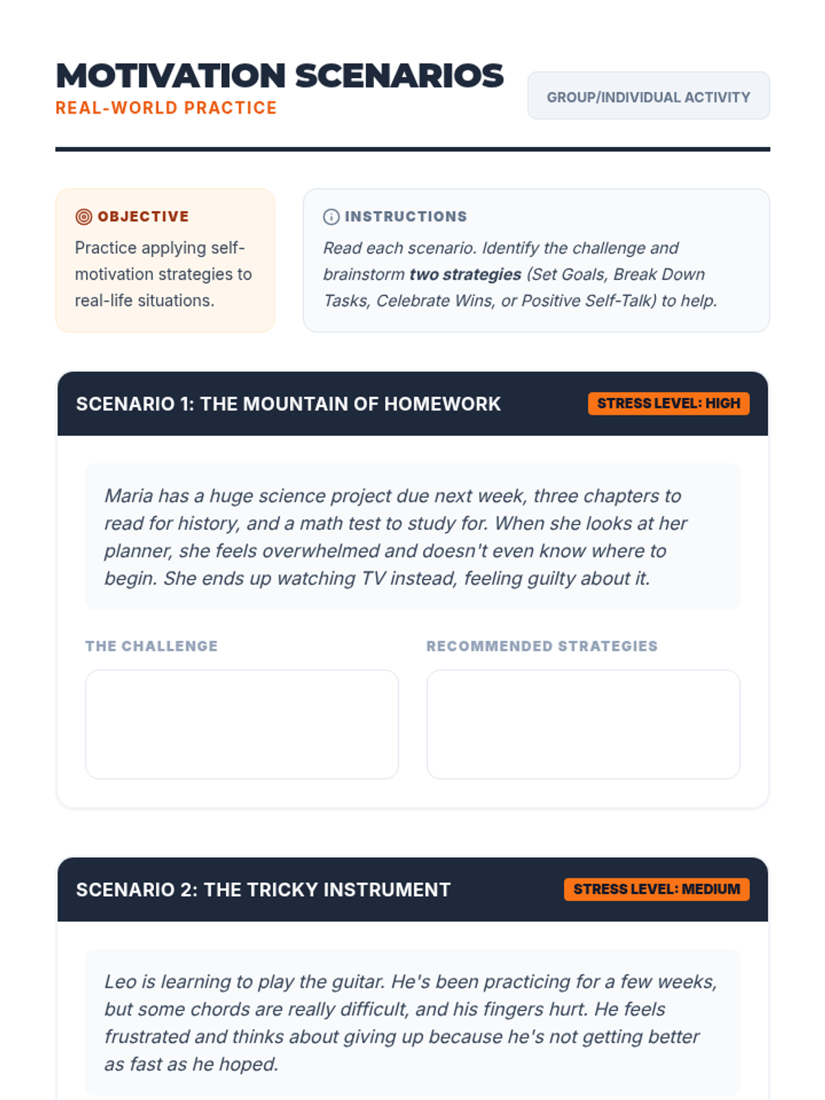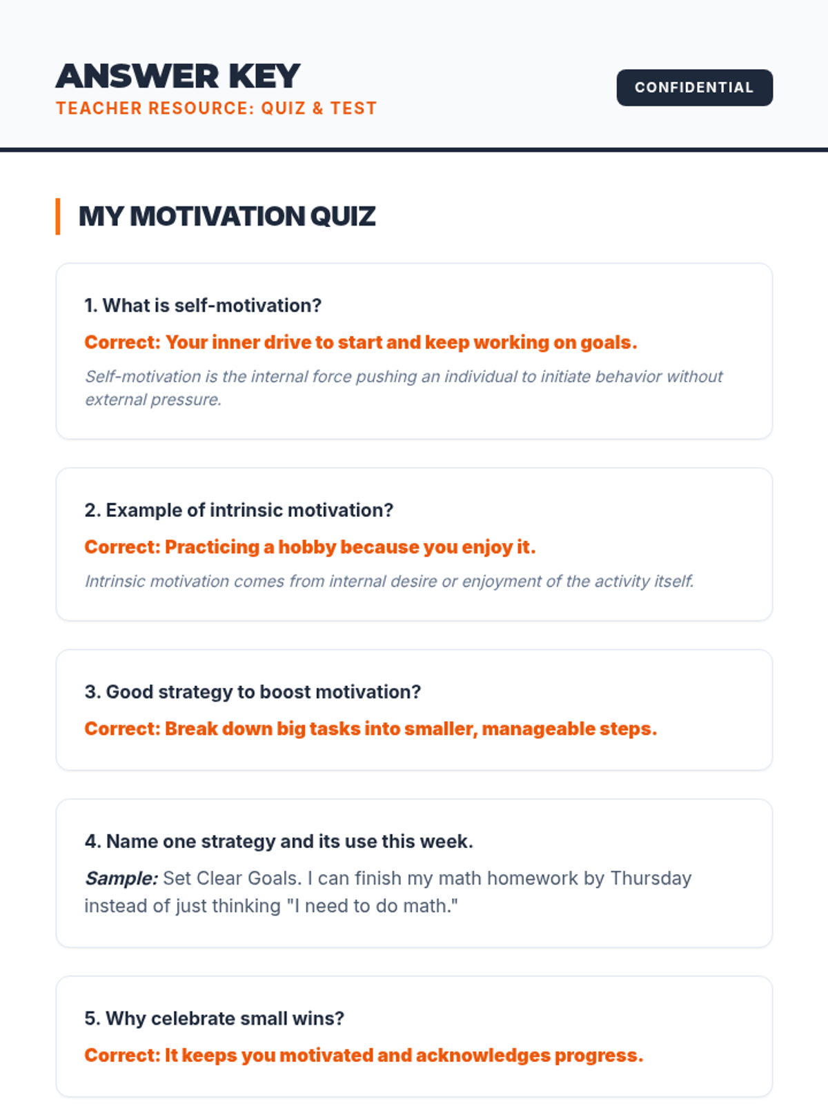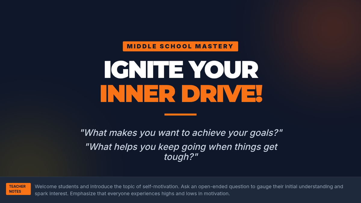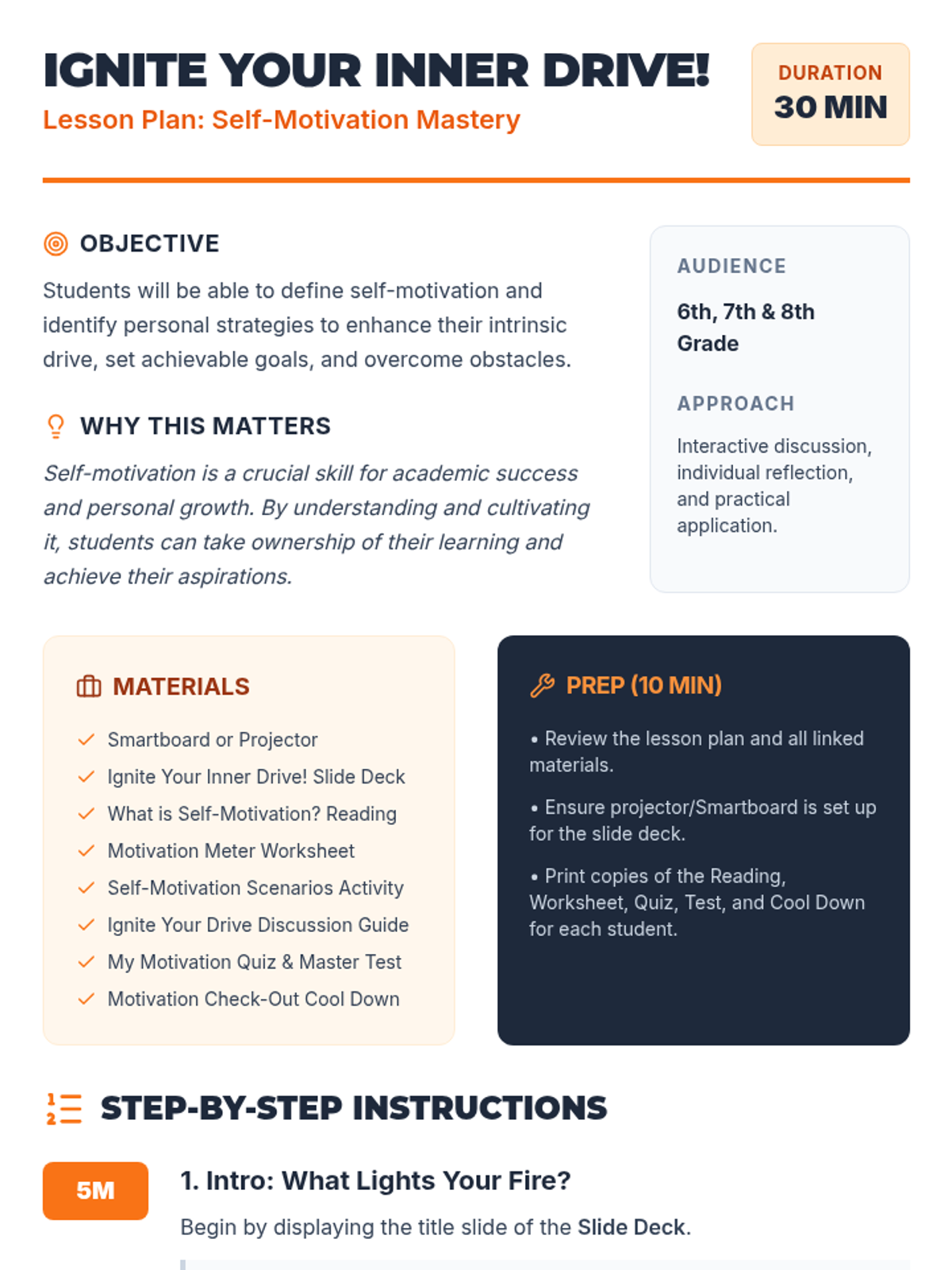 A 30-minute lesson for middle schoolers to understand and develop self-motivation through interactive activities, goal-setting strategies, and reflection.