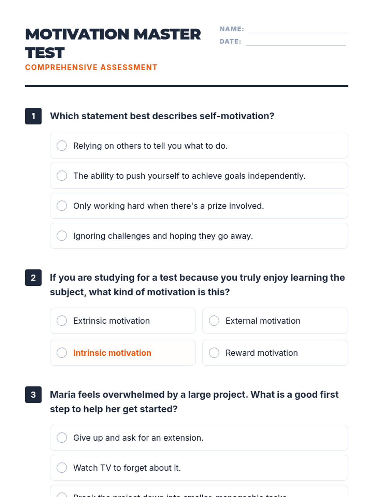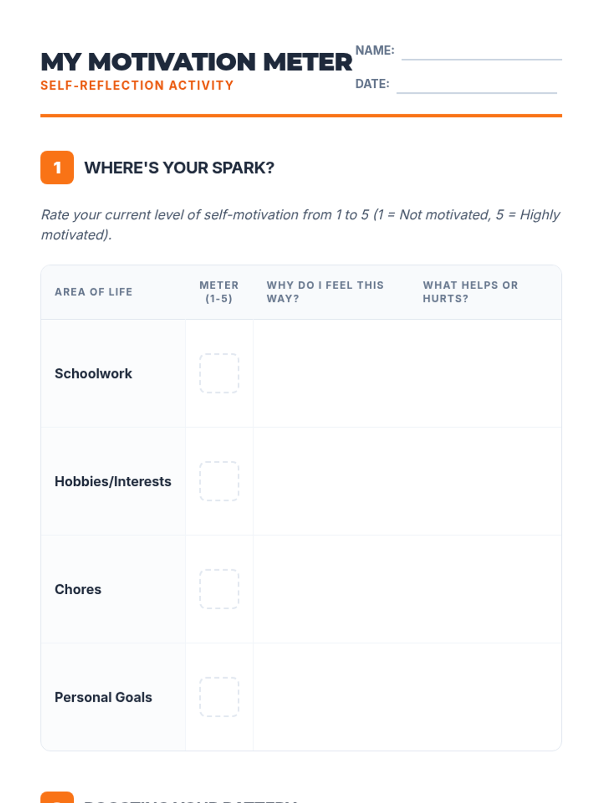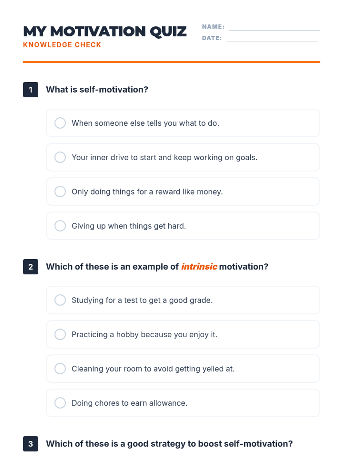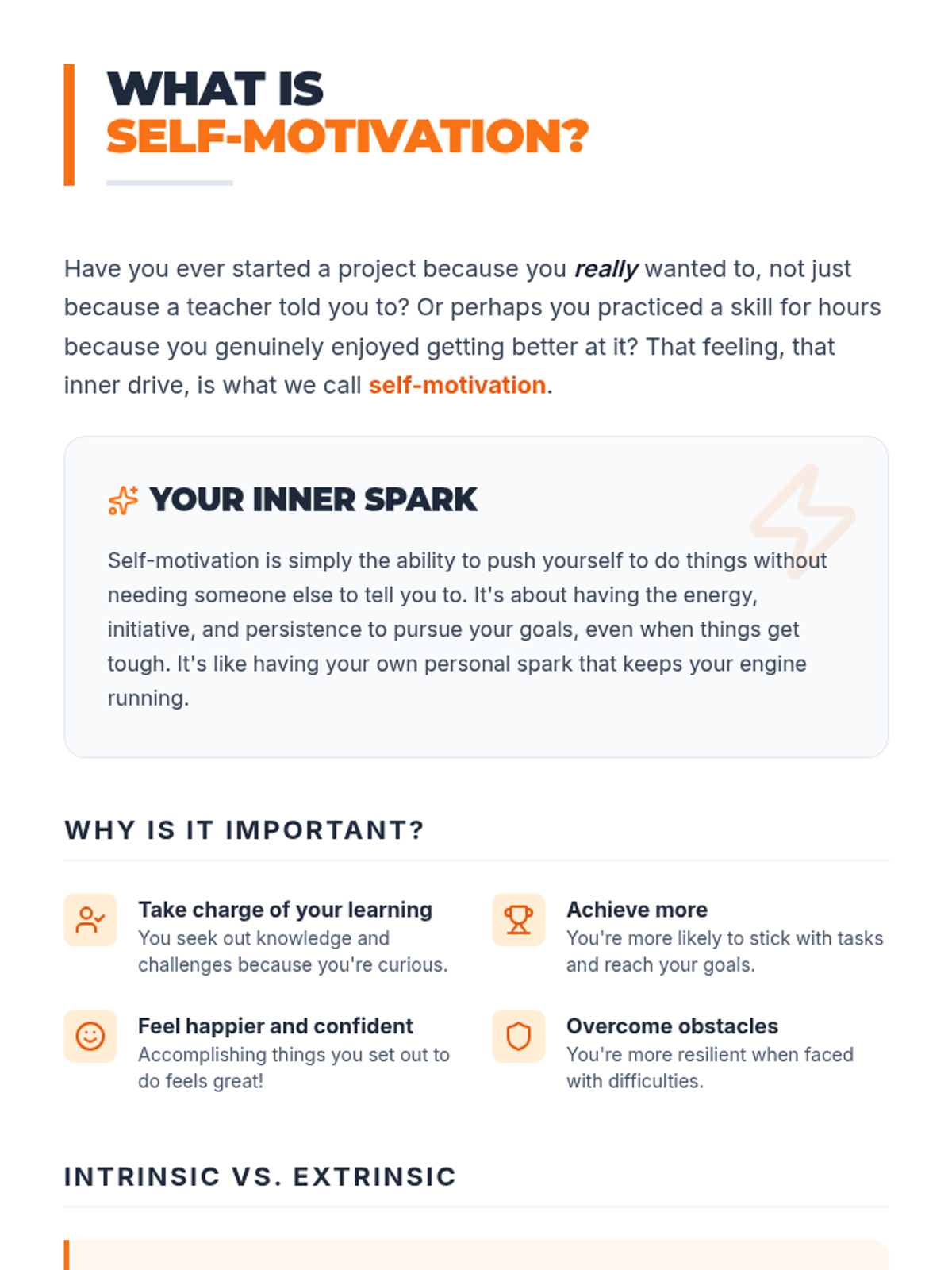 A 30-minute lesson for middle schoolers to understand and develop self-motivation through interactive activities, goal-setting strategies, and reflection.