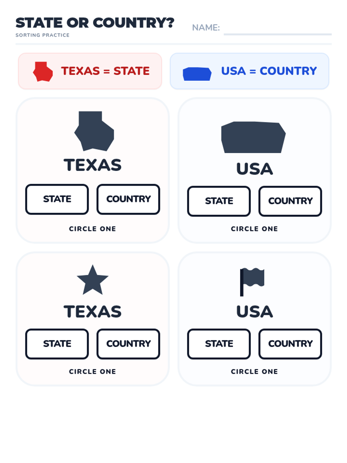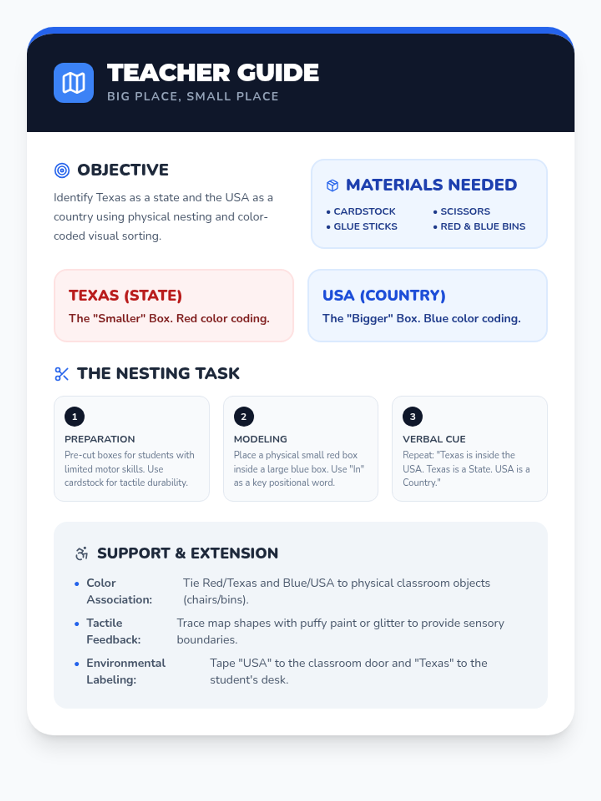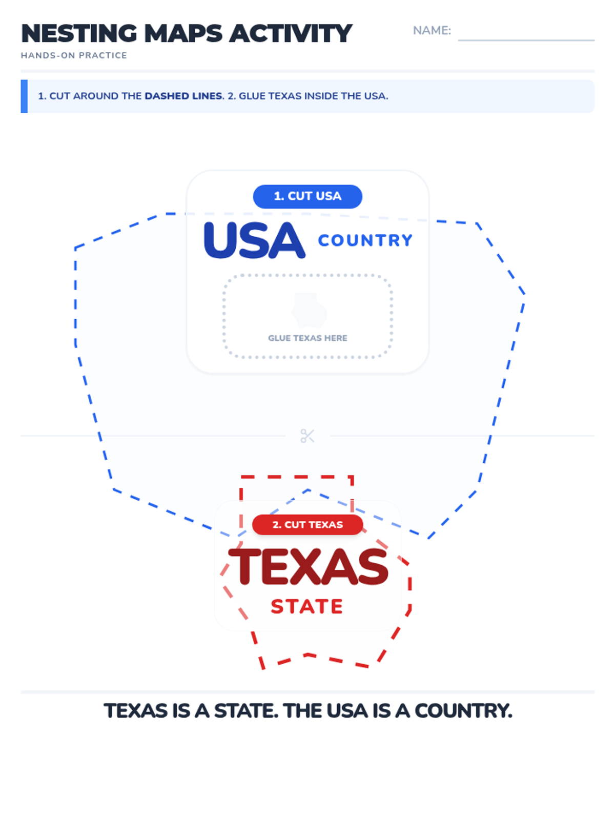 A foundational geography lesson designed for early emergent learners to distinguish between their state (Texas) and their country (USA) using visual nesting and simple categorization.