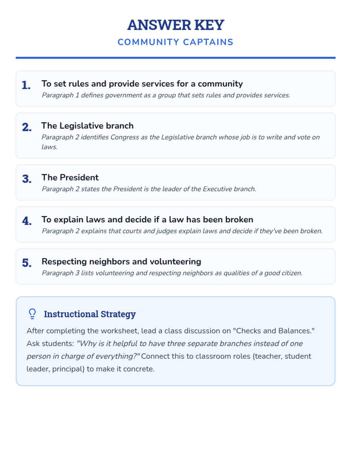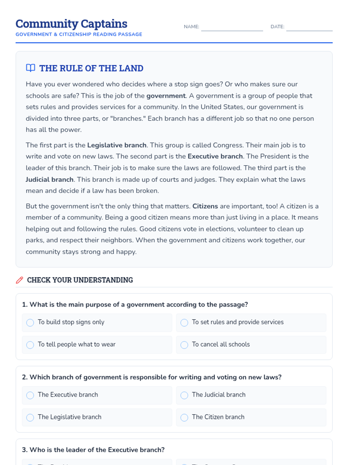 A lesson focused on the fundamentals of US government branches and the responsibilities of being a good citizen, designed for 3rd grade students.