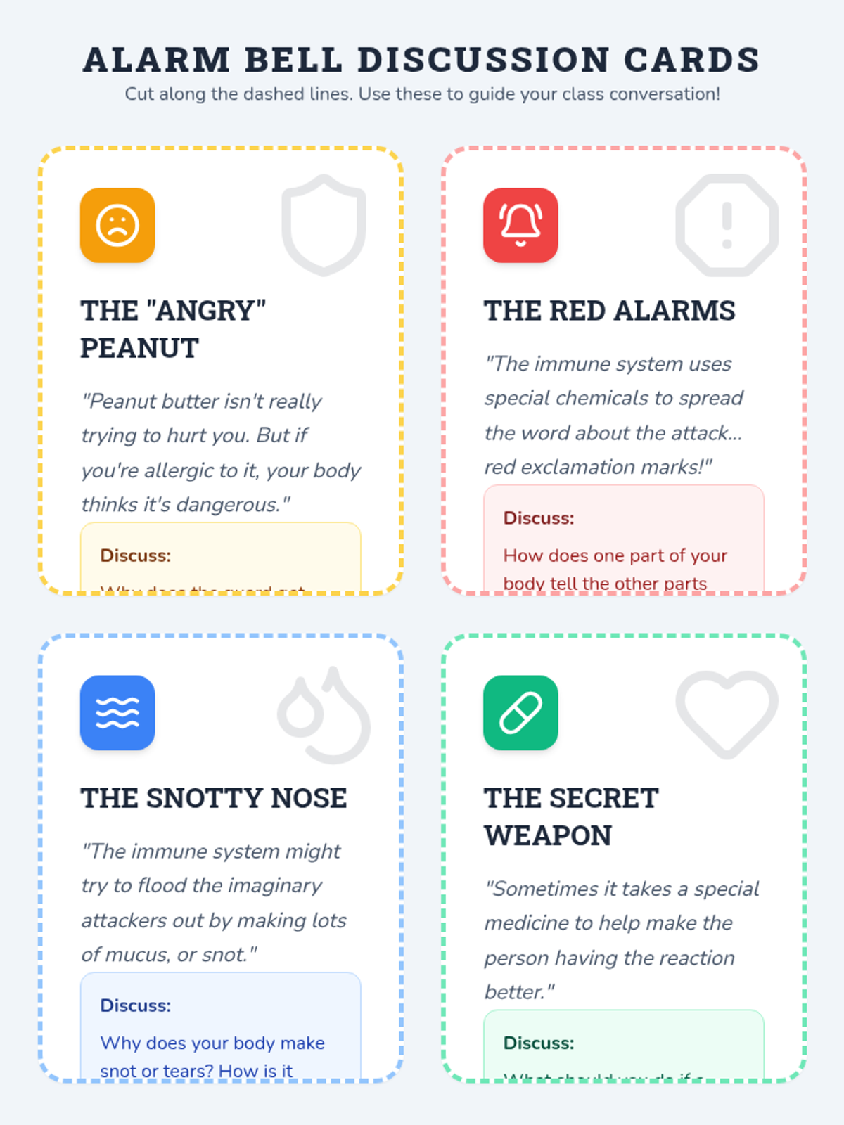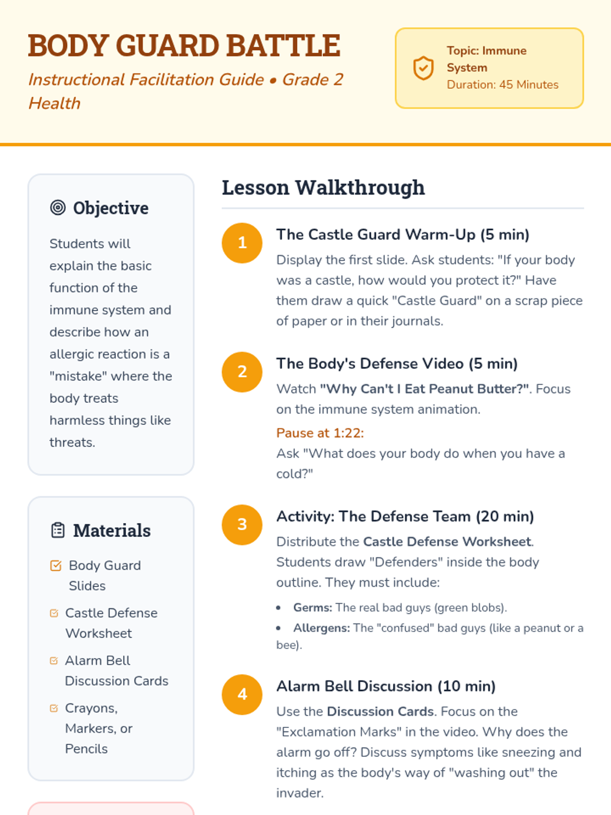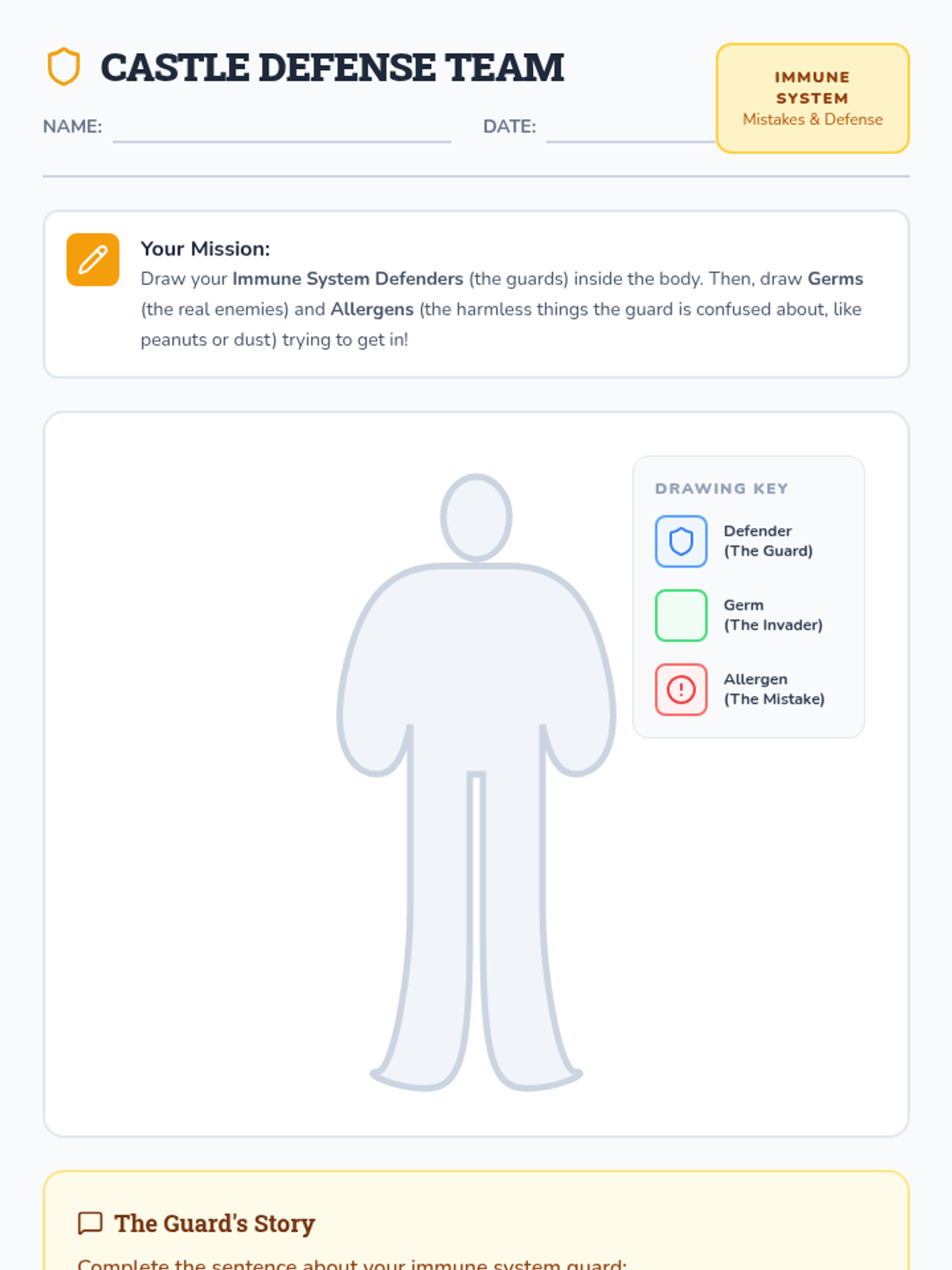 Students will learn how the immune system protects the body from germs and why it sometimes makes mistakes (allergies) by comparing it to a castle guard.