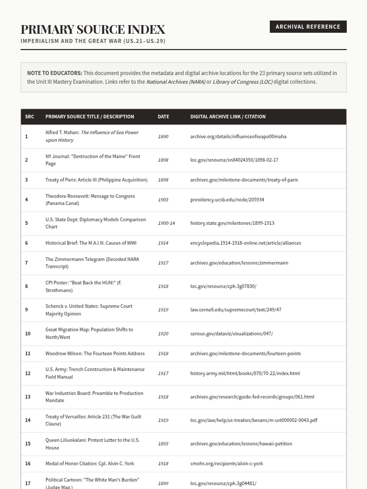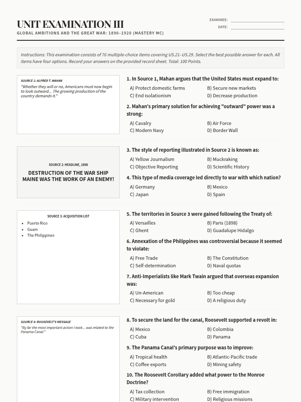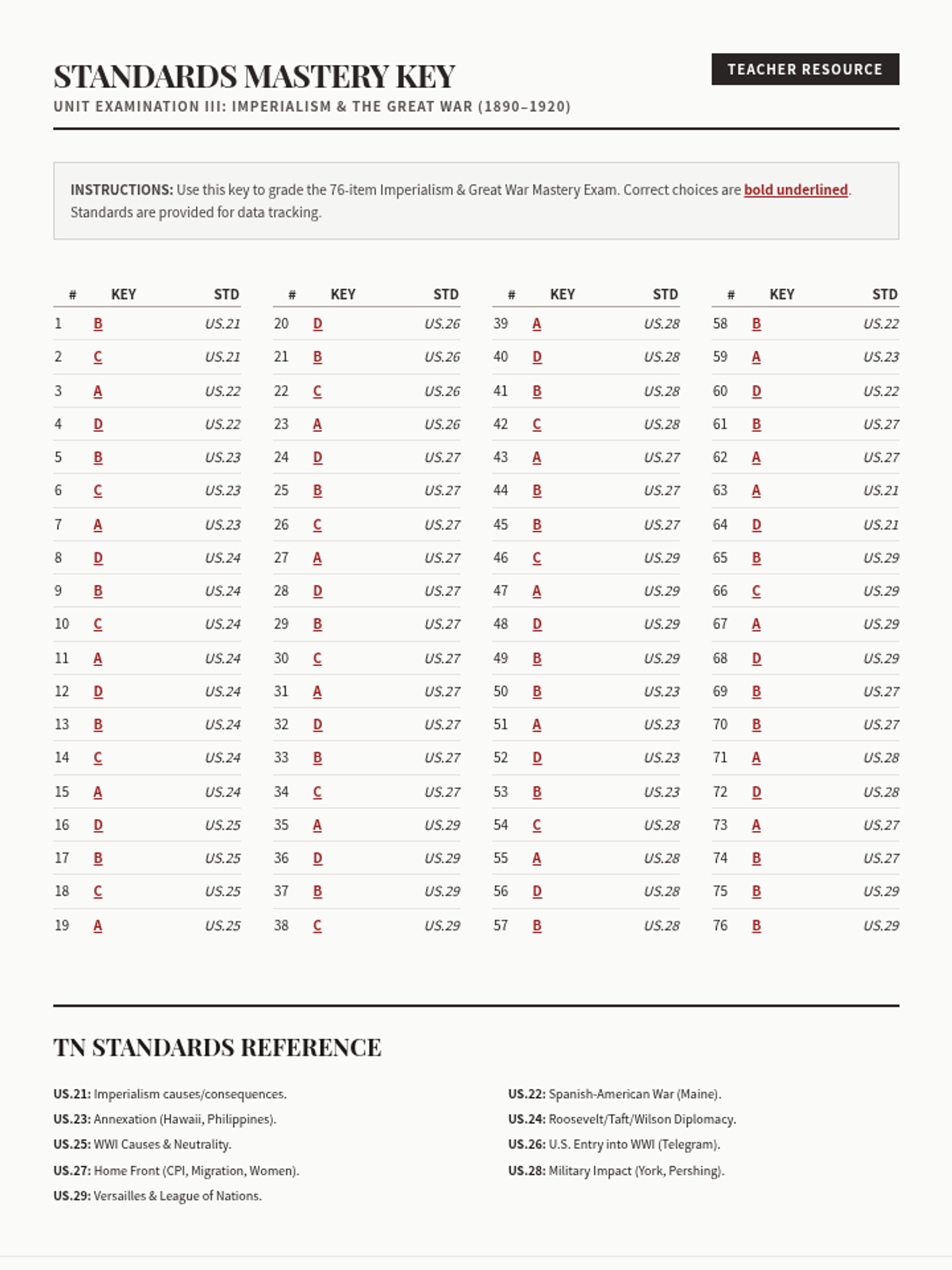 A comprehensive assessment module covering American Imperialism and World War I (US.21-US.29). Features a 76-question stimulus-based exam and a corresponding teacher key mapped to state standards.