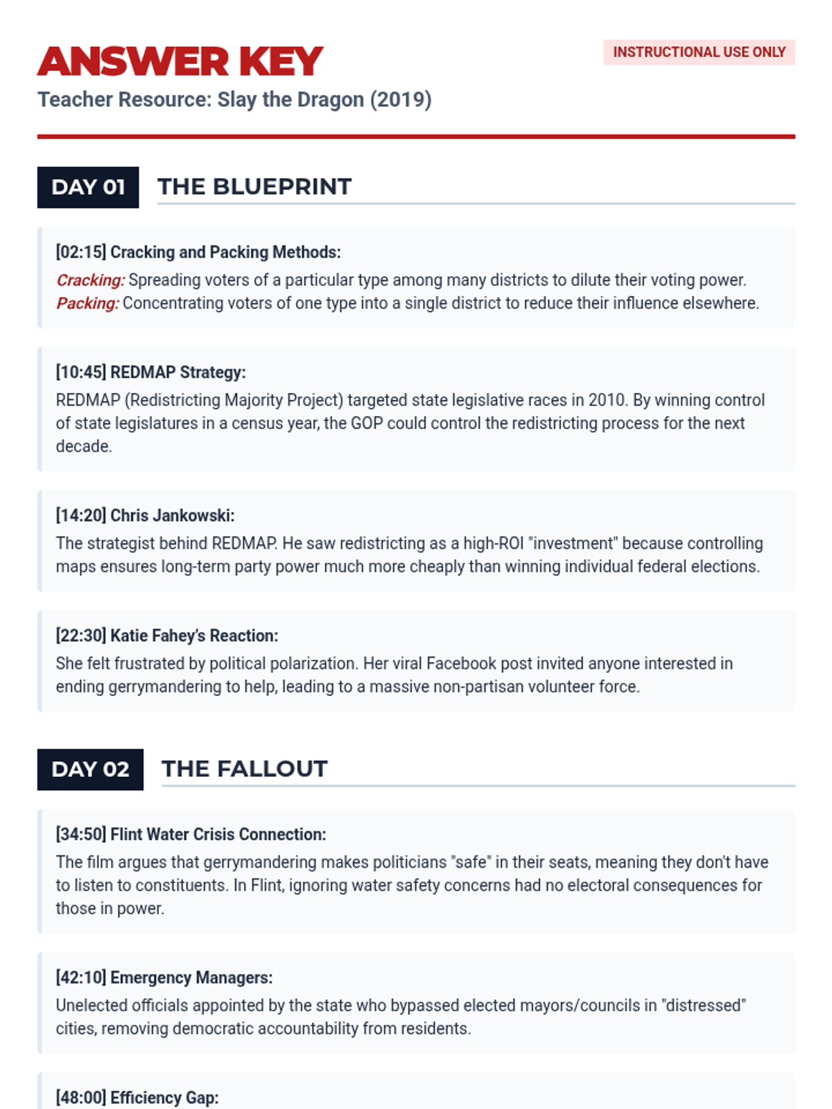 A three-day exploration of partisan gerrymandering using the documentary 'Slay the Dragon'. Students will examine the REDMAP strategy, the Flint water crisis connection, and the grassroots activism of Katie Fahey and Voters Not Politicians.