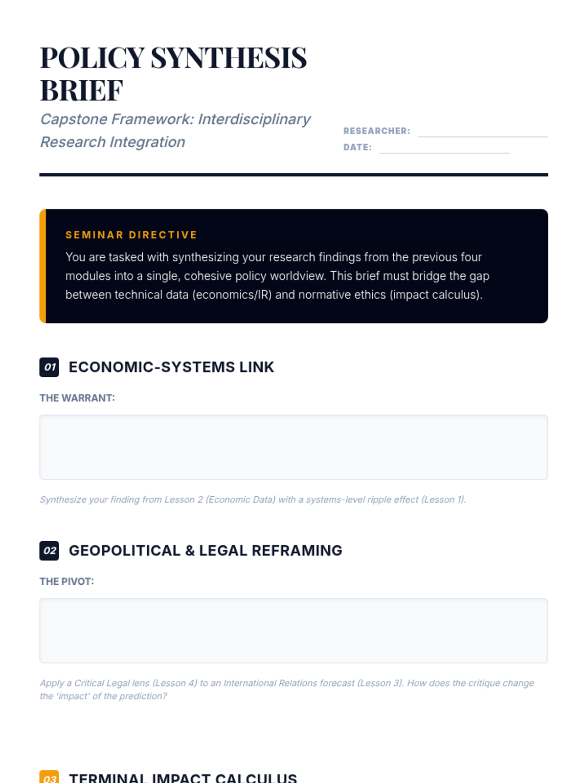 The final lesson focuses on researching 'impact calculus'—how to weigh lives saved against economic growth, or freedom against security. Students find philosophical and utilitarian evidence to support specific weighing mechanisms.