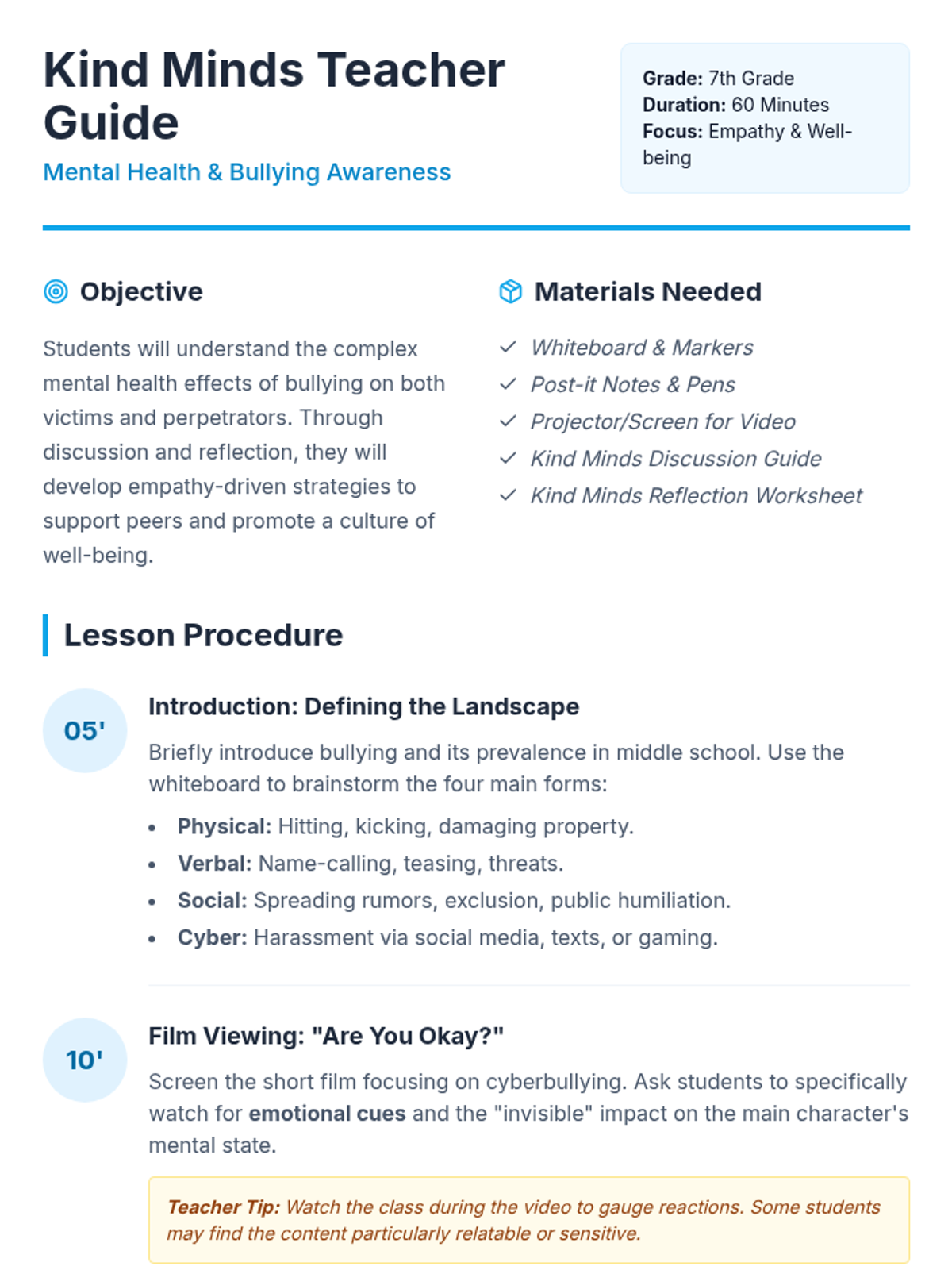 A comprehensive lesson for 7th-grade students exploring the mental health consequences of bullying and developing empathy-driven strategies for support.