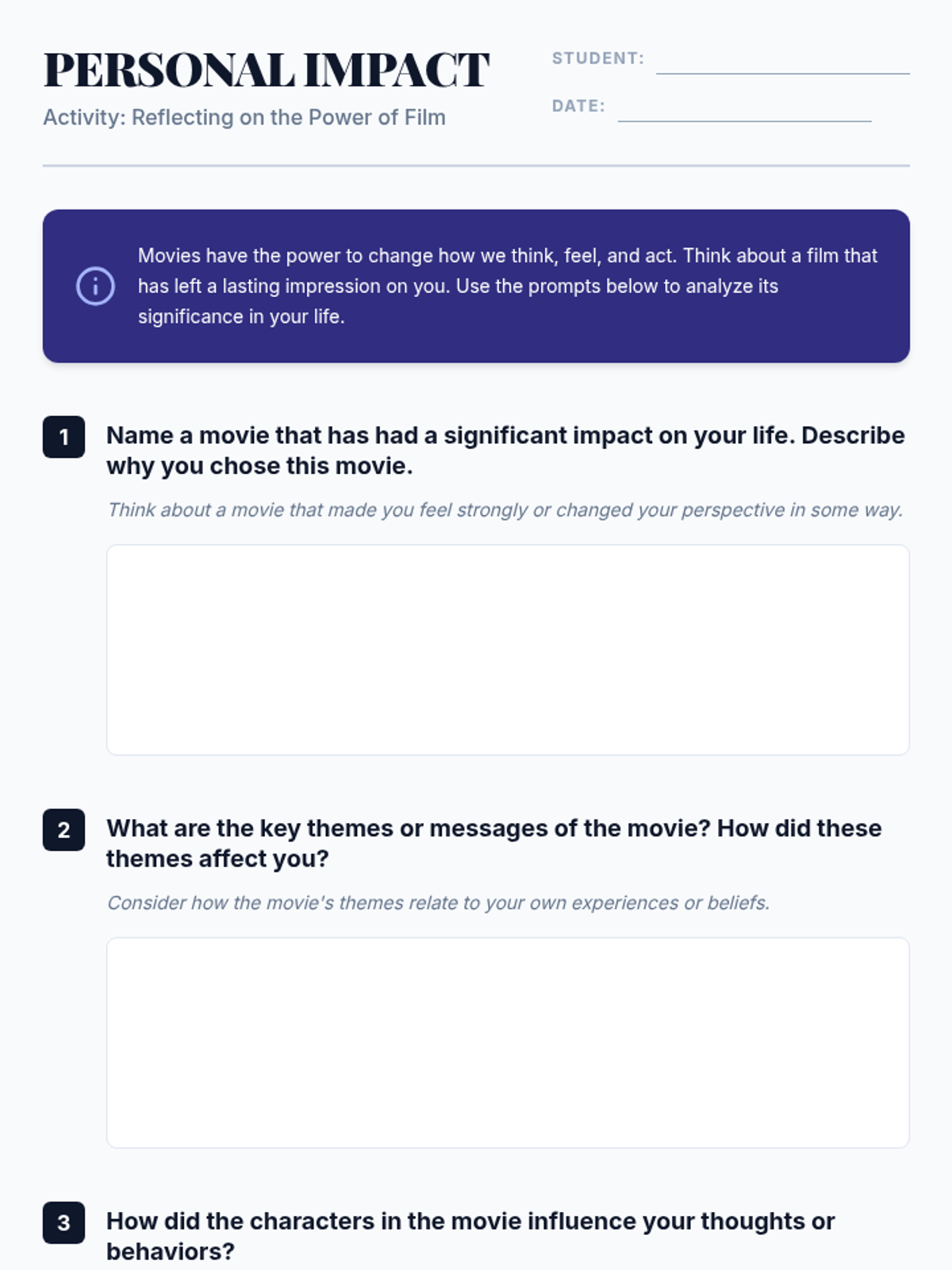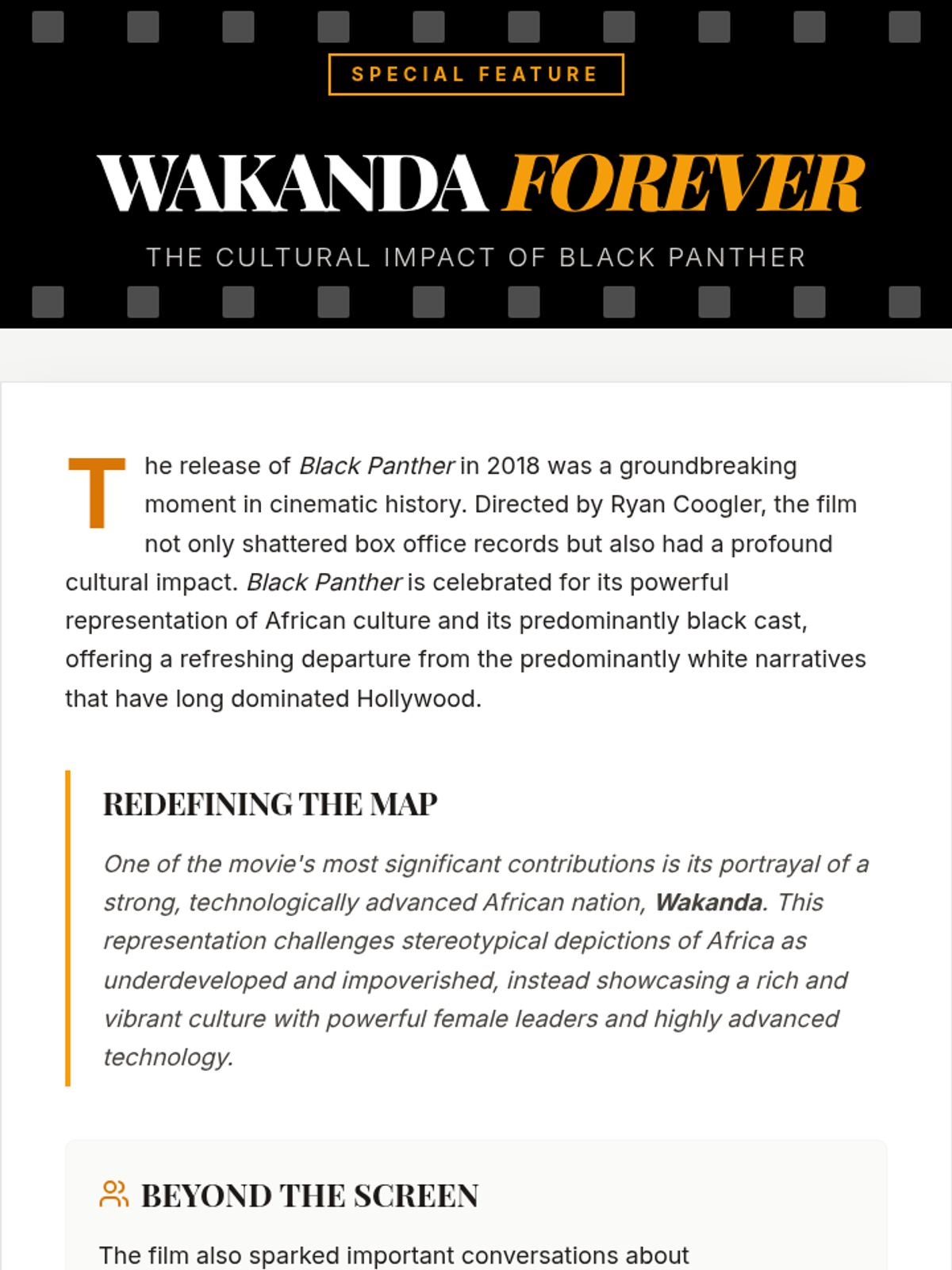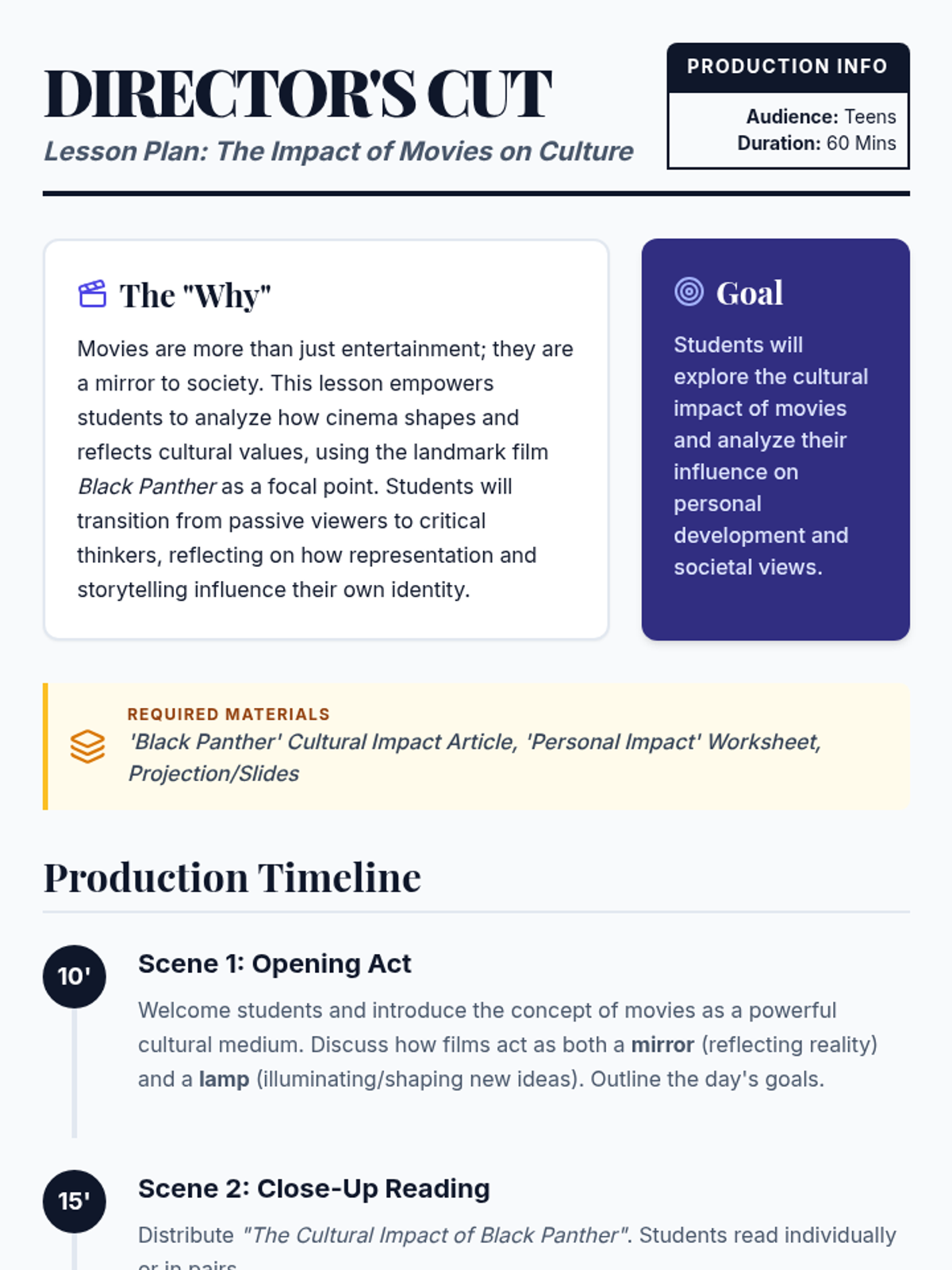 A lesson exploring how cinema shapes and reflects cultural values, using 'Black Panther' as a case study for representation and societal impact.