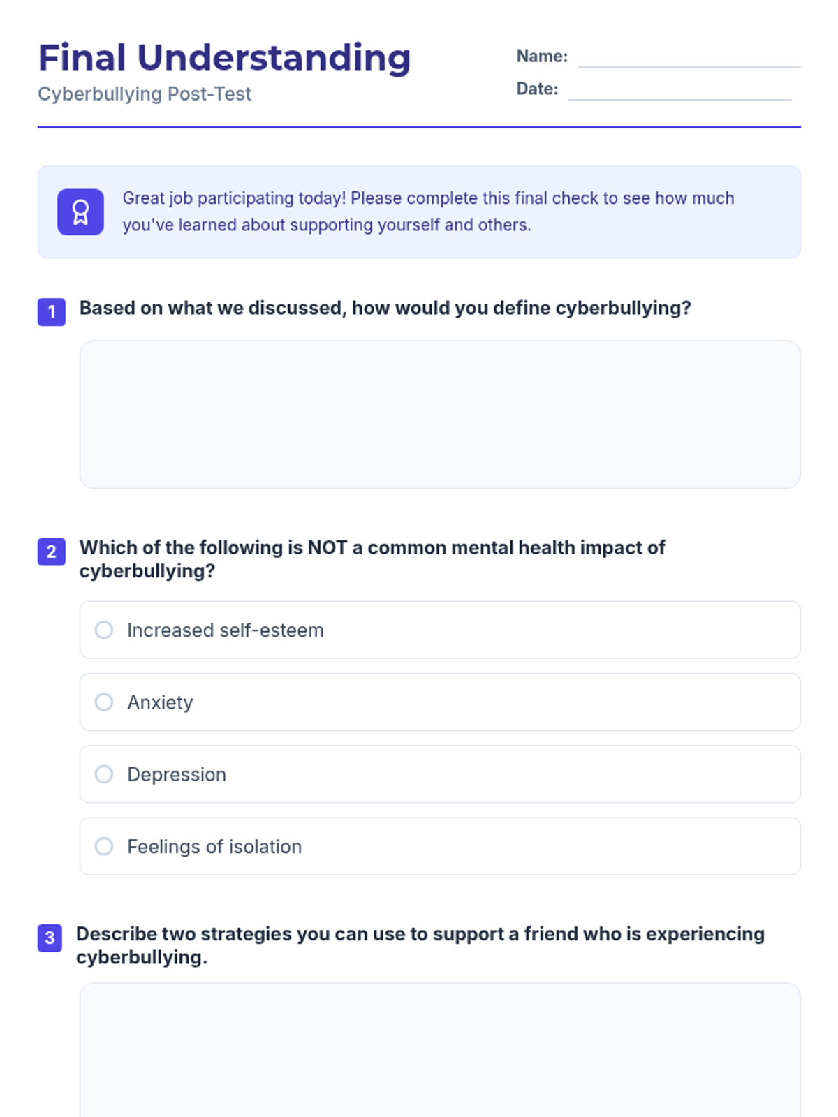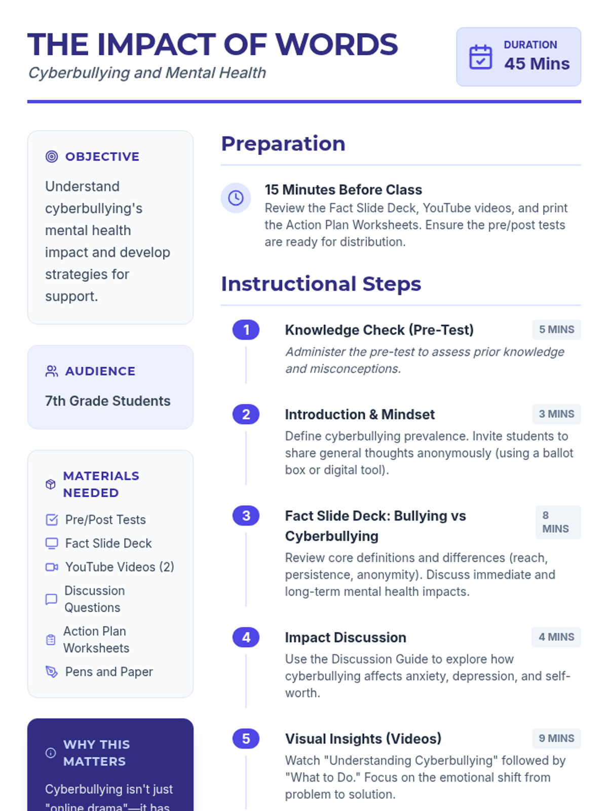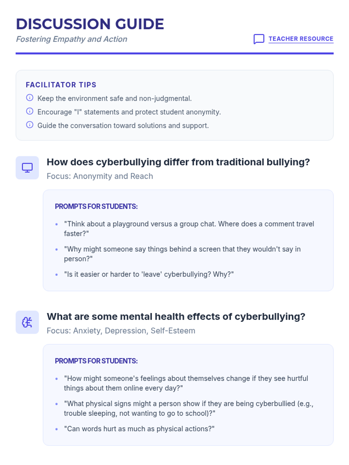 This lesson explores the impact of cyberbullying on mental health, encouraging students to reflect on their own experiences and develop resilience through action planning and discussion.