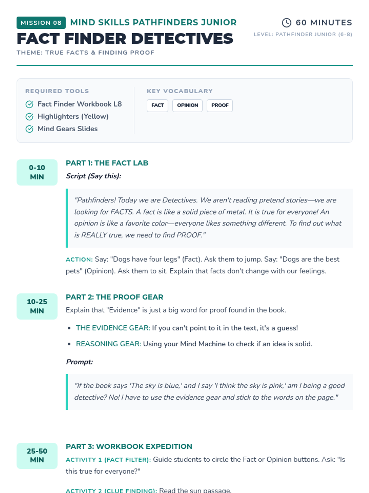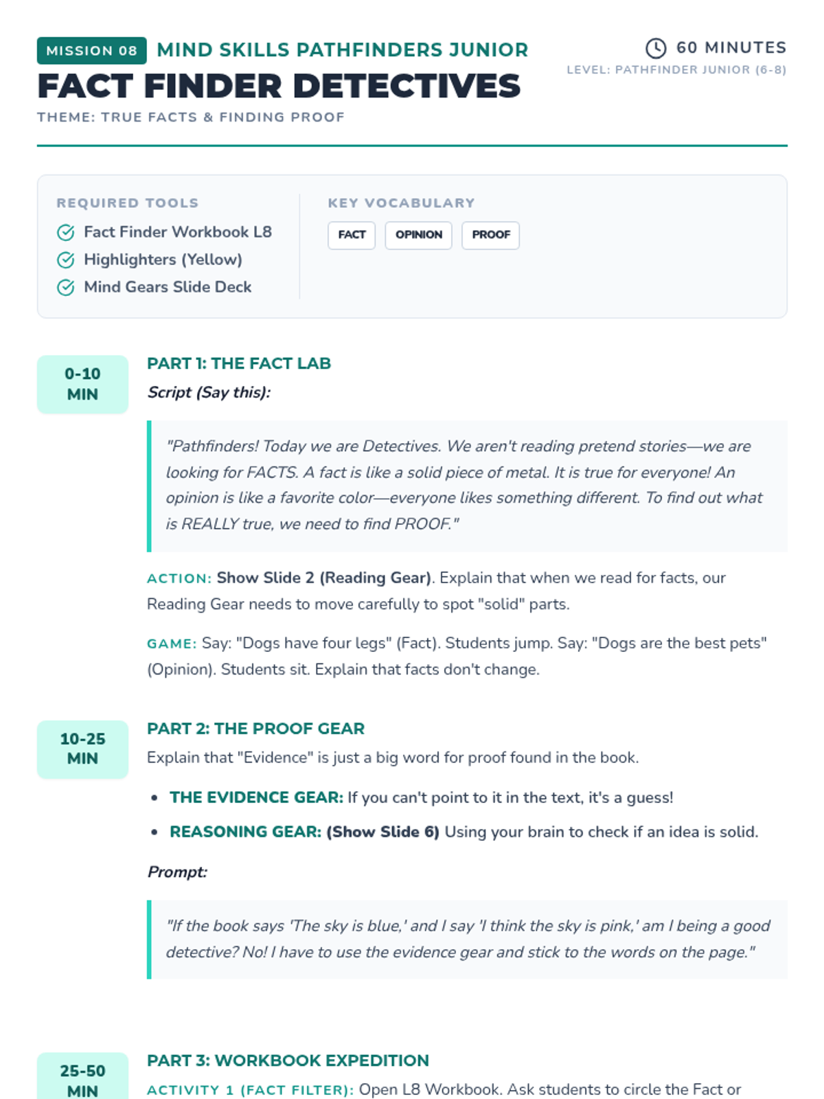 Develops information decoding skills by teaching students to search for facts and evidence within a text, much like a forensic scientist.