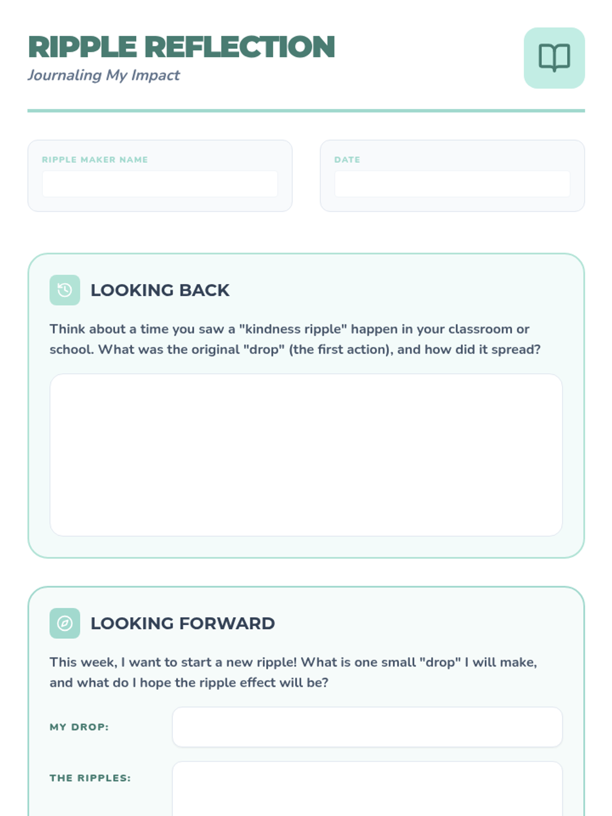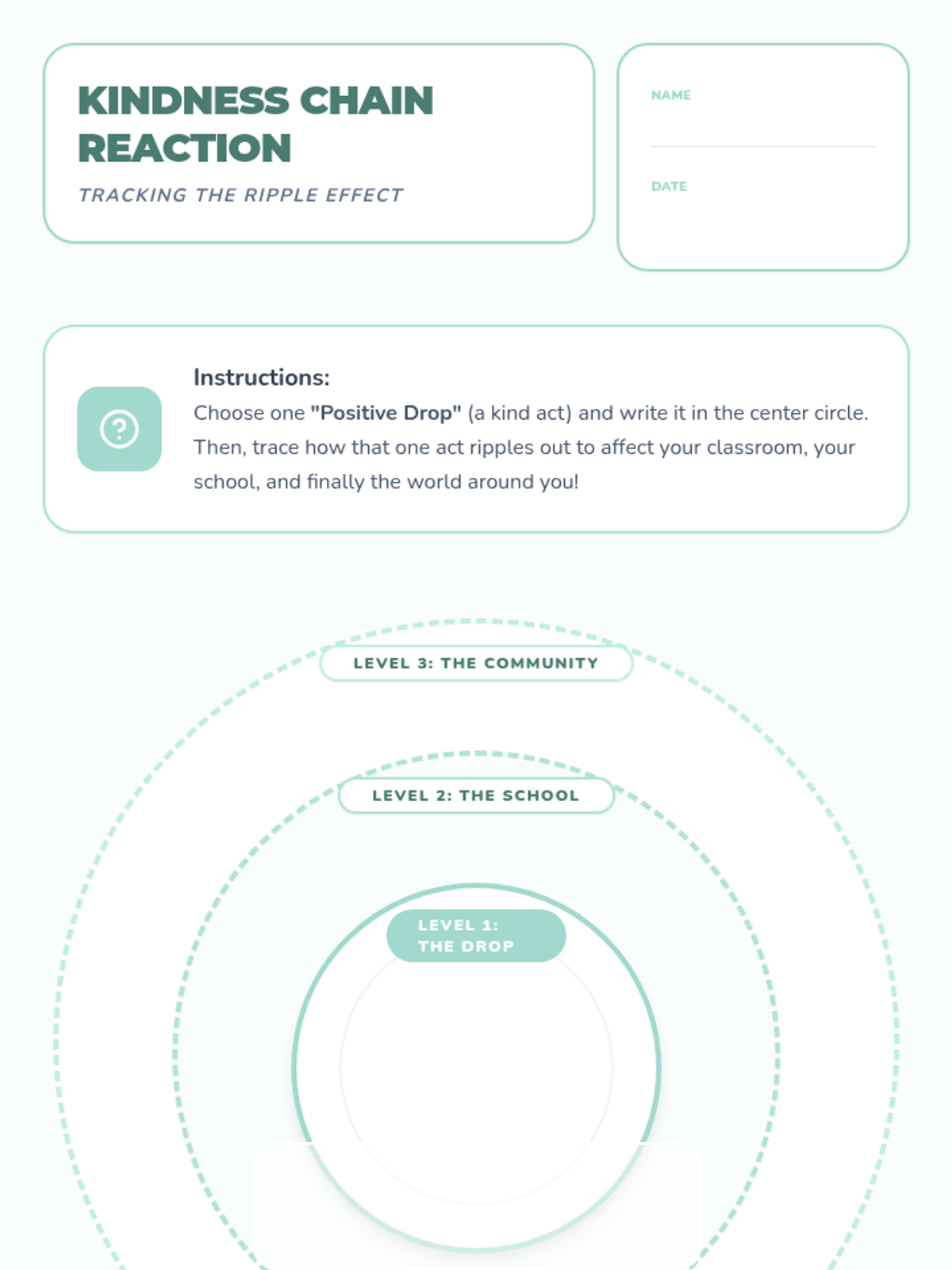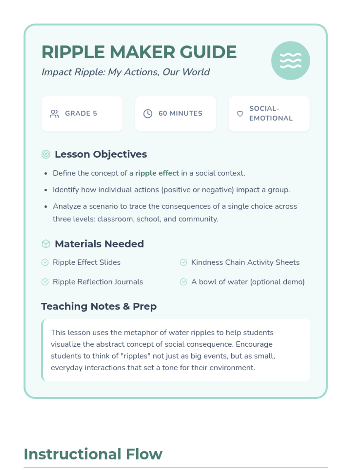This lesson guides 5th graders in understanding the 'ripple effect,' exploring how individual acts of kindness and responsibility impact their classroom, school, and wider community.