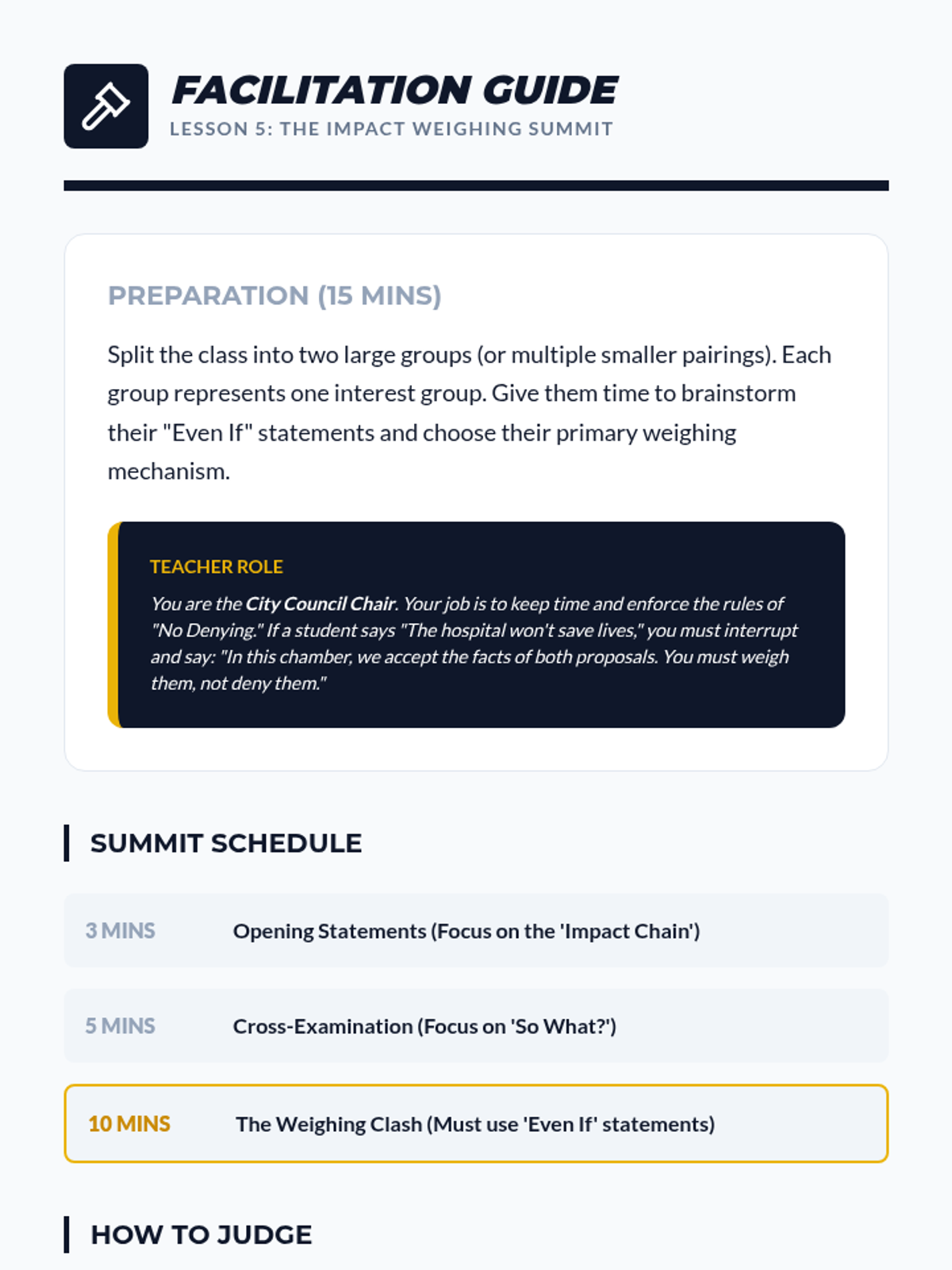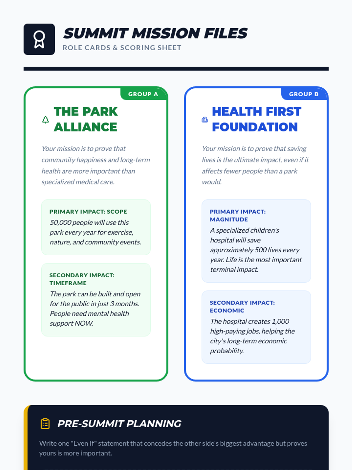 In a role-play simulation, students represent different interest groups and must debate a policy proposal solely by weighing the impacts, not denying the facts.