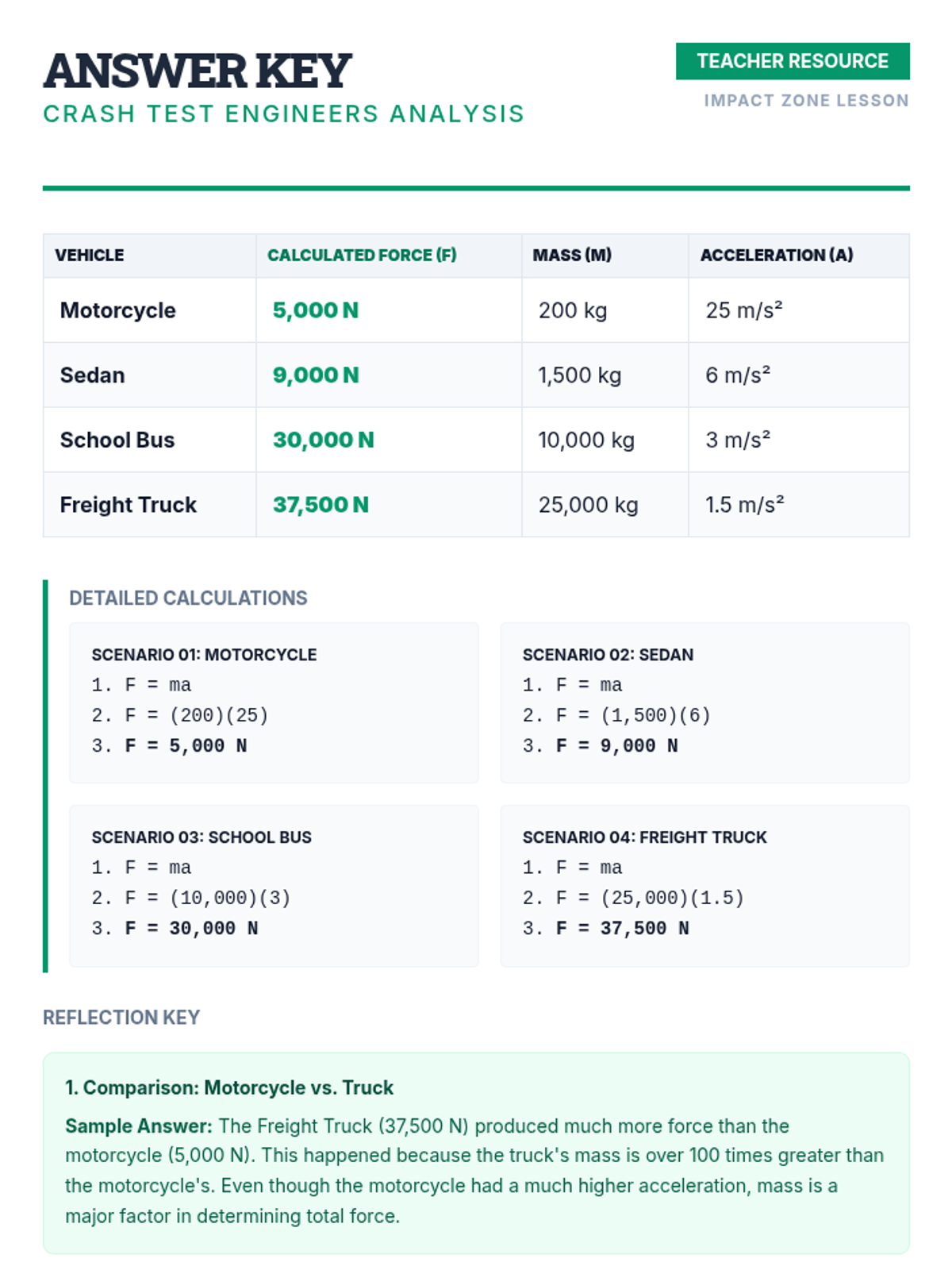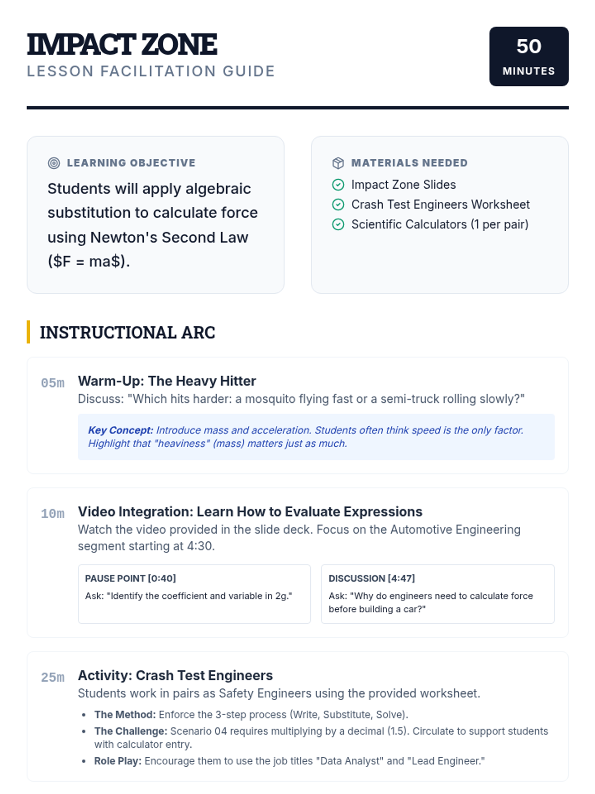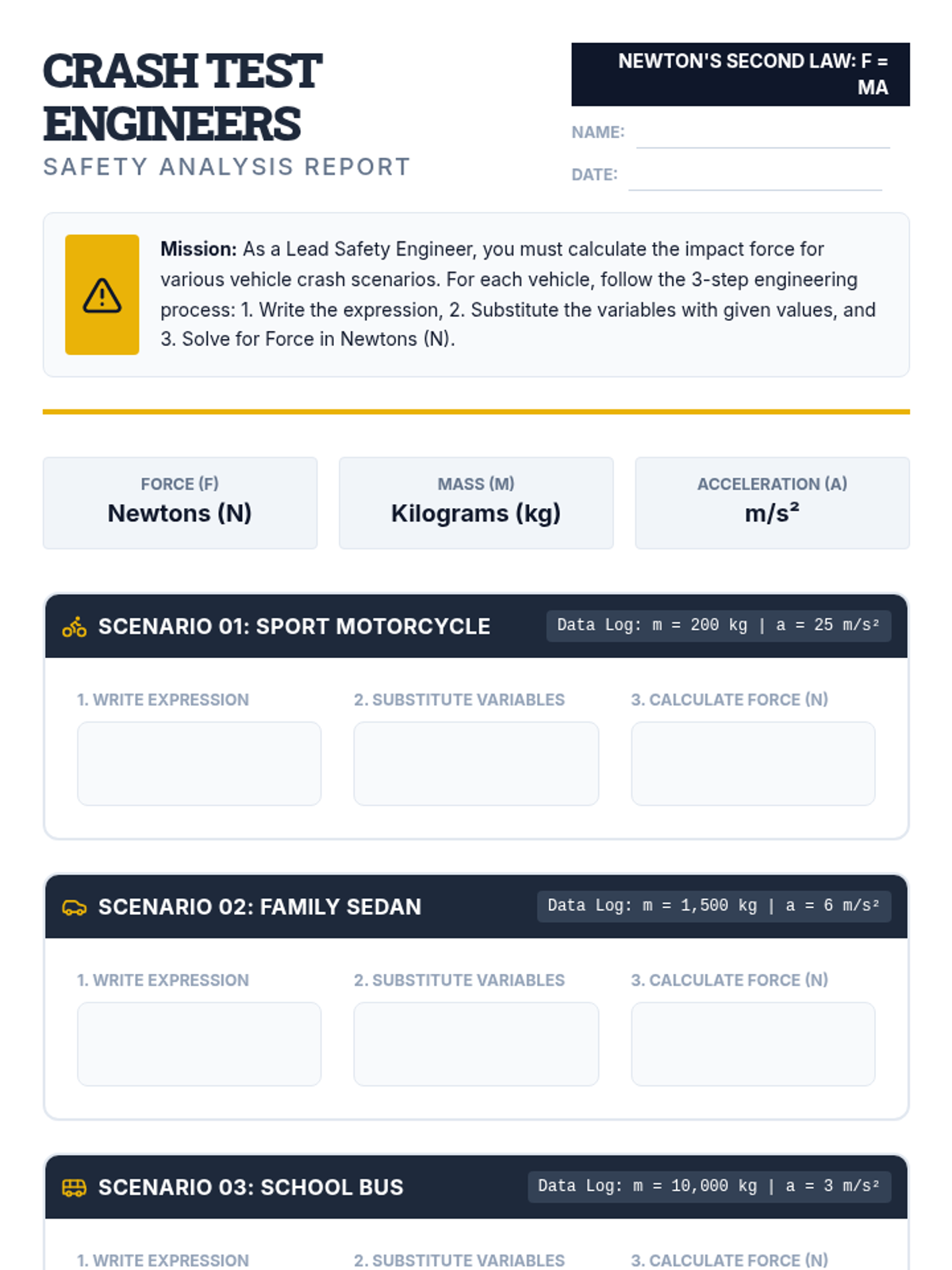 A 7th-grade science and math integration lesson where students use algebraic substitution and Newton's Second Law to calculate force in various vehicle crash scenarios.