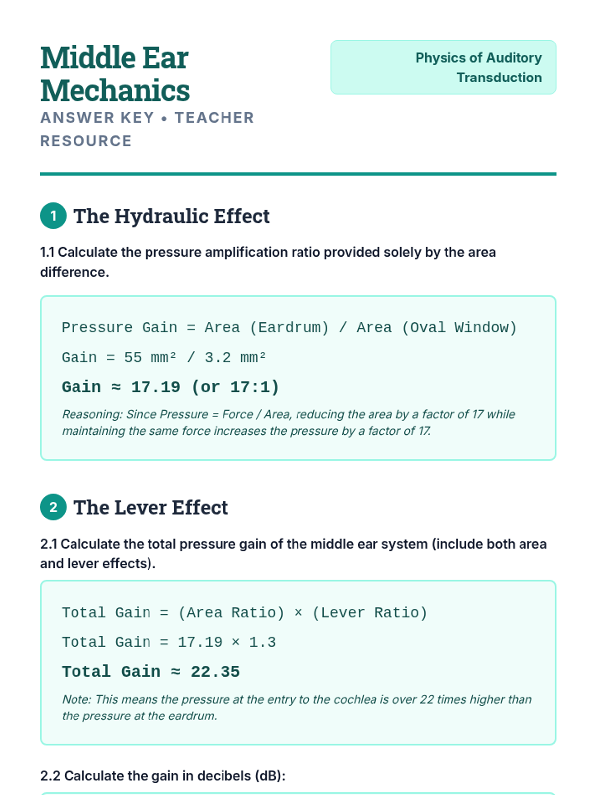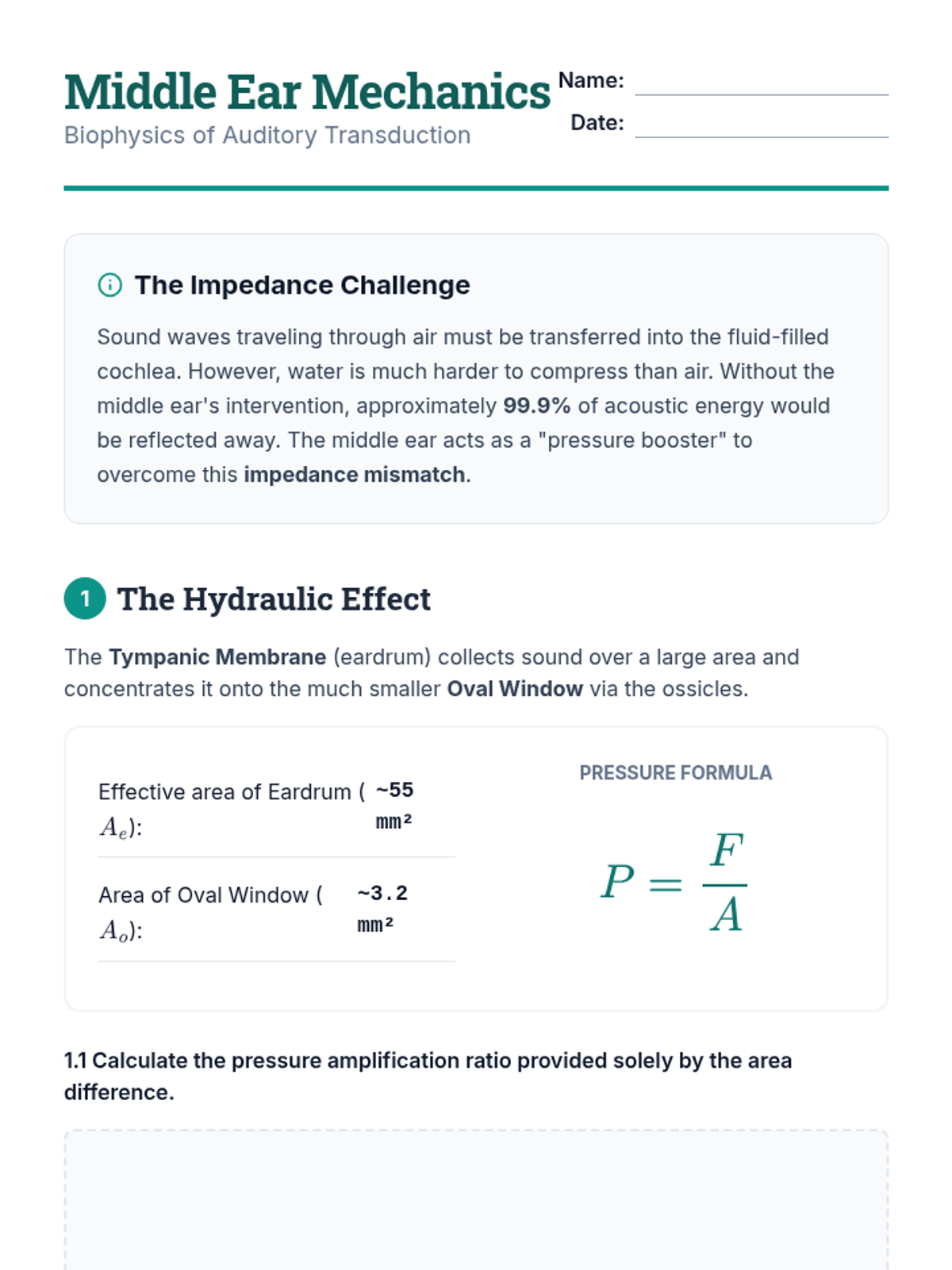 Students explore the physics of the middle ear acting as a lever and hydraulic press to transfer energy from air to fluid. They calculate pressure amplification ratios required to overcome impedance mismatch.