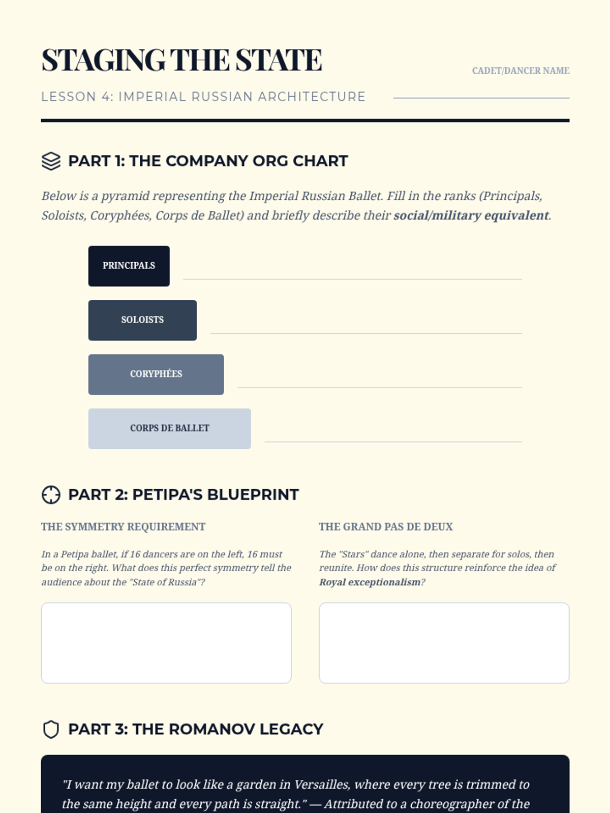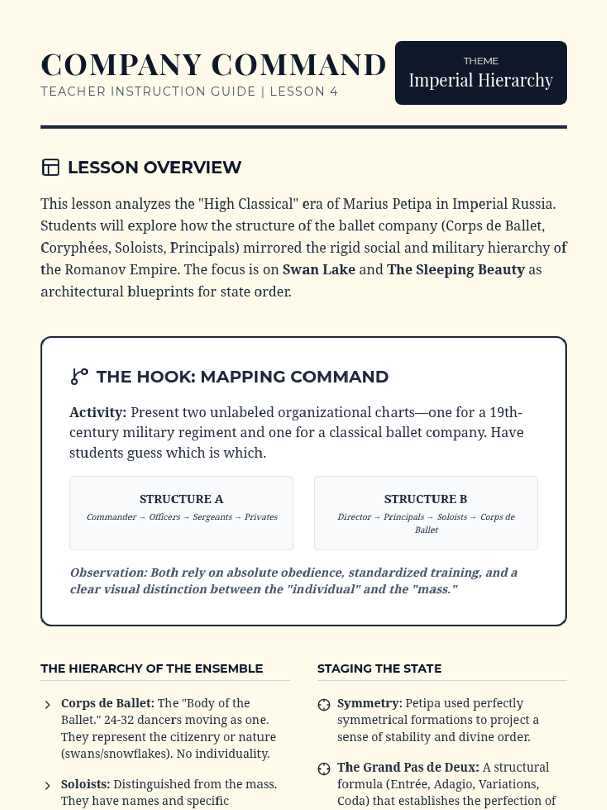 Study the architecture of the Petipa-era Imperial Russian Ballet, analyzing the hierarchical structure of the company as a reflection of military and imperial society.